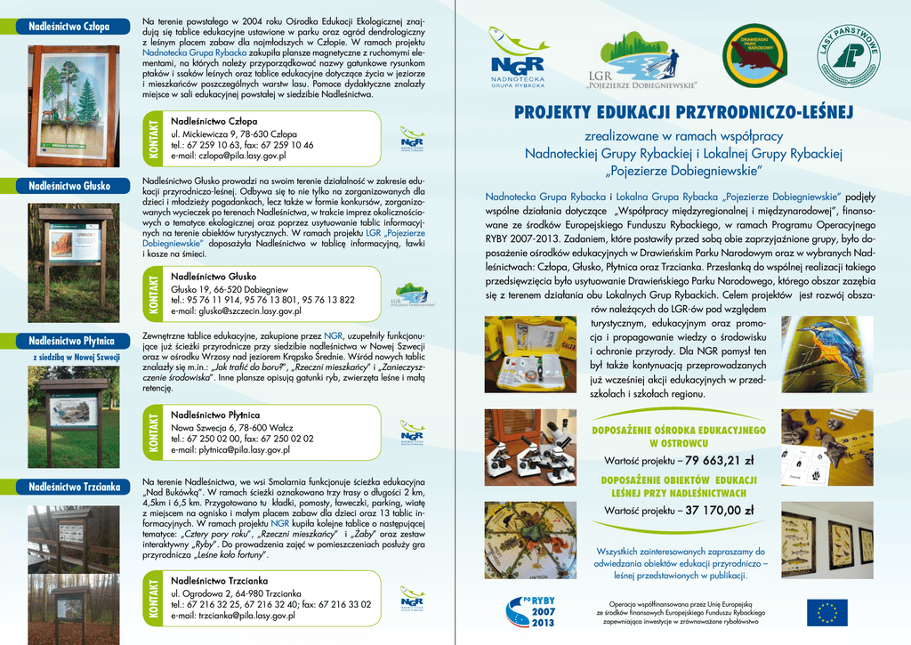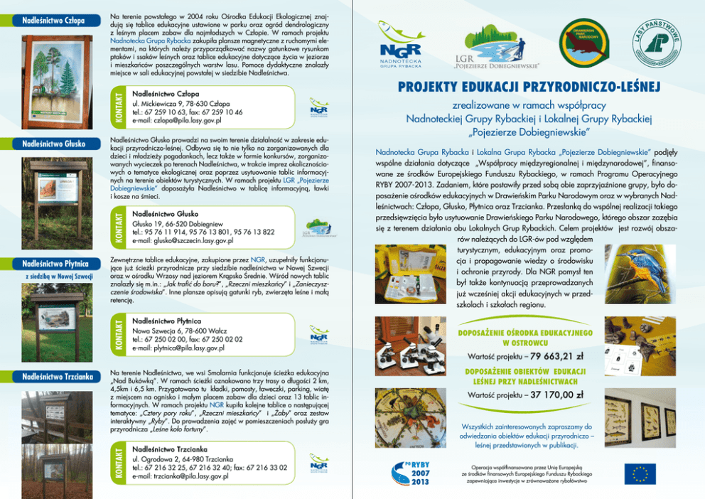 Na terenie powstałego w 2004 roku Ośrodka Edukacji Ekologicznej znajdują się tablice edukacyjne ustawione w parku oraz ogród dendrologiczny z leśnym placem zabaw dla najmłodszych w Człopie. W ramach projektu Nadnotecka Grupa Rybacka zakupiła plansze magnetyczne z ruchomymi elementami, na których należy przyporządkować nazwy gatunkowe rysunkom ptaków i ssaków leśnych oraz tablice edukacyjne dotyczące życia w jeziorze i mieszkańców poszczególnych warstw lasu. Pomoce dydaktyczne znalazły miejsce w sali edukacyjnej powstałej w siedzibie Nadleśnictwa. KONTAKT Nadleśnictwo Człopa Nadleśnictwo Głusko prowadzi na swoim terenie działalność w zakresie edukacji przyrodniczo-leśnej. Odbywa się to nie tylko na zorganizowanych dla dzieci i młodzieży pogadankach, lecz także w formie konkursów, zorganizowanych wycieczek po terenach Nadleśnictwa, w trakcie imprez okolicznościowych o tematyce ekologicznej oraz poprzez usytuowanie tablic informacyjnych na terenie obiektów turystycznych. W ramach projektu LGR „Pojezierze Dobiegniewskie” doposażyła Nadleśnictwo w tablicę informacyjną, ławki i kosze na śmieci. KONTAKT Nadleśnictwo Głusko Nadleśnictwo Płytnica Nadleśnictwo Płytnica Nowa Szwecja 6, 78-600 Wałcz tel.: 67 250 02 00, fax: 67 250 02 02 e-mail: [email protected] Na terenie Nadleśnictwa, we wsi Smolarnia funkcjonuje ścieżka edukacyjna „Nad Bukówką”. W ramach ścieżki oznakowano trzy trasy o długości 2 km, 4,5km i 6,5 km. Przygotowano tu kładki, pomosty, ławeczki, parking, wiatę z miejscem na ognisko i małym placem zabaw dla dzieci oraz 13 tablic informacyjnych. W ramach projektu NGR kupiła kolejne tablice o następującej tematyce: „Cztery pory roku”, „Rzeczni mieszkańcy” i „Żaby” oraz zestaw interaktywny „Ryby”. Do prowadzenia zajęć w pomieszczeniach posłuży gra przyrodnicza „Leśne koło fortuny”. KONTAKT Nadleśnictwo Trzcianka Nadleśnictwo Głusko Głusko 19, 66-520 Dobiegniew tel.: 95 76 11 914, 95 76 13 801, 95 76 13 822 e-mail: [email protected] Zewnętrzne tablice edukacyjne, zakupione przez NGR, uzupełniły funkcjonujące już ścieżki przyrodnicze przy siedzibie nadleśnictwa w Nowej Szwecji oraz w ośrodku Wrzosy nad jeziorem Krąpsko Średnie. Wśród nowych tablic znalazły się m.in.: „Jak trafić do boru?”, „Rzeczni mieszkańcy” i „Zanieczyszczenie środowiska”. Inne plansze opisują gatunki ryb, zwierzęta leśne i małą retencję. KONTAKT z siedzibą w Nowej Szwecji Nadleśnictwo Człopa ul. Mickiewicza 9, 78-630 Człopa tel.: 67 259 10 63, fax: 67 259 10 46 e-mail: [email protected] Nadleśnictwo Trzcianka ul. Ogrodowa 2, 64-980 Trzcianka tel.: 67 216 32 25, 67 216 32 40; fax: 67 216 33 02 e-mail: [email protected] Projekty Edukacji Przyrodniczo-Leśnej zrealizowane w ramach współpracy Nadnoteckiej Grupy Rybackiej i Lokalnej Grupy Rybackiej „Pojezierze Dobiegniewskie” Nadnotecka Grupa Rybacka i Lokalna Grupa Rybacka „Pojezierze Dobiegniewskie” podjęły wspólne działania dotyczące „Współpracy międzyregionalnej i międzynarodowej”, finansowane ze środków Europejskiego Funduszu Rybackiego, w ramach Programu Operacyjnego RYBY 2007-2013. Zadaniem, które postawiły przed sobą obie zaprzyjaźnione grupy, było doposażenie ośrodków edukacyjnych w Drawieńskim Parku Narodowym oraz w wybranych Nadleśnictwach: Człopa, Głusko, Płytnica oraz Trzcianka. Przesłanką do wspólnej realizacji takiego przedsięwzięcia było usytuowanie Drawieńskiego Parku Narodowego, którego obszar zazębia się z terenem działania obu Lokalnych Grup Rybackich. Celem projektów jest rozwój obszarów należących do LGR-ów pod względem turystycznym, edukacyjnym oraz promocja i propagowanie wiedzy o środowisku i ochronie przyrody. Dla NGR pomysł ten był także kontynuacją przeprowadzanych już wcześniej akcji edukacyjnych w przedszkolach i szkołach regionu. DOPOSAŻENIE OŚRODKA EDUKACYJNEGO W OSTROWCU Wartość projektu – 79 663,21 zł DOPOSAŻENIE OBIEKTÓW EDUKACJI LEŚNEJ PRZY NADLEŚNICTWACH Wartość projektu – 37 170,00 zł Wszystkich zainteresowanych zapraszamy do odwiedzania obiektów edukacji przyrodniczo – leśnej przedstawionych w publikacji. Operacja współfinansowana przez Unię Europejską ze środków finansowych Europejskiego Funduszu Rybackiego zapewniająca inwestycje w zrównoważone rybołówstwo Ośrodek edukacyjny DPN w Ostrowcu Drawieński Park Narodowy jest jednym z 23 parków narodowych w Polsce. Utworzony został 1 maja 1990 roku na Pojezierzu Południowopomorskim, w centralnej części Puszczy Drawskiej, na pograniczu trzech województw: zachodniopomorskiego, lubuskiego i wielkopolskiego. Doliny Drawy i Płocicznej, łączących się na terenie DPN, nadają Parkowi charakterystyczny kształt litery V. Powierzchnia Parku wynosi 11 213,85 ha. Herbowym zwierzęciem DPN jest wydra, która znajduje tu bardzo dobre warunki dla swego bytowania. Przeważają tu ekosystemy leśne, spośród których najbardziej cenne są kwaśne i żyzne buczyny. Lasy te najlepiej zachowane są w dolinie rzeki Drawy i na zachód od niej. Wysoką wartością przyrodniczą odznaczają się również inne siedliska leśne: grądy, olsy, łęgi oraz bory i brzeziny bagienne. Jako miejsce realizacji wspólnego pomysłu wybrano placówkę w Ostrowcu (Ostrowitem). Pięknie odrestaurowany budynek o konstrukcji szachulcowej, tworzący wraz z kilkoma innymi obiektami niezwykle malowniczą osadę na leśnej polanie, jest miejscem wprost wymarzonym jako cel wycieczek edukacyjnych. Tutaj właśnie pracownicy DPN prowadzą lekcje przyrody dla grup szkolnych. Po uzgodnieniu z kadrą DPN listy potrzebnych pomocy naukowych, grupy rybackie wyposażyły obiekt w nowy sprzęt. LGR „Pojezierze Dobiegniewskie” zadbała o wyposażenie laboratorium, kupując za kwotę prawie 35 000 zł: 11 mikroskopów, w tym jeden specjalistyczny mikroskop stereoskopowy z systemem cyfro
