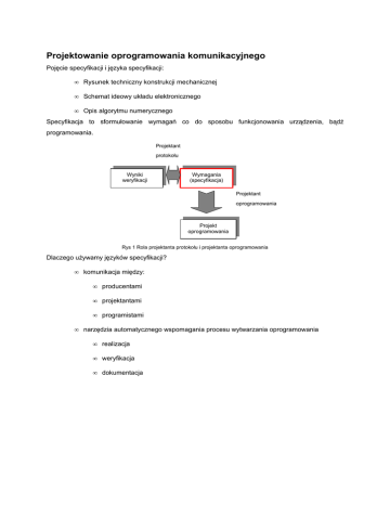 Projektowanie oprogramowania komunikacyjnego Pojęcie specyfikacji i języka specyfikacji: • Rysunek techniczny konstrukcji mechanicznej • Schemat ideowy układu elektronicznego • Opis algorytmu numerycznego Specyfikacja to sformułowanie wymagań co do sposobu funkcjonowania urządzenia, bądź programowania. Projektant protokołu Wyniki weryfikacji Wymagania (specyfikacja) Projektant oprogramowania Projekt oprogramowania Rys 1 Rola projektanta protokołu i projektanta oprogramowania Dlaczego używamy języków specyfikacji? • komunikacja między: • producentami • projektantami • programistami • narzędzia automatycznego wspomagania procesu wytwarzania oprogramowania • realizacja • weryfikacja • dokumentacja Przykłady specyfikacji nieformalnej Protokół kolejowy (Katastrofa kolejowa spowodowana wadliwą konstrukcją protokołu.) Przypadki wypadków kolejowych są zazwyczaj przebadane i udokumentowane z dokładnością do minuty, tak, że ... Pojedynczy przykład powinien wystarczyć do zilustrowania jak ważne katastrofy mogły być wynikiem niespodziewanej wcześniej kombinacji zdarzeń. Wypadku, który będzie dalej opisany, można by było uniknąć gdyby użyto odpowiedniego protokołu do zorganizowania komunikacji między dróżnikami. Wypadek ten zdarzył się w tunelu Clayton, który wydawał się być najlepiej chronionym szlakiem kolejowym w Anglii. Na każdym końcu tunelu o długości ponad 2 km, przez 24 godziny na dobę, pełnili służbę dróżnicy. Dodatkowo w roku 1841 tunel wyposażono w nowy system sygnalizacji. Zbudowany on był z semaforów na każdym końcu tunelu. System działał w ten sposób, że każdy pociąg mijający semafor zezwalający na wjazd do tunelu zmieniał jego położenie na sygnał zakazujący wjazdu do tunelu. Obowiązkiem dróżnika było ponowne ustawienie semafora na pozycję zezwalającą na wjazd. Dróżnik ten zanim zmienił ustawienie semafora miał obowiązek upewnić się, że pociąg, który wjeżdżał do tunelu opuścił go. W celu usprawnienia pracy dróżników tunel wyposażonow telegraf igłowy. System ten dobudowano by możliwość wymianę między dróżnikami kilku wcześniej zdefiniowanych komunikatów. Po udzieleniu zgody na wjazd pociągu do tunelu dróżnik nadawał wiadomość pociąg w tunelu do dróżnika na drugim końcu tunelu. Gdy pociąg wyjeżdżał z tunelu dróżnik wysyłał wiadomość tunel pusty . Po otrzymaniuy tego sygnału pierwszy dróżnik mógł ustawić semafor tak by umożliwić wjazd następnego pociągu. Aby system uczynić całkowicie pewnym, dodano trzeci komunikat: czy pociąg wyjechał z tunelu? Obecność dwóch dróżników gwarantowała, że tunel można było bezpiecznie używać nawet wtedy, gdy z jakiś powodów, semafory zadziałałyby niewłaściwie. Jeśli pociąg wjeżdżał do tunelu przy braku prawa wjeżdżania, dróżnik był o tym informowany za pomocą dzwonka. W takim przypadku dróżnik mógł za pomocą białej i czerwonej flagi sterować ruchem. Jednak okazało się,że protokół nie był wystarczająco dobrze opisany. Oto co się zdarzyło w sierpniu 1861 roku. • Pierwszy pociąg przejechał semafor i nie zmienił położenia semafora. Zgodnie z przewidywaniami dzwonek ostrzegł dróżnika. Zgodnie z procedurą drźżnik najpierw wysłał do dróżnika z drugiej strony tunelu wiadomość pociąg w tunelu i następnie ustawił czerwoną flagę tak by zatrzymać następny pociąg. • Niestety drugi pociąg nadjechał szybciej niż się spodziewał dróżnik i wjechał do tunelu zanim dróżnik ustawił czerwoną flagę. Iok_2 2 Protokół InRes Zaczerpnięty z Hogrefe D.:Estelle, LOTOS und SDL, Springer Verlag W przykładzie będą opisane dwie usługi i jeden protokół: • usługa Medium, realizująca zawodne przesyłanie danych, • protokół InRes, wykorzystujący usługę Medium, by zaoferować niezawodną usługę zorientowaną połączeniowo, • usługa InRes, oferowana w oparciu o protokół InRes i usługę Medium. Opisane usługi i protokół służą wyłącznie do ilustracji i nie można ich przypisywać żadnej z konkretnych warstw modelu OSI. Obie usługi oraz protokół są opisane werbalnie, bądź semiformalnie (harmonogramy). Rysunek 2 ilustruje strukturę przykładu. Użytkownik usługi Użytkownik usługi Elementy usługi InRes Elementy usługi InRes Usługa InRes Stacja protokołu InRes Stacja protokołu InRes Protokół InRes Elementy usługi Medium Elementy usługi Medium Usługa Medium Rys. 2 Struktura przykładu W opisie wykorzystano następujące oznaczenia: • SP - element usługi, • SAP - punkt dostępu do usług, • SDU - jednostka danych usługi. Jeśli którekolwiek z tych pojęć jest związane z usługą Medium, to jego oznaczenie poprzedza przedrostek M i tak MSDU oznacza jednostkę danych usługi Medium. Podobnie będzie dla protokołu InRes, gdzie zastosowano przedrostek I. Kolejność następnych punktów odpowiada kolejności opisywania zalecanej przy projektowaniu protokołów: najpierw rozważana jest usługa, która będzie oferowana przez protokół. Następnie rozważana jest usługa niezbędna do zaprojektowania protokołu, tak by korzystając z tej usługi mógł on oferować pożądaną usługę. Usługa InRes Przedstawiona usługa jest uproszczoną wersją usługi ABRACADABRA. Usługa ta jest zorientowama połączeniowo. Oznacza to, że użytkownik A, który chciałby skomunikować się z użytkownikiem B za pośrednictwem tej usługi musi najpierw nawiązać połączenie, zanim zacznie wymieniać dane. Rysunek 3 przedstawia schematycznie usługi z ich elementami i punktami dostępu do usług. Iok_2 3 Użytkownik A Odbiorca Użytkownik A Inicjator ISAPini ICONreq ICONconf IDATreq IDISind ICONind ICONresp IDATind IDISreq ISAPodb Usługa InRes Rys. 3 Usługa InRes Przyjęto, że usługa jest: • asymetryczna i • usługodawca posiada dwa SAPy. Przez pierwszy SAP użytkownik A inicjuje połączen