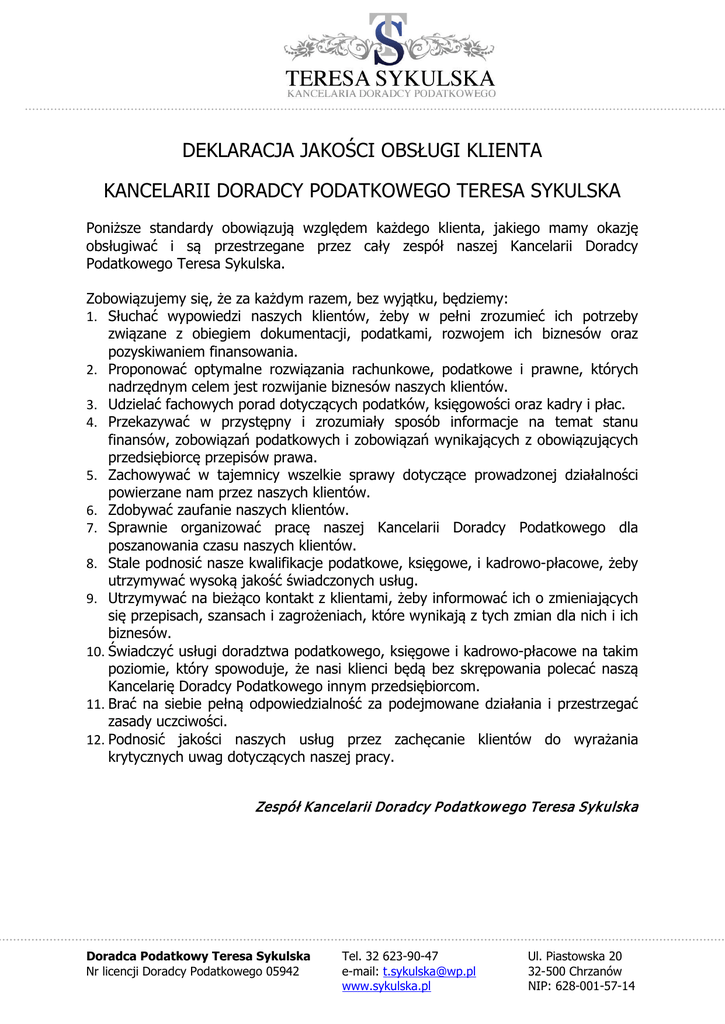 DEKLARACJA JAKOŚCI OBSŁUGI KLIENTA KANCELARII DORADCY PODATKOWEGO TERESA SYKULSKA Poniższe standardy obowiązują względem każdego klienta, jakiego mamy okazję obsługiwać i są przestrzegane przez cały zespół naszej Kancelarii Doradcy Podatkowego Teresa Sykulska. Zobowiązujemy się, że za każdym razem, bez wyjątku, będziemy: 1. Słuchać wypowiedzi naszych klientów, żeby w pełni zrozumieć ich potrzeby związane z obiegiem dokumentacji, podatkami, rozwojem ich biznesów oraz pozyskiwaniem finansowania. 2. Proponować optymalne rozwiązania rachunkowe, podatkowe i prawne, których nadrzędnym celem jest rozwijanie biznesów naszych klientów. 3. Udzielać fachowych porad dotyczących podatków, księgowości oraz kadry i płac. 4. Przekazywać w przystępny i zrozumiały sposób informacje na temat stanu finansów, zobowiązań podatkowych i zobowiązań wynikających z obowiązujących przedsiębiorcę przepisów prawa. 5. Zachowywać w tajemnicy wszelkie sprawy dotyczące prowadzonej działalności powierzane nam przez naszych klientów. 6. Zdobywać zaufanie naszych klientów. 7. Sprawnie organizować pracę naszej Kancelarii Doradcy Podatkowego dla poszanowania czasu naszych klientów. 8. Stale podnosić nasze kwalifikacje podatkowe, księgowe, i kadrowo-płacowe, żeby utrzymywać wysoką jakość świadczonych usług. 9. Utrzymywać na bieżąco kontakt z klientami, żeby informować ich o zmieniających się przepisach, szansach i zagrożeniach, które wynikają z tych zmian dla nich i ich biznesów. 10. Świadczyć usługi doradztwa podatkowego, księgowe i kadrowo-płacowe na takim poziomie, który spowoduje, że nasi klienci będą bez skrępowania polecać naszą Kancelarię Doradcy Podatkowego innym przedsiębiorcom. 11. Brać na siebie pełną odpowiedzialność za podejmowane działania i przestrzegać zasady uczciwości. 12. Podnosić jakości naszych usług przez zachęcanie klientów do wyrażania krytycznych uwag dotyczących naszej pracy. Zespół K ancelarii Doradcy Podatkow ego Teresa Sykulska Doradca Podatkowy Teresa Sykulska Nr licencji Doradcy Podatkowego 05942 Tel. 32 623-90-47 e-mail: [email protected] www.sykulska.pl Ul. Piastowska 20 32-500 Chrzanów NIP: 628-001-57-14