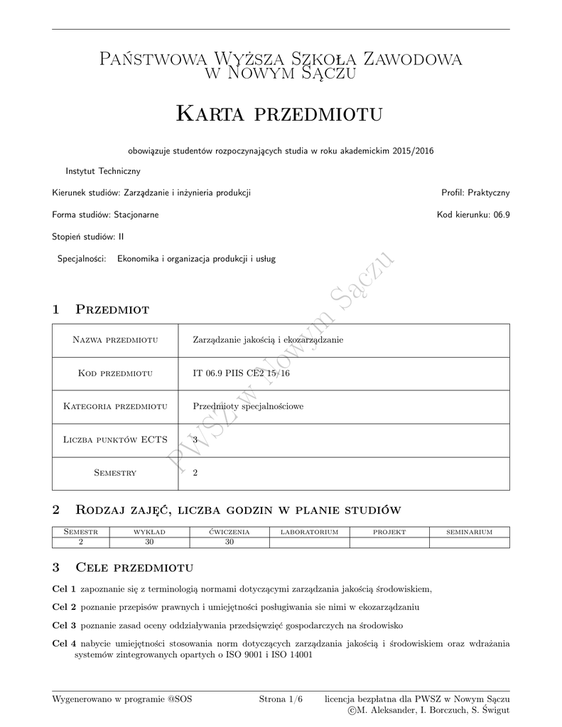 Państwowa Wyższa Szkola Zawodowa w Nowym Sa˛czu Karta przedmiotu obowia˛zuje studentów rozpoczynaja˛cych studia w roku akademickim 2015/2016 Instytut Techniczny Kierunek studiów: Zarza˛dzanie i inżynieria produkcji Profil: Praktyczny Forma studiów: Stacjonarne Kod kierunku: 06.9 Stopień studiów: II Przedmiot Nazwa przedmiotu w 2 Rodzaj zaje˛ć, liczba godzin w planie studiów Semestr 2 3 3 PW Liczba punktów ECTS Przedmioty specjalnościowe SZ Kategoria przedmiotu 2 Zarza˛dzanie jakościa˛ i ekozarza˛dzanie IT 06.9 PIIS CE2 15/16 Kod przedmiotu Semestry No wy m 1 Ekonomika i organizacja produkcji i uslug Sa˛ cz u Specjalności: wyklad 30 ćwiczenia 30 laboratorium projekt seminarium Cele przedmiotu Cel 1 zapoznanie sie˛ z terminologia˛ normami dotycza˛cymi zarza˛dzania jakościa˛ środowiskiem, Cel 2 poznanie przepisów prawnych i umieje˛tności poslugiwania sie nimi w ekozarza˛dzaniu Cel 3 poznanie zasad oceny oddzialywania przedsie˛wzie˛ć gospodarczych na środowisko Cel 4 nabycie umieje˛tności stosowania norm dotycza˛cych zarza˛dzania jakościa˛ i środowiskiem oraz wdrażania systemów zintegrowanych opartych o ISO 9001 i ISO 14001 Wygenerowano w programie @SOS Strona 1/6 licencja bezplatna dla PWSZ w Nowym Sa˛czu c M. Aleksander, I. Borczuch, S. Świgut Państwowa Wyższa Szkola Zawodowa w Nowym Sa˛czu 4 Wymagania wste˛pne w zakresie wiedzy, umieje˛tności i innych kompetencji a Znajomość podstaw teorii zarza˛dzania Efekty ksztalcenia 5 EK1 Wiedza: Student posiada wiedze˛ w zakresie terminologii z zakresu zarza˛dzania jakościa˛ i ochrony środowiska oraz tworzenia i funkcjonowania podmiotów gospodarczych. EK2 Wiedza: Student posiada wiedze˛ z zakresu zarza˛dzania jakościa˛ i ekozarza˛dzania w tym polityki ekologicznej kraju oraz potrafi pola˛czyć je z innymi dyscyplinami. EK3 Umieje˛tności: Student posiada umieje˛tności w zakresie oceny i opracowania systemu zarza˛dzania jakościa˛ i zarza˛dzania środowiskowego w tym systemu zintegrowanego. 6 Treści programowe W3 W4 W5 W6 Lp C1 C2 No wy w W2 SZ W1 Tematyka zaje˛ć Opis szczególowy bloków tematycznych Poje˛cia podstawowe w zakresie zarza˛dzania i ekorozwoju, historia i istota jakości, filozofia jakości Deminga, znaczenie zarza˛dzania jakościa˛, podejście procesowe Koncepcja jakości totalnej - TQM, warunki powstania i rozwoju tej koncepcji - wplyw zmian ekonomicznych, politycznych, socjologicznych, zmiany w zakresie technologii i warunków pracy, ewolucja rynku, ewolucja strukturalna przedsie˛biorstw. Droga od Tylora do przesie˛biorstwa nowoczesnego, ewolucja relacji mie˛dzyludzkich waloryzacja i motywacja pracownika w systemie zarza˛dzania jakościa˛. Zarza˛dzania przez jakość 8 zasad TQM, rola kierownictwa Uwarunkowania prawne krajowe i UE w ochronie środowiska, polityka i programy środowiskowe, wskaźniki ekorozwoju Gospodarka odpadami i ochrona gruntów, jakość wody i oczyszczanie ścieków, technologie BAT, oceny oddzialywania na srodowisko Wdrażanie systemów zarza˛dzania jakościa˛, środowiskiem i bezpieczeństwem. Standardy systemów zara˛dzania - normy serii ISO 9000, ISO 14000, ISO 18000, ISO 22000. Systemy zintegrowane - specyfikacja PAS 99. Zasady opracowania dokumentacji systemowej, ksie˛ga jakości, procedury, mapa procesów. Audit systemu. Certyfikacja systemów - organizacje certyfikujace. Przyklady technologii proekologicznych w ochronie środowiska Razem PW Lp m wyklad Sa˛ cz u EK4 Kompetencje spoleczne: Student ma przygotowanie do przestrzegania i propagowania etycznej postawy i wrażliwości spolecznej w zakresie zrównoważonego rozwoju i systemów jakości oraz ich stosowania w praktyce inżynierii produkcji ćwiczenia Tematyka zaje˛ć Opis szczególowy bloków tematycznych Rozwinie˛cie podstawowych poje˛ć z zakresu zarza˛dzania jakościa˛, i środowiskiem. Struktura i formy prawne organizacji dzialalności gospodarczej. Zaprezentowanie zalożeń do opracowania zespolowego - systemu zintegrowanego - podzial na zespoly Prezentacja zespolowa przyje˛tej organizacji na przykladzie której opracowany be˛dzie system zintegrowany. Wygenerowano w programie @SOS Strona 2/6 Liczba godzin 6 6 4 4 6 4 30 Liczba godzin 4 6 licencja bezplatna dla PWSZ w Nowym Sa˛czu c M. Aleksander, I. Borczuch, S. Świgut Państwowa Wyższa Szkola Zawodowa w Nowym Sa˛czu Lp C3 C4 C5 7 ćwiczenia Tematyka zaje˛ć Opis szczególowy bloków tematycznych Opracowanie dokumentacji zintegrowanego systemu zarza˛dzania dla wybranej organizacji - ksie˛ga jakości, procedury, instrukcje - prezentacje zespolowe zaplanowanie i przeprowadzenie auditu (zewne˛trznego firmy) dla ocenianej organizacji - firmy. Raport uwzgle˛dniaja˛cy wyniki auditu- prezentacja zespolowa Końcowa prezentacja zespolowa opracowanego systemu zintegrowanego Razem Liczba godzin 12 4 4 30 Metody dydaktyczne M1 Wyklady Sa˛ cz u M2 Prezentacje multimedialne M3 Praca w grupach Obcia˛żenie praca˛ studenta No wy 8 m M4 Dyskusja Forma aktywności Średnia liczba godzin na zrealizowanie aktywności PW SZ w Godziny kontaktowe z nauczycielem akademickim, w tym: Godziny wynikaja˛ce z planu studiów 60 Konsultacje przedmiotowe 5 Egzaminy i zaliczenia w sesji 5 Godziny bez udzialu nauczyciela akademickiego wynikaja˛ce z nakladu pracy studenta, w tym: Przygotowanie sie˛ do zaje˛ć, w tym studiowanie zalecanej literatury 3 Opracowanie wyników 0 Przygotowanie raportu, projektu, prezentacji, dyskusji 2 Sumaryczna liczba godzin dla przedmiotu wynikaja˛ca z 75 calego nakladu pracy studenta Sumaryczna liczba punktów ECTS dla przedmiotu 3 9 Sposoby oceny Ocena formuja˛ca F1 Projekt zespolowy F2 Odpowiedź ustna Kryteria oceny Efekt ksztalcenia 1 Wygenerowano w programie @SOS Miejsce weryfikacji Strona 3/6 Opis weryfikacji EK 1 licencja bezplatna dla PWSZ w Nowym Sa˛czu c M. Aleksander, I. Borczuch, S. Świgut Państwowa Wyższa Szkola Zawodowa w Nowym Sa˛czu Na ocene˛ 3 Na ocene˛ 4 