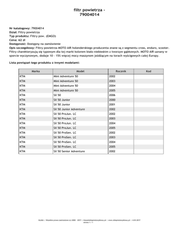 filtr powietrza 79004014 Nr katalogowy: 79004014 Dział: Filtry powietrza Typ produktu: Filtry pow. (EMGO) Cena: 62 zł Dostępność: Dostępny na zamówienie Opis szczegółowy: Filtry powietrza MOTO AIR holenderskiego producenta znane są z segmentu cross, enduro, scooter. Filtry charekteryzują się typowym dla tej marki kolorem biało niebieskim z tworzyw gąbkowych. MOTO AIR uznany w sporcie wyczynowym, dodaje 10 - 15% więcej mocy maszynom jeżdżącym na torach wyścigowych całej Europy. Lista powiązań tego produktu z innymi modelami: Marka Model Rocznik KTM Mini Adventure 50 2002 KTM Mini Adventure 50 2003 KTM Mini Adventure 50 2004 KTM Mini Adventure 50 2005 KTM SX 50 2006 KTM SX 50 Junior 2000 KTM SX 50 Junior 2001 KTM SX 50 Junior Adventure 2002 KTM SX 50 ProJun. LC 2002 KTM SX 50 ProJun. LC 2003 KTM SX 50 ProJun. LC 2004 KTM SX 50 ProJun. LC 2005 KTM SX 50 ProSen. LC 2002 KTM SX 50 ProSen. LC 2003 KTM SX 50 ProSen. LC 2004 KTM SX 50 ProSen. LC 2005 KTM SX 50 Senior Adventure 2002 KLASA :: Wszelkie prawa zastrzeżone (c) 2002 - 2017 :: [email protected] :: www.sklepmotocyklowy.pl :: 4.03.2017 strona 1 / 1 Kod