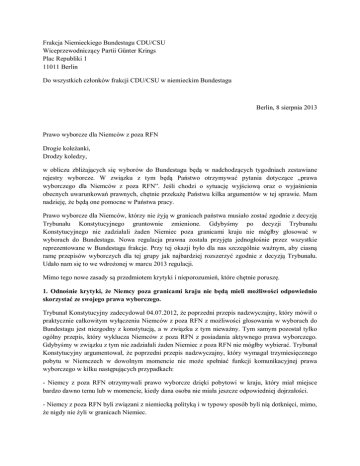 Frakcja Niemieckiego Bundestagu CDU/CSU Wiceprzewodniczący Partii Günter Krings Plac Republiki 1 11011 Berlin Do wszystkich członków frakcji CDU/CSU w niemieckim Bundestagu Berlin, 8 sierpnia 2013 Prawo wyborcze dla Niemców z poza RFN Drogie koleżanki, Drodzy koledzy, w obliczu zbliżających się wyborów do Bundestagu będą w nadchodzących tygodniach zestawiane rejestry wyborcze. W związku z tym będą Państwo otrzymywać pytania dotyczące „prawa wyborczego dla Niemców z poza RFN”. Jeśli chodzi o sytuację wyjściową oraz o wyjaśnienia obecnych uwarunkowań prawnych, chętnie przekażę Państwu kilka argumentów w tej sprawie. Mam nadzieję, że będą one pomocne w Państwa pracy. Prawo wyborcze dla Niemców, którzy nie żyją w granicach państwa musiało zostać zgodnie z decyzją Trybunału Konstytucyjnego gruntownie zmienione. Gdybyśmy po decyzji Trybunału Konstytucyjnego nie zadziałali żaden Niemiec poza granicami kraju nie mógłby głosować w wyborach do Bundestagu. Nowa regulacja prawna została przyjęta jednogłośnie przez wszystkie reprezentowane w Bundestagu frakcje. Przy tej okazji było dla nas szczególnie ważnym, aby ciasną ramę przepisów wyborczych dla tej grupy jak najbardziej rozszerzyć zgodnie z decyzją Trybunału. Udało nam się to we wdrożonej w marcu 2013 regulacji. Mimo tego nowe zasady są przedmiotem krytyki i nieporozumień, które chętnie poruszę. 1. Odnośnie krytyki, że Niemcy poza granicami kraju nie będą mieli możliwości odpowiednio skorzystać ze swojego prawa wyborczego. Trybunał Konstytucyjny zadecydował 04.07.2012, że poprzedni przepis nadzwyczajny, który mówił o praktycznie całkowitym wyłączeniu Niemców z poza RFN z możliwości głosowania w wyborach do Bundestagu jest niezgodny z konstytucją, a w związku z tym nieważny. Tym samym pozostał tylko ogólny przepis, który wyklucza Niemców z poza RFN z posiadania aktywnego prawa wyborczego. Gdybyśmy w związku z tym nie zadziałali żaden Niemiec z poza RFN nie mógłby wybierać. Trybunał Konstytucyjny argumentował, że poprzedni przepis nadzwyczajny, który wymagał trzymiesięcznego pobytu w Niemczech w dowolnym momencie nie może spełniać funkcji komunikacyjnej prawa wyborczego w kilku następujących przypadkach: - Niemcy z poza RFN otrzymywali prawo wyborcze dzięki pobytowi w kraju, który miał miejsce bardzo dawno temu lub w momencie, kiedy dana osoba nie miała jeszcze odpowiedniej dojrzałości. - Niemcy z poza RFN byli związani z niemiecką polityką i w typowy sposób byli nią dotknięci, mimo, że nigdy nie żyli w granicach Niemiec. - Z tego powodu Trybunał Konstytucyjny zadecydował, że związanie prawa wyborczego dla Niemców z poza RFN z wcześniejszym trzymiesięcznym pobytem jest sprzeczne z podstawowym prawem powszechności wyborów. W związku z tym Trybunał złamał swoje poprzednie przepisy prawa wyborczego. Ważnym jest więc, aby podkreślić, że bez działania Bundestagu żaden Niemiec z poza RFN nie mógłby wybierać. Trybunał podał także bardzo dokładnie nowe ramowe rozwiązanie w prawie wyborczym. 2. Aby zapewnić Niemcom z poza RFN możliwe szerokie prawo wyborcze maksymalnie wykorzystaliśmy ramowe rozwiązanie podane przez Trybunał Konstytucyjny, Niemcy z poza RFN są według nowego rozwiązania uprawnieni do głosowania, jeśli: - Po ukończeniu 14 roku życia żyli co najmniej 3 miesiące bez przerwy w Niemczech a ten pobyt nie jest odległy o więcej niż 25 lat lub - Z innych powodów są osobiście i bezpośrednio związani oraz dotknięci polityczną sytuacją w Niemczech. W przypadku drugiego wariantu mogą to być (według §12 akapit 2 Numer 2 Federalnego Prawa Wyborczego) pracownicy niemieckich placówek reprezentacyjnych posiadający niemieckie obywatelstwo, niemieccy pracownicy Instytutów Goethego, pracownicy niemieckich szkół poza granicami kraju, biur zagranicznych politycznych fundacji, pracownicy niemieckiej współpracy rozwojowej, zagranicznych izb handlowych czy korespondenci niemieckich mediów. Ponadto to mogą to być pracownicy, którzy mieszkają poza granicami Niemiec, lecz pracują lub świadczą usługi na terenie Republiki Federalnej. Również nowa regulacja obejmuje tych Niemców poza granicami kraju, którzy biorą udział w politycznym i społecznym życiu w Niemczech poprzez aktywność w związkach, partiach lub innych organizacjach. W praktyce będą miały miejsce także inne konstelacje, w których konkretne sytuacje pojedynczych przypadków będą oceniane przez miejscowe urzędy. 3. Co trzeba zrobić, jako Niemiec poza granicami kraju, aby wziąć udział w wyborach? Aby skorzystać prawa wyborczego dla uprawnionych Niemców poza granicami kraju wciąż obowiązują znane procedury: Niemcy, którzy żyją poza granicami kraju i nie są zameldowani w Niemczech muszą złożyć wniosek oraz deklarację pod przysięgą. Tylko wtedy mogą zostać wpisani do rejestru wyborców danej gminy wniosek musi zostać złożony w tej gminie, w której dana osoba była wcześniej zameldowana. Niemcy, który nigdy nie byli zameldowani muszą złożyć swój wniosek w gminie, do której czują wyjątkowe przywiązanie i w przypadku, której są związani najmocniej, jeśli chodzi o polityczną sytuację. Wniosek musi znaleźć się w gminie najpóźniej do 01.09.2013. Szczegóły oraz formularze wniosków można znaleźć na www.bundeswahlleiter.de w rubryce „Informacje dla Niemców poza granicami”. 4. Odnośnie wielokrotnego żądania, aby znieść wszelkie ograniczenia prawa wyborczego dla Niemców w poza RFN Gdyby spełnić te żądania (wyłączając ustalenia Trybunału Konstytucyjnego, jeśli chodzi o ww. decyzję) następujące przypadki spotkałby się z częściowo dużymi praktycznymi problemami: - Oznaczałoby to odejście od poprzedniego wartościowania, które oprócz niemieckiego obywatelstwa do nabycia prawa wyborczego zakładało podstawową dozę przy