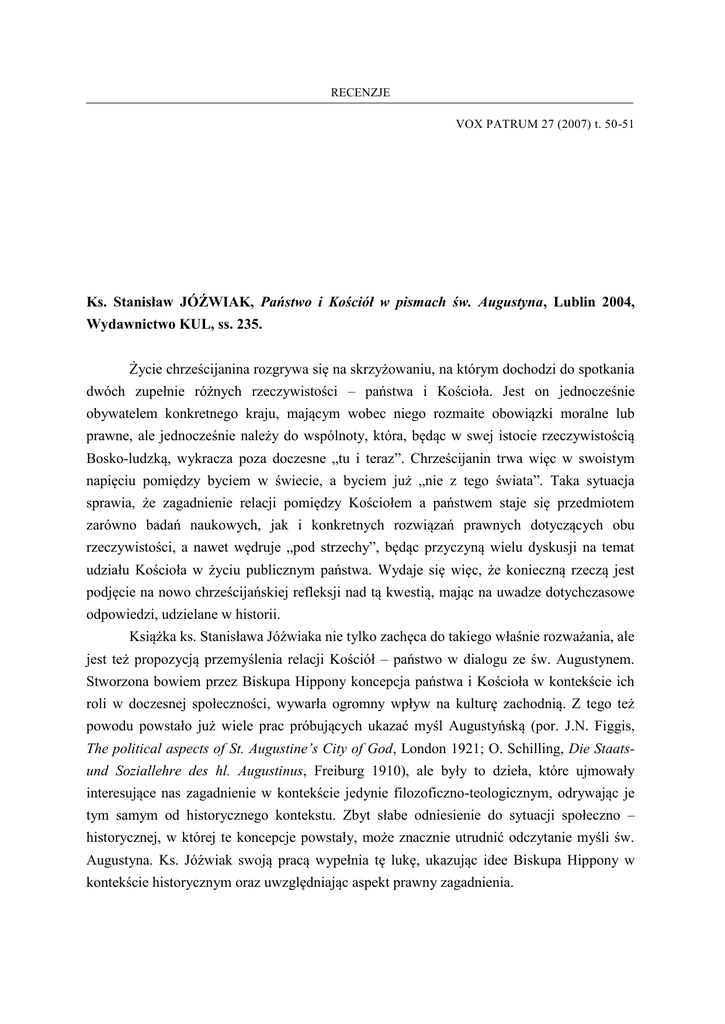 RECENZJE VOX PATRUM 27 (2007) t. 50-51 Ks. Stanisław JÓŹWIAK, Państwo i Kościół w pismach św. Augustyna, Lublin 2004, Wydawnictwo KUL, ss. 235. Życie chrześcijanina rozgrywa się na skrzyżowaniu, na którym dochodzi do spotkania dwóch zupełnie różnych rzeczywistości – państwa i Kościoła. Jest on jednocześnie obywatelem konkretnego kraju, mającym wobec niego rozmaite obowiązki moralne lub prawne, ale jednocześnie należy do wspólnoty, która, będąc w swej istocie rzeczywistością Bosko-ludzką, wykracza poza doczesne „tu i teraz”. Chrześcijanin trwa więc w swoistym napięciu pomiędzy byciem w świecie, a byciem już „nie z tego świata”. Taka sytuacja sprawia, że zagadnienie relacji pomiędzy Kościołem a państwem staje się przedmiotem zarówno badań naukowych, jak i konkretnych rozwiązań prawnych dotyczących obu rzeczywistości, a nawet wędruje „pod strzechy”, będąc przyczyną wielu dyskusji na temat udziału Kościoła w życiu publicznym państwa. Wydaje się więc, że konieczną rzeczą jest podjęcie na nowo chrześcijańskiej refleksji nad tą kwestią, mając na uwadze dotychczasowe odpowiedzi, udzielane w historii. Książka ks. Stanisława Jóźwiaka nie tylko zachęca do takiego właśnie rozważania, ale jest też propozycją przemyślenia relacji Kościół – państwo w dialogu ze św. Augustynem. Stworzona bowiem przez Biskupa Hippony koncepcja państwa i Kościoła w kontekście ich roli w doczesnej społeczności, wywarła ogromny wpływ na kulturę zachodnią. Z tego też powodu powstało już wiele prac próbujących ukazać myśl Augustyńską (por. J.N. Figgis, The political aspects of St. Augustine’s City of God, London 1921; O. Schilling, Die Staatsund Soziallehre des hl. Augustinus, Freiburg 1910), ale były to dzieła, które ujmowały interesujące nas zagadnienie w kontekście jedynie filozoficzno-teologicznym, odrywając je tym samym od historycznego kontekstu. Zbyt słabe odniesienie do sytuacji społeczno – historycznej, w której te koncepcje powstały, może znacznie utrudnić odczytanie myśli św. Augustyna. Ks. Jóźwiak swoją pracą wypełnia tę lukę, ukazując idee Biskupa Hippony w kontekście historycznym oraz uwzględniając aspekt prawny zagadnienia. RECENZJE Św. Augustyn żył i działał w czasie niezwykle istotnym dla chrześcijańskiej cywilizacji. Nastąpiła wówczas chrystianizacja życia publicznego w Cesarstwie Rzymskim. Jednocześnie jest to czas kryzysu państwa, które coraz słabiej opiera się barbarzyńskim ludom nadchodzącym z północy. Dlatego wydaje się, że pisma Biskupa Hippony stanowią cenne świadectwo rozwoju myśli chrześcijańskiej odnośnie do roli państwa w życiu chrześcijańskim, a jednocześnie pozwalają bliżej przyjrzeć się sposobowi, w jaki człowiek wierzący może odnaleźć się w rzeczywistości państwa nawet wtedy, gdy znajduje się ono w kryzysie. Materiałem źródłowym pracy są dzieła św. Augustyna, które ukazują wkład Biskupa Hippony w tworzenie i wprowadzanie w życie koncepcji, określających pozycję prawną Kościoła w państwie i relację państwa do Kościoła. Fragmenty tych dzieł w oryginalnym, łacińskim brzmieniu ks. Jóźwiak często podaje w przypisach, co jest jednym z atutów jego książki. Podstawowym źródłem stanowiącym przedmiot jego badań jest De civitate Dei, które zawiera syntezę augustyńskiego poglądu na świat i człowieka ujmowanego jako byt społeczny, wchodzący w relacje z innymi ludźmi. Właściwe zrozumienie idei Biskupa Hippony wymagało również odwołania się do innych jego dzieł, zwłaszcza tych, które dostarczają materiału badawczego, dotyczącego konkretnych zagadnień życia publicznego. Ks. Jóźwiak korzysta więc obficie z listów św. Augustyna, będących świadectwem jego kontaktów z przedstawicielami władz państwowych. Zawierają one bowiem zarówno konkretne rozwiązania problemów związanych z funkcjonowaniem Kościoła w rzymskiej Afryce, jak również chrześcijańskie rozumienie życia publicznego. Autor odwołuje się również do kazań (Sermones) Biskupa Hippony i jego komentarzy do psalmów (Ennarrationes in Psalmos), a także do pism antydonatystycznych, wśród których najczęściej przywoływanym jest dzieło Contra Faustum. Zaletą pracy jest osadzenie omawianych idei w realiach historyczno – społecznych Cesarstwa, co znacznie ułatwia właściwe zrozumienie myśli św. Augustyna. Ponieważ jednak do uchwycenia tego kontekstu niezbędna jest znajomość realiów prawnych starożytnego Rzymu, dlatego w pracy obficie wykorzystane zostały także źródła jurydyczne, takie jak: Codex Thedosianus, Corpus Iuris Civilis czy rozporządzenia cesarskie z IV i V wieku. Koncepcja państwa i Kościoła, stworzona przez Biskupa Hippony, wywarła ogromny wpływ na losy cywilizacji zachodniej. Dlatego nieustannie prowadzone są badania z zakresu tej tematyki. Ks. Jóźwiak w swej pracy przywołuje obszerną literaturę przedmiotu zarówno polską, jak i obcojęzyczną (ss. 219-236). Autor korzysta zatem z wyników prac nad terminologią augustyńską, prowadzonych m.in. przez R.T. Marshalla (Studies in the political and socio-religious terminology of the „De Civitate Dei”, London 1952) i J.D. Adamsa (The RECENZJE Populus of Augustine and Jerome. A study in the patristic sense of community, London 1971), a w zakresie relacji państwo – Kościół z badań m.in. H. Rahnera (Kościół i państwo we wczesnym chrześcijaństwie, tłum. M. Radożycka, Warszawa 1986), W. Kornatowskiego (Społeczno-polityczna myśl św. Augustyna, Warszawa 1965), W. Stevensona (Christian love and just war: moral paradox and political life in St. Augustine and his modern interpreters, Macon 1987). Autor często odwołuje się również do opracowań takich autorów jak A. Ducloux (Ad Ecclesiam confugere: Naissance du droit d’asile dans les Eglises, Paris 1994), E. Hermann (E