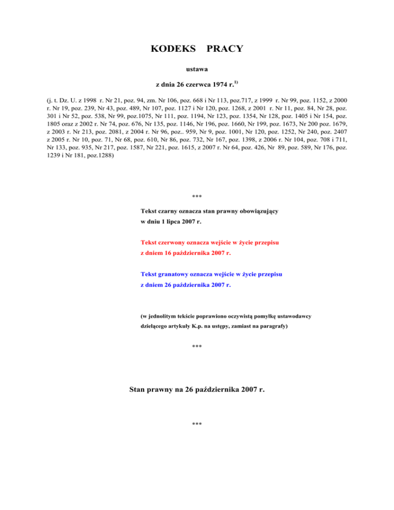KODEKS PRACY ustawa z dnia 26 czerwca 1974 r.1) (j. t. Dz. U. z 1998 r. Nr 21, poz. 94, zm. Nr 106, poz. 668 i Nr 113, poz.717, z 1999 r. Nr 99, poz. 1152, z 2000 r. Nr 19, poz. 239, Nr 43, poz. 489, Nr 107, poz. 1127 i Nr 120, poz. 1268, z 2001 r. Nr 11, poz. 84, Nr 28, poz. 301 i Nr 52, poz. 538, Nr 99, poz.1075, Nr 111, poz. 1194, Nr 123, poz. 1354, Nr 128, poz. 1405 i Nr 154, poz. 1805 oraz z 2002 r. Nr 74, poz. 676, Nr 135, poz. 1146, Nr 196, poz. 1660, Nr 199, poz. 1673, Nr 200 poz. 1679, z 2003 r. Nr 213, poz. 2081, z 2004 r. Nr 96, poz.. 959, Nr 9, poz. 1001, Nr 120, poz. 1252, Nr 240, poz. 2407 z 2005 r. Nr 10, poz. 71, Nr 68, poz. 610, Nr 86, poz. 732, Nr 167, poz. 1398, z 2006 r. Nr 104, poz. 708 i 711, Nr 133, poz. 935, Nr 217, poz. 1587, Nr 221, poz. 1615, z 2007 r. Nr 64, poz. 426, Nr 89, poz. 589, Nr 176, poz. 1239 i Nr 181, poz.1288) *** Tekst czarny oznacza stan prawny obowiązujący w dniu 1 lipca 2007 r. Tekst czerwony oznacza wejście w życie przepisu z dniem 16 października 2007 r. Tekst granatowy oznacza wejście w życie przepisu z dniem 26 października 2007 r. (w jednolitym tekście poprawiono oczywistą pomyłkę ustawodawcy dzielącego artykuły K.p. na ustępy, zamiast na paragrafy) *** Stan prawny na 26 października 2007 r. *** 1) Niniejsza ustawa dokonuje w zakresie swojej regulacji wdrożenia następujących dyrektyw Wspólnot Europejskich: 1) dyrektywy 83/477/EWG z dnia 19 września 1983 r. w sprawie ochrony pracowników przed ryzykiem związanym z narażeniem na działanie azbestu w miejscu pracy (druga dyrektywa szczegółowa w rozumieniu art. 8 dyrektywy 80/1107/EWG) (Dz. Urz. WE L 263 z 24.09.1983, z późn. zm.), 2) dyrektywy 86/188/EWG z dnia 12 maja 1986 r. w sprawie ochrony pracowników przed ryzykiem związanym z narażeniem na działanie hałasu w miejscu pracy (Dz. Urz. WE L 137 z 24.05.1986), 3) dyrektywy 89/391/EWG z dnia 12 czerwca 1989 r. w sprawie wprowadzenia środków w celu poprawy bezpieczeństwa i zdrowia pracowników w miejscu pracy (Dz. Urz. WE L 183 z 29.06.1989), 4) dyrektywy 89/654/EWG z dnia 30 listopada 1989 r. dotyczącej minimalnych wymagań w dziedzinie bezpieczeństwa i ochrony zdrowia w miejscu pracy (pierwsza dyrektywa szczegółowa w rozumieniu art. 16 ust. 1 dyrektywy 89/391/EWG) (Dz. Urz. WE L 393 z 30.12.1989), 5) dyrektywy 89/655/EWG z dnia 30 listopada 1989 r. dotyczącej minimalnych wymagań w dziedzinie bezpieczeństwa i higieny użytkowania sprzętu roboczego przez pracowników podczas pracy (druga dyrektywa szczegółowa w rozumieniu art. 16 ust. 1 dyrektywy 89/391/EWG) (Dz. Urz. WE L 393 z 30.12.1989, z późn. zm.), 6) dyrektywy 89/656/EWG z dnia 30 listopada 1989 r. w sprawie minimalnych wymagań w dziedzinie bezpieczeństwa i ochrony zdrowia pracowników korzystających z wyposażenia ochrony osobistej (trzecia dyrektywa szczegółowa w rozumieniu art. 16 ust. 1 dyrektywy 89/391/EWG) (Dz. Urz. WE L 393 z 30.12.1989), 7) dyrektywy 90/269/EWG z dnia 29 maja 1990 r. w sprawie minimalnych wymagań dotyczących ochrony zdrowia i bezpieczeństwa podczas ręcznego przemieszczania ciężarów w przypadku możliwości wystąpienia zagrożenia, zwłaszcza urazów kręgosłupa pracowników (czwarta szczegółowa dyrektywa w rozumieniu art. 16 ust. 1 dyrektywy 89/391/EWG) (Dz. Urz. WE L 156 z 21.06.1990), 8) dyrektywy 90/270/EWG z dnia 29 maja 1990 r. w sprawie minimalnych wymagań w dziedzinie bezpieczeństwa i ochrony zdrowia przy pracy z urządzeniami wyposażonymi w monitory ekranowe (piąta dyrektywa szczegółowa w rozumieniu art. 16 ust. 1 dyrektywy 89/391/EWG) (Dz. Urz. WE L 156 z 21.06.1990), 9) dyrektywy 90/394/EWG z dnia 28 czerwca 1990 r. w sprawie ochrony pracowników przed zagrożeniem dotyczącym narażenia na działanie czynników rakotwórczych podczas pracy (szósta dyrektywa szczegółowa w rozumieniu art. 16 ust. 1 dyrektywy 89/391/EWG) (Dz. Urz. WE L 196 z 26.07.1990, z późn. zm.), 10) dyrektywy 91/322/EWG z dnia 29 maja 1991 r. w sprawie ustalenia indykatywnych wartości granicznych w wykonaniu dyrektywy 80/1107/EWG w sprawie ochrony pracowników przed ryzykiem związanym z narażeniem na działanie czynników chemicznych, fizycznych i biologicznych w miejscu pracy (Dz. Urz. WE L 177 z 05.07.1991), 11) dyrektywy 91/383/EWG z dnia 25 czerwca 1991 r. uzupełniającej środki mające wspierać poprawę bezpieczeństwa i zdrowia w pracy pracowników pozostających w stosunku pracy na czas określony lub w czasowym stosunku pracy (Dz. Urz. WE L 206 z 29.07.1991), 12) dyrektywy 91/533/EWG z dnia 14 października 1991 r. w sprawie obowiązku pracodawcy dotyczącym informowania pracowników o warunkach stosowanych do umowy lub stosunku pracy (Dz. Urz. WE L 288 z 08.07.1992), 13) dyrektywy 92/57/EWG z dnia 24 czerwca 1992 r. w sprawie wprowadzenia w życie minimalnych wymagań w zakresie bezpieczeństwa i ochrony zdrowia w miejscach tymczasowych lub ruchomych budów (ósma dyrektywa szczegółowa w rozumieniu art. 16 ust. 1 dyrektywy 89/391/EWG) (Dz. Urz. WE L 245 z 26.08.1992), 14) dyrektywy 92/58/EWG z dnia 24 czerwca 1992 r. w sprawie minimalnych wymagań dotyczących znaków bezpieczeństwa i/lub zdrowia w miejscu pracy (dziewiąta dyrektywa szczegółowa w rozumieniu art. 16 ust. 1 dyrektywy 89/391/EWG) (Dz. Urz. WE L 245 z 26.08.1992), 15) dyrektywy 92/85/EWG z dnia 19 października 1992 r. w sprawie wprowadzenia środków służących wspieraniu poprawy w miejscu pracy bezpieczeństwa i zdrowia pracownic w ciąży, pracownic, które niedawno rodziły i pracownic karmiących piersią (dziesiąta dyrektywa szczegółowa w rozumieniu art. 16 ust. 1 dyrektywy 89/391/EWG) (Dz. Urz. WE L 348 z 28.11.1992), 16) dyrektywy 93/104/WE z dnia 23 listopada 1993 r. dotyczącej niektórych aspektów organizacji czasu pracy (Dz. Urz. WE L 307 z 13.12.1993), 17) dyrektywy 94/33/WE z dnia 22 czerwca 1994 r. w sprawie ochrony pracy osób młodych (Dz. Urz. WE L 216 z 20.08.1994), 18) dyrektywy 96/34/WE z dnia 3 cze