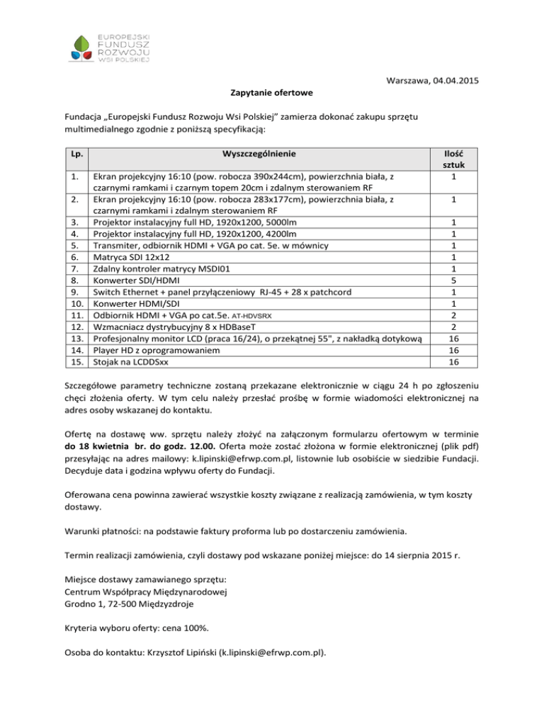Warszawa, 04.04.2015 Zapytanie ofertowe Fundacja „Europejski Fundusz Rozwoju Wsi Polskiej” zamierza dokonać zakupu sprzętu multimedialnego zgodnie z poniższą specyfikacją: Lp. Wyszczególnienie 1. Ekran projekcyjny 16:10 (pow. robocza 390x244cm), powierzchnia biała, z czarnymi ramkami i czarnym topem 20cm i zdalnym sterowaniem RF Ekran projekcyjny 16:10 (pow. robocza 283x177cm), powierzchnia biała, z czarnymi ramkami i zdalnym sterowaniem RF Projektor instalacyjny full HD, 1920x1200, 5000lm Projektor instalacyjny full HD, 1920x1200, 4200lm Transmiter, odbiornik HDMI + VGA po cat. 5e. w mównicy Matryca SDI 12x12 Zdalny kontroler matrycy MSDI01 Konwerter SDI/HDMI Switch Ethernet + panel przyłączeniowy RJ-45 + 28 x patchcord Konwerter HDMI/SDI Odbiornik HDMI + VGA po cat.5e. AT-HDVSRX Wzmacniacz dystrybucyjny 8 x HDBaseT Profesjonalny monitor LCD (praca 16/24), o przekątnej 55", z nakładką dotykową Player HD z oprogramowaniem Stojak na LCDDSxx 2. 3. 4. 5. 6. 7. 8. 9. 10. 11. 12. 13. 14. 15. Ilość sztuk 1 1 1 1 1 1 1 5 1 1 2 2 16 16 16 Szczegółowe parametry techniczne zostaną przekazane elektronicznie w ciągu 24 h po zgłoszeniu chęci złożenia oferty. W tym celu należy przesłać prośbę w formie wiadomości elektronicznej na adres osoby wskazanej do kontaktu. Ofertę na dostawę ww. sprzętu należy złożyć na załączonym formularzu ofertowym w terminie do 18 kwietnia br. do godz. 12.00. Oferta może zostać złożona w formie elektronicznej (plik pdf) przesyłając na adres mailowy: [email protected], listownie lub osobiście w siedzibie Fundacji. Decyduje data i godzina wpływu oferty do Fundacji. Oferowana cena powinna zawierać wszystkie koszty związane z realizacją zamówienia, w tym koszty dostawy. Warunki płatności: na podstawie faktury proforma lub po dostarczeniu zamówienia. Termin realizacji zamówienia, czyli dostawy pod wskazane poniżej miejsce: do 14 sierpnia 2015 r. Miejsce dostawy zamawianego sprzętu: Centrum Współpracy Międzynarodowej Grodno 1, 72-500 Międzyzdroje Kryteria wyboru oferty: cena 100%. Osoba do kontaktu: Krzysztof Lipiński ([email protected]).
