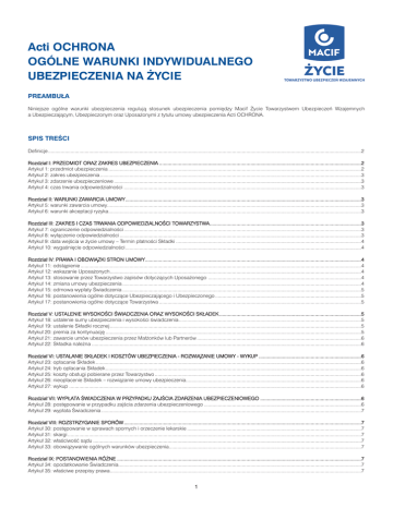 Acti OCHRONA OGÓLNE WARUNKI INDYWIDUALNEGO UBEZPIECZENIA NA ŻYCIE PREAMBUŁA Niniejsze ogólne warunki ubezpieczenia regulują stosunek ubezpieczenia pomiędzy Macif Życie Towarzystwem Ubezpieczeń Wzajemnych a Ubezpieczającym, Ubezpieczonym oraz Uposażonymi z tytułu umowy ubezpieczenia Acti OCHRONA. SPIS TREŚCI Definicje ...............................................................................................................................................................................................................................2 Rozdział I: PRZEDMIOT ORAZ ZAKRES UBEZPIECZENIA ................................................................................................................................................2 Artykuł 1: przedmiot ubezpieczenia ....................................................................................................................................................................................2 Artykuł 2: zakres ubezpieczenia ..........................................................................................................................................................................................3 Artykuł 3: zdarzenie ubezpieczeniowe ................................................................................................................................................................................3 Artykuł 4: czas trwania odpowiedzialności .........................................................................................................................................................................3 Rozdział II: WARUNKI ZAWARCIA UMOWY........................................................................................................................................................................3 Artykuł 5: warunki zawarcia umowy.....................................................................................................................................................................................3 Artykuł 6: warunki akceptacji ryzyka....................................................................................................................................................................................3 Rozdział III: ZAKRES I CZAS TRWANIA ODPOWIEDZIALNOŚCI TOWARZYSTWA............................................................................................................3 Artykuł 7: ograniczenie odpowiedzialności .........................................................................................................................................................................3 Artykuł 8: wyłączenie odpowiedzialności ............................................................................................................................................................................3 Artykuł 9: data wejścia w życie umowy – Termin płatności Składki ....................................................................................................................................4 Artykuł 10: wygaśnięcie odpowiedzialności........................................................................................................................................................................4 Rozdział IV: PRAWA I OBOWIĄZKI STRON UMOWY..........................................................................................................................................................4 Artykuł 11: odstąpienie ........................................................................................................................................................................................................4 Artykuł 12: wskazanie Uposażonych...................................................................................................................................................................................4 Artykuł 13: stosowanie przez Towarzystwo zapisów dotyczących Uposażonego .............................................................................................................4 Artykuł 14: zmiana umowy ubezpieczenia ..........................................................................................................................................................................4 Artykuł 15: odmowa wypłaty Świadczenia ..........................................................................................................................................................................5 Artykuł 16: postanowienia ogólne dotyczące Ubezpieczającego i Ubezpieczonego ........................................................................................................5 Artykuł 17: postanowienia ogólne dotyczące Towarzystwa ................................................................................................................................................5 Rozdział V: USTALENIE WYSOKOŚCI ŚWIADCZENIA ORAZ WYSOKOŚCI SKŁADEK .....................................................................................................5 Artykuł 18: ustalenie sumy ubezpieczenia i wysokości świadczenia..................................................................................................................................5 Artykuł 19: ustalenie Składki rocznej ...................................................................................................................................................................................5 Artykuł 20: premia za kontynuację ......................................................................................................................................................................................5 Artykuł 21: zawarcie umów ubezpieczenia przez Małżonków lub Partnerów .....................................................................................................................6 Artykuł 22: Składka należna ...............