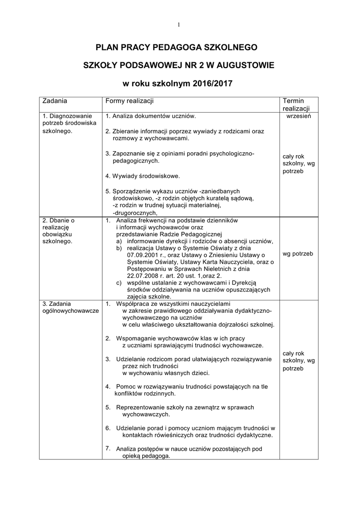1 PLAN PRACY PEDAGOGA SZKOLNEGO SZKOŁY PODSAWOWEJ NR 2 W AUGUSTOWIE w roku szkolnym 2016/2017 Zadania Formy realizacji 1. Diagnozowanie potrzeb środowiska szkolnego. 1. Analiza dokumentów uczniów. 4. Wywiady środowiskowe. 3. Zadania ogólnowychowawcze wrzesień 2. Zbieranie informacji poprzez wywiady z rodzicami oraz rozmowy z wychowawcami. 3. Zapoznanie się z opiniami poradni psychologicznopedagogicznych. 2. Dbanie o realizację obowiązku szkolnego. Termin realizacji 5. Sporządzenie wykazu uczniów -zaniedbanych środowiskowo, -z rodzin objętych kuratelą sądową, -z rodzin w trudnej sytuacji materialnej, -drugorocznych, 1. Analiza frekwencji na podstawie dzienników i informacji wychowawców oraz przedstawianie Radzie Pedagogicznej a) informowanie dyrekcji i rodziców o absencji uczniów, b) realizacja Ustawy o Systemie Oświaty z dnia 07.09.2001 r., oraz Ustawy o Zniesieniu Ustawy o Systemie Oświaty, Ustawy Karta Nauczyciela, oraz o Postępowaniu w Sprawach Nieletnich z dnia 22.07.2008 r. art. 20 ust. 1,oraz 2. c) wspólne ustalanie z wychowawcami i Dyrekcją środków oddziaływania na uczniów opuszczających zajęcia szkolne. 1. Współpraca ze wszystkimi nauczycielami w zakresie prawidłowego oddziaływania dydaktycznowychowawczego na uczniów w celu właściwego ukształtowania dojrzałości szkolnej. cały rok szkolny, wg potrzeb wg potrzeb 2. Wspomaganie wychowawców klas w ich pracy z uczniami sprawiającymi trudności wychowawcze. 3. Udzielanie rodzicom porad ułatwiających rozwiązywanie przez nich trudności w wychowaniu własnych dzieci. 4. Pomoc w rozwiązywaniu trudności powstających na tle konfliktów rodzinnych. 5. Reprezentowanie szkoły na zewnątrz w sprawach wychowawczych. 6. Udzielanie porad i pomocy uczniom mającym trudności w kontaktach rówieśniczych oraz trudności dydaktyczne. 7. Analiza postępów w nauce uczniów pozostających pod opieką pedagoga. cały rok szkolny, wg potrzeb 2 4. Organizowanie opieki i pomocy materialnej uczniom z rodzin w trudnej sytuacji materialnej i patologicznej 1. Pomoc rodzicom w uzyskaniu stypendiów szkolnych dla uczniów znajdujących się w trudnej sytuacji materialnej. Przekazywanie informacji, pomoc w wypełnianiu druków i uzasadnianiu wniosków. wrzesień 2. Typowanie dzieci na dofinansowanie zakupu podręczników (uczniowie kl VI z niepełnosprawnościami). wrzesień 3. Typowanie dzieci na bezpłatne obiady. Współpraca z Miejskim Ośrodkiem Pomocy Społecznej. 4. Dbanie o zapewnienie miejsca w świetlicy „Nasza Ostoja”, „TPD” uczniom wymagającym szczególnej opieki wychowawczej. 5. Poznanie i organizowanie opieki i pomocy materialnej uczniom z rodzin: a) alkoholicznych, b) wielodzietnych, c) samotnych matek/ojców, d) zdemoralizowanych tzn. niezaradnych życiowo, kalekich, z innymi upośledzeniami psychicznymi i fizycznymi. 6. Dbanie w miarę możliwości o dożywianie uczniów, którzy tego potrzebują. 7. Wnioskowanie o umieszczenie uczniów z rodzin szczególnie patologicznych do placówek opiekuńczo-wychowawczych. 5. Profilaktyka wychowawcza cały rok szkolny, wg potrzeb wg potrzeb wg potrzeb wg potrzeb 1. Poznawanie środowiska rodzinnego uczniów naszej szkoły poprzez rozmowy z wychowawcami, wywiady rodzinne i środowiskowe. 2. Ustalenie warunków opieki nad dziećmi przez ich rodziców: atmosfera rodzinna, warunki materialne, współpraca rodziny ze szkołą. cały rok szkolny, wg potrzeb 3. Występowanie do sądu dla nieletnich z wnioskami w sprawach opiekuńczych. 4. Dążenie do wczesnego wykrywania nieprawidłowości i zaburzeń rozwojowych poprzez ścisłą obserwację i kierowanie na wstępne badania do poradni. 5. Wykrywanie w środowisku rodzinnym czynników ujemnie wpływających na kształtowanie postaw społecznych uczniów. 6. Współpraca z instytucjami wspomagającymi szkołę: Poradnią Psychologiczno-Pedagogiczną, Policją, Kuratorami sądowymi, świetlicą ”Nasza Ostoja”, TPD, MOPS-em. 7. Zorganizowanie klasom młodszym (I-III) w I półroczu spotkania z policjantem, który podejmie temat bezpieczeństwa dzieci w różnych sytuacjach życiowych. 8. Objąć klasy (IV-VI) cyklem prelekcji na temat zdrowego stylu życia, a w szczególności o szkodliwości palenia papierosów, narkomanii i zagrożeń podczas korzystania z Internetu. cały rok szkolny, wg potrzeb 3 9. Przystąpienie do realizacji programów edukacji antytytoniowej „Znajdź właściwe rozwiązanie” oraz „Trzymaj Formę!” organizowanych przez Powiatową Stację Sanitarno- Epidemiologiczną w Augustowie. 10. Wykrywanie i likwidowanie takich przejawów niedostosowania szkolnego i społecznego jak: wagary, wulgarność, agresja, samosądy, palenie papierosów, picie alkoholu, odurzanie się. 6. Praca korekcyjno wyrównawcza cały rok szkolny, wg potrzeb 1. Współudział w podnoszeniu poziomu pracy dydaktycznowychowawczej a) organizowanie zespołów wyrównawczych, korekcyjno-kompensacyjnych kl. I - VI, b) wykrywanie fragmentarycznych deficytów rozwojowych, c) obserwacja ucznia niedostosowanego społecznie, podejrzanego o upośledzenie w stopniu lekkim, d) organizowanie innych form pomocy uczniom z zaniedbanych środowisk rodzinnych. 2. Terapia wychowawcza cały rok szkolny, wg potrzeb a) rozmowy z uczniami – eliminowanie napięć związanych ze stresem szkolnym, b) rozmowy z wychowawcami i nauczycielami przedmiotowymi – wspólne wypracowywanie metod i sposobów oddziaływania na ucznia z problemami szkolnymi, c) udzielanie porad rodzicom w szerokim tego słowa znaczeniu w zależności od problemu z jakim rodzic przychodzi, zorganizowanie rodzicom prelekcji na temat np.: zagrożeń narkomanią, nadpobudliwości dziecięcej, agresji, itp. w zależności od potrzeb. 7. Indywidualna opieka pedagogiczna 1. Udzielanie uczniom pomocy w eliminowaniu napięć psychicznych nawarstwiających się na tle niepowodzeń szkolnych. 2. Likwidowanie napięć psychicznych powstałych w szkole, rodzinie, grupac