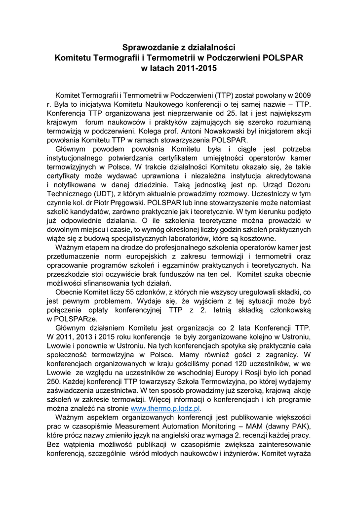 Sprawozdanie z działalności Komitetu Termografii i Termometrii w Podczerwieni POLSPAR w latach 2011-2015 Komitet Termografii i Termometrii w Podczerwieni (TTP) został powołany w 2009 r. Była to inicjatywa Komitetu Naukowego konferencji o tej samej nazwie – TTP. Konferencja TTP organizowana jest nieprzerwanie od 25. lat i jest największym krajowym forum naukowców i praktyków zajmujących się szeroko rozumianą termowizją w podczerwieni. Kolega prof. Antoni Nowakowski był inicjatorem akcji powołania Komitetu TTP w ramach stowarzyszenia POLSPAR. Głównym powodem powołania Komitetu była i ciągle jest potrzeba instytucjonalnego potwierdzania certyfikatem umiejętności operatorów kamer termowizyjnych w Polsce. W trakcie działalności Komitetu okazało się, że takie certyfikaty może wydawać uprawniona i niezależna instytucja akredytowana i notyfikowana w danej dziedzinie. Taką jednostką jest np. Urząd Dozoru Technicznego (UDT), z którym aktualnie prowadzimy rozmowy. Uczestniczy w tym czynnie kol. dr Piotr Pręgowski. POLSPAR lub inne stowarzyszenie może natomiast szkolić kandydatów, zarówno praktycznie jak i teoretycznie. W tym kierunku podjęto już odpowiednie działania. O ile szkolenia teoretyczne można prowadzić w dowolnym miejscu i czasie, to wymóg określonej liczby godzin szkoleń praktycznych wiąże się z budową specjalistycznych laboratoriów, które są kosztowne. Ważnym etapem na drodze do profesjonalnego szkolenia operatorów kamer jest przetłumaczenie norm europejskich z zakresu termowizji i termometrii oraz opracowanie programów szkoleń i egzaminów praktycznych i teoretycznych. Na przeszkodzie stoi oczywiście brak funduszów na ten cel. Komitet szuka obecnie możliwości sfinansowania tych działań. Obecnie Komitet liczy 55 członków, z których nie wszyscy uregulowali składki, co jest pewnym problemem. Wydaje się, że wyjściem z tej sytuacji może być połączenie opłaty konferencyjnej TTP z 2. letnią składką członkowską w POLSPARze. Głównym działaniem Komitetu jest organizacja co 2 lata Konferencji TTP. W 2011, 2013 i 2015 roku konferencje te były zorganizowane kolejno w Ustroniu, Lwowie i ponownie w Ustroniu. Na tych konferencjach spotyka się praktycznie cała społeczność termowizyjna w Polsce. Mamy również gości z zagranicy. W konferencjach organizowanych w kraju gościliśmy ponad 120 uczestników, w we Lwowie ze względu na uczestników ze wschodniej Europy i Rosji było ich ponad 250. Każdej konferencji TTP towarzyszy Szkoła Termowizyjna, po której wydajemy zaświadczenia uczestnictwa. W ten sposób prowadzimy już szeroką, krajową akcję szkoleń w zakresie termowizji. Więcej informacji o konferencjach i ich programie można znaleźć na stronie www.thermo.p.lodz.pl. Ważnym aspektem organizowanych konferencji jest publikowanie większości prac w czasopiśmie Measurement Automation Monitoring – MAM (dawny PAK), które prócz nazwy zmieniło język na angielski oraz wymaga 2. recenzji każdej pracy. Bez wątpienia możliwość publikacji w czasopiśmie zwiększa zainteresowanie konferencją, szczególnie wśród młodych naukowców i inżynierów. Komitet wyraża nadzieję, że wkrótce czasopismo uzyska możliwość indeksowania artykułów na liście JCR, co z pewnością przyczyni się do dalszego rozwoju konferencji TTP. Pragnę wyrazić podziękowanie kol. prof. Tadeuszowi Skubisowi za dotychczasową współpracę konferencji TTP z czasopismem PAK i MAM. Bogusław Więcek Przewodniczący Komitetu TTP