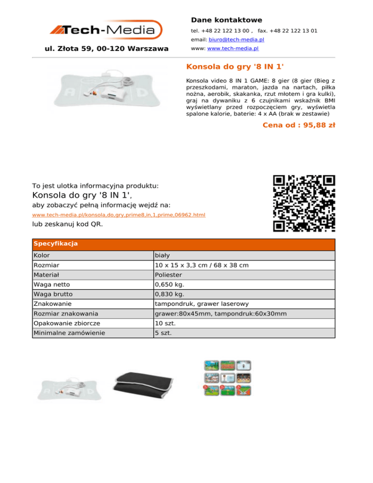 Dane kontaktowe tel. +48 22 122 13 00 , fax. +48 22 122 13 01 email: [email protected] ul. Złota 59, 00-120 Warszawa www: www.tech-media.pl Konsola do gry '8 IN 1' Konsola video 8 IN 1 GAME: 8 gier (8 gier (Bieg z przeszkodami, maraton, jazda na nartach, piłka nożna, aerobik, skakanka, rzut młotem i gra kulki), graj na dywaniku z 6 czujnikami wskaźnik BMI wyświetlany przed rozpoczęciem gry, wyświetla spalone kalorie, baterie: 4 x AA (brak w zestawie) Cena od : 95,88 zł To jest ulotka informacyjna produktu: Konsola do gry '8 IN 1', aby zobaczyć pełną informację wejdź na: www.tech-media.pl/konsola,do,gry,prime8,in,1,prime,06962.html lub zeskanuj kod QR. Specyfikacja Kolor biały Rozmiar 10 x 15 x 3,3 cm / 68 x 38 cm Materiał Poliester Waga netto 0,650 kg. Waga brutto 0,830 kg. Znakowanie tampondruk, grawer laserowy Rozmiar znakowania grawer:80x45mm, tampondruk:60x30mm Opakowanie zbiorcze 10 szt. Minimalne zamówienie 5 szt.