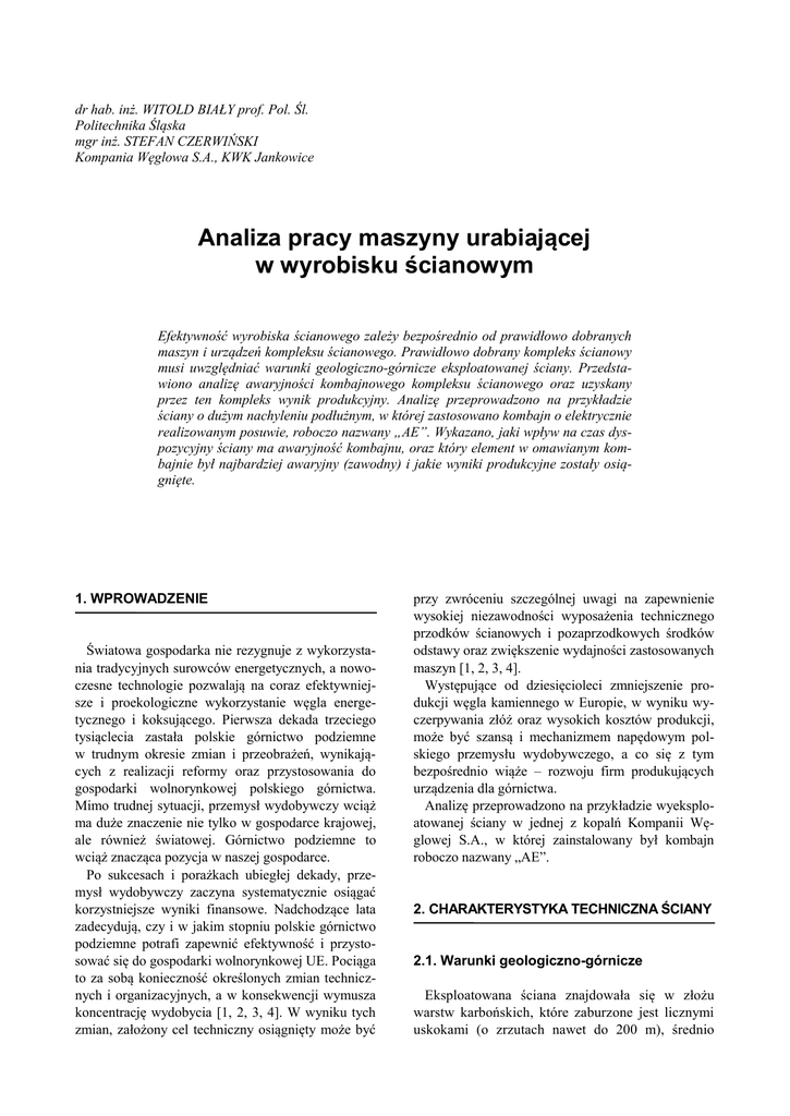 dr hab. inż. WITOLD BIAŁY prof. Pol. Śl. Politechnika Śląska mgr inż. STEFAN CZERWIŃSKI Kompania Węglowa S.A., KWK Jankowice Analiza pracy maszyny urabiającej w wyrobisku ścianowym Efektywność wyrobiska ścianowego zależy bezpośrednio od prawidłowo dobranych maszyn i urządzeń kompleksu ścianowego. Prawidłowo dobrany kompleks ścianowy musi uwzględniać warunki geologiczno-górnicze eksploatowanej ściany. Przedstawiono analizę awaryjności kombajnowego kompleksu ścianowego oraz uzyskany przez ten kompleks wynik produkcyjny. Analizę przeprowadzono na przykładzie ściany o dużym nachyleniu podłużnym, w której zastosowano kombajn o elektrycznie realizowanym posuwie, roboczo nazwany „AE”. Wykazano, jaki wpływ na czas dyspozycyjny ściany ma awaryjność kombajnu, oraz który element w omawianym kombajnie był najbardziej awaryjny (zawodny) i jakie wyniki produkcyjne zostały osiągnięte. 1. WPROWADZENIE Światowa gospodarka nie rezygnuje z wykorzystania tradycyjnych surowców energetycznych, a nowoczesne technologie pozwalają na coraz efektywniejsze i proekologiczne wykorzystanie węgla energetycznego i koksującego. Pierwsza dekada trzeciego tysiąclecia zastała polskie górnictwo podziemne w trudnym okresie zmian i przeobrażeń, wynikających z realizacji reformy oraz przystosowania do gospodarki wolnorynkowej polskiego górnictwa. Mimo trudnej sytuacji, przemysł wydobywczy wciąż ma duże znaczenie nie tylko w gospodarce krajowej, ale również światowej. Górnictwo podziemne to wciąż znacząca pozycja w naszej gospodarce. Po sukcesach i porażkach ubiegłej dekady, przemysł wydobywczy zaczyna systematycznie osiągać korzystniejsze wyniki finansowe. Nadchodzące lata zadecydują, czy i w jakim stopniu polskie górnictwo podziemne potrafi zapewnić efektywność i przystosować się do gospodarki wolnorynkowej UE. Pociąga to za sobą konieczność określonych zmian technicznych i organizacyjnych, a w konsekwencji wymusza koncentrację wydobycia [1, 2, 3, 4]. W wyniku tych zmian, założony cel techniczny osiągnięty może być przy zwróceniu szczególnej uwagi na zapewnienie wysokiej niezawodności wyposażenia technicznego przodków ścianowych i pozaprzodkowych środków odstawy oraz zwiększenie wydajności zastosowanych maszyn [1, 2, 3, 4]. Występujące od dziesięcioleci zmniejszenie produkcji węgla kamiennego w Europie, w wyniku wyczerpywania złóż oraz wysokich kosztów produkcji, może być szansą i mechanizmem napędowym polskiego przemysłu wydobywczego, a co się z tym bezpośrednio wiąże – rozwoju firm produkujących urządzenia dla górnictwa. Analizę przeprowadzono na przykładzie wyeksploatowanej ściany w jednej z kopalń Kompanii Węglowej S.A., w której zainstalowany był kombajn roboczo nazwany „AE”. 2. CHARAKTERYSTYKA TECHNICZNA ŚCIANY 2.1. Warunki geologiczno-górnicze Eksploatowana ściana znajdowała się w złożu warstw karbońskich, które zaburzone jest licznymi uskokami (o zrzutach nawet do 200 m), średnio 6 MECHANIZACJA I AUTOMATYZACJA GÓRNICTWA o zrzutach od 0,5 do 5 m, co w znaczny sposób utrudniało eksploatację. Eksploatowane złoże charakteryzuje się: • III kategorią zagrożenia metanowego, • klasą „B” zagrożenia pyłowego, • I stopniem zagrożenia wodnego, • zmienną skłonnością węgla do samozapalenia. Oprócz wymienionych zagrożeń i warunków naturalnych, czynnikiem wpływającym niekorzystnie na eksploatację było ukształtowanie złoża, a przede wszystkim duże nachylenie podłużne, bliskie zaleganie pokładów oraz liczne rozszczepienia pokładów. Analizowana ściana w pokładzie 409/1 prowadzona była we wschodniej partii złoża, poniżej poziomu 250 aż do poziomu 400, wybierana od początku rozruchu aż do granicy eksploatacji systemem ścianowym podłużnym, z pełnym zawałem stropu, w kierunku z północnego wschodu na południowy zachód. Urabianie odbywało się jednokierunkowo z góry na dół, zgodnie z kierunkiem biegu łańcucha przenośnika ścianowego. Do góry kombajn poruszał się z prędkością manewrową. W ścianie zastosowano czterozmianowy system pracy i potokową formę organizacji robót z potokiem wybierkowym cyklicznym [3, 7]. Zmiany 1, 2 i 3 były zmianami wydobywczo-produkcyjnymi, zaś zmiana 4 była zmianą konserwacyjno-remontową. Zagrożenia naturalne występujące w eksploatowanej ścianie: − metanowe III kategoria, − wodne I stopień, − tąpaniami nie występowało, − pożarem endogenicznym III grupa samozapalności, − od uskoków i zrzutów skał 0,3 m do 2,7 m W ścianie, podczas jej eksploatacji, występowały uskoki o przebiegu N-S i kątach nachylenia płaszczyzn uskokowych od 45° do 60° w rejonie trzech sekcji [8]. przenośnik podścianowy 2.2. Wyposażenie techniczne oraz parametry ściany [7] Analizowana ściana wyposażona była w następujące urządzenia: obudowa zmechanizowana Pioma-Jankowice 19/32,8 –168 szt., podziałka 1,5 m kombajn ścianowy „AE” przenośnik ścianowy Rybnik 295/842/WB/BP – wysyp 1×250/85kW P, zwrotnia 1×250/85kW R, łańcuch 34×126×2 kruszarka kęsów Rybnik/Grot E 225/750, moc napędów 2×90 kW, zastawki 0,6 m, długość 40 m, prędkość 1,5 m/s, łańcuch 26×92×2 KKBW-1, moc 90 kW Parametry ściany: długość ściany grubość pokładu przerosty łupku ilastego nachylenie pokładu podłużne wybieg ściany wskaźnik zwięzłości węgla wytrzymałość skał stropowych typ węgla zapopielenie węgla średnia wytrzymałość węgla planowane wydobycie 250 m 2,00-2,50 m 0,05 do 0,20 m 20°-30° 450 m f = 0,76 Rc = 20,1 MPa 32,1 i 32,2 od 5-10% Rc = 8,2 MPa 3000 Mg/d 3. CHARAKTERYSTYKA TECHNICZNA KOMBAJNU 3.1. Charakterystyka kombajnu [8] Kombajn „AE” łączy w sobie dużą moc, zwartą konstrukcję i zawiera rozwiązania techniczne, zapewniające wysoką niezawodność podczas prowadzenia eksploatacji ścian o dużej koncentracji wydobycia. Zasada „poprz