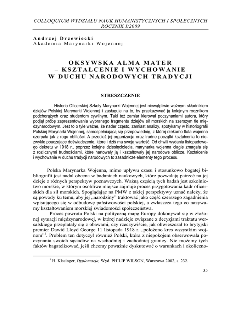 COLLOQUIUM WYDZIAŁU NAUK HUMANISTYCZNYCH I SPOŁECZNYCH ROCZNIK I/2009 Andrzej Drzewiecki Akademia Marynarki Wojennej OKSYWSKA ALMA MATER – KSZTAŁCENIE I WYCHOWANIE W DUCHU NARODOWYCH TRADYCJI STRESZCZENIE Historia Oficerskiej Szkoły Marynarki Wojennej jest niewątpliwie ważnym składnikiem dziejów Polskiej Marynarki Wojennej i zasługuje na to, by przekazywać ją kolejnym rocznikom podchorążych oraz studentom cywilnym. Taki też zamiar kierował poczynaniami autora, który podjął próbę zaprezentowania wybranego fragmentu dziejów sił morskich na szerszym tle międzynarodowym. Jest to o tyle ważne, że nader często, zamiast analizy, spotykamy w historiografii Polskiej Marynarki Wojennej, samospełniającą się przepowiednię, z której rzekomo flota wojenna czerpała jak z rogu obfitości. A przecież jej organizacja oraz trudne początki kształcenia to niezwykle pouczające doświadczenie, które i dziś ma swoją wartość. Od chwili wydania listopadowego dekretu w 1918 r., poprzez kolejne dziesięciolecia, marynarka wojenna ciągle zmagała się z rozlicznymi trudnościami, które hartowały ją i kształtowały jej narodowe oblicze. Kształcenie i wychowanie w duchu tradycji narodowych to zasadnicze elementy tego procesu. Polska Marynarka Wojenna, mimo upływu czasu i stosunkowo bogatej bibliografii jest nadal obecna w badaniach naukowych, które pozwalają patrzeć na jej dzieje z różnych perspektyw poznawczych. Ważną częścią tych badań jest szkolnictwo morskie, w którym osobliwe miejsce zajmuje proces przygotowania kadr oficerskich dla sił morskich. Spoglądając na PMW z takiej perspektywy uznać należy, że są powody ku temu, aby jej „narodziny” traktować jako część szerszego zagadnienia wpisującego się w odbudowę państwowości polskiej, a zwłaszcza tego co nazywamy kształtowaniem morskiej świadomości społeczeństwa. Proces powrotu Polski na polityczną mapę Europy dokonywał się w złożonej sytuacji międzynarodowej, w której nadzieje związane z decyzjami traktatu wersalskiego przeplatały się z obawami, czy rzeczywiście, jak obwieszczał to brytyjski premier Dawid Lloyd George 11 listopada 1918 r. „położono kres wszystkim wojnom”1. Problem ten dotyczył również Polski, która z niepokojem obserwowała poczynania swoich sąsiadów na wschodniej i zachodniej granicy. Nie możemy tych faktów bagatelizować, jeśli chcemy poważnie dyskutować o warunkach i okoliczno1 H. Kissinger, Dyplomacja, Wyd. PHILIP WILSON, Warszawa 2002, s. 232. 35 Andrzej Drzewiecki ściach powołania do życia Polskiej Marynarki Wojennej. W historiografii odnoszącej się do tej problematyki, wielu autorów uznało, że dekret Naczelnika Państwa Józefa Piłsudskiego z 28 listopada 1918 r. był tym impulsem, który zapoczątkował tworzenie sił morskich. Takie stawianie sprawy wydaje się nieuzasadnione, chociażby z tego względu, że w listopadzie 1918 r. Polska nie miała żadnych gwarancji oparcia swojej północnej granicy o brzeg morza. Wiążące ustalenia w tej sprawie powzięto w Wersalu w roku następnym i to wbrew stanowisku delegacji polskiej, która wyraźnie optowała na rzecz przyznania Polsce Gdańska, wskazując na jego żywotne znaczenie dla gospodarczego rozwoju zniszczonego zaborami i wojną kraju2. Przedmiotowa decyzja, mimo iż bardzo odległa od oczekiwań, witana była entuzjastycznie. W ogólnonarodowym podnieceniu towarzyszącym objęciu w posiadanie wybrzeża morskiego, jedni mówili, że odradza się, inni zaś, że rodzi się idea Polski morskiej. Jej fundamentem było 70. kilometrowe wybrzeże przyznane wspomnianym już Traktatem3. Przypomnijmy, że wielu członków odrodzonego parlamentu było poważnie rozczarowanych decyzjami wersalskimi: mieli nadzieję, że Polsce przypadnie większy odcinek wybrzeża; ponadto obawiali się, że sztuczny „korytarz” okaże się niemożliwy do obrony. Zgoła odmienne nastroje panowały nad Zatoką Gdańską, gdzie rodacy, przynajmniej na razie byli zadowoleni. W ten mroźny wtorek rano powitali traktat z otwartymi ramionami; zanurzeni po pierś brodzili w morzu, witając przybliżające się fale Bałtyku, które znowu łamały się na polskim wybrzeżu. Po upływie wieku i ćwierć od rozbiorów dziedzictwo Jagiellonów, niegdyś największy kraj na kontynencie, zostało wyraźnie wpisane w nową mapę Europy4. W tych zimnych, ale jakże gorących politycznie pierwszych dniach lutego 1919 r. nie miało większego znaczenia, że obejmowaliśmy skrawek wybrzeża bez infrastruktury portowej i morskiej. „Wiatr od morza” budził nadzieje wzmocnione historycznymi sentymentami przekonującymi, że Polska od zawsze była tu obecna. Morska trylogia Stefana Żeromskiego u progu lat 20 z przesadnym optymizmem rozpalała umysły, ugruntowując przekonanie o odwiecznych związkach narodu z morzem, o potrzebie „słusznej i dalekosiężnej polityki morskiej”. Była, na co zwrócił uwagę Bronisław Miazgowski, apelem, manifestem i programem politycznym pokolenia, które wywalczyło niepodległość. Dla sprawy morskiej, zauważa Miazgowski, Wiatr od morza był tym, czym dla bytu narodowego Polaków Dziady i Pan Tadeusz Mickiewicza oraz Trylogia Sienkiewicza5. Z tej powodzi romantycznych westchnień wyłaniała się wizja floty wojennej, która w kolejnych planach i programach rozwoju 2 H. Zieliński, Historia Polski 1914-1939, Wyd. Ossolineum, Wrocław – Warszawa – Kraków – Gdańsk – Łódź 1983, s. 92-95. 3 Kwestie te oraz zagadnienie funkcjonowania Wolnego Miasta Gdańska regulował przedmiotowy traktat w punktach od 100-108. Szerzej na ten temat zob. T. Jędruszczak, M. Nowak-Kiełbikowa, Dokumenty z dziejów polskiej polityki zagranicznej 1918-1939, t. 1, Instytut Naukowy PAX, Warszawa 1989, s. 41-69. 4 A. Palmer, Północne sąsiedztwo. Historia krajów i narodów Morza Bałtyckiego, Książka i Wiedza, Warszawa 2008, s. 343. 5 B. Miazgowski, Morze w literaturze