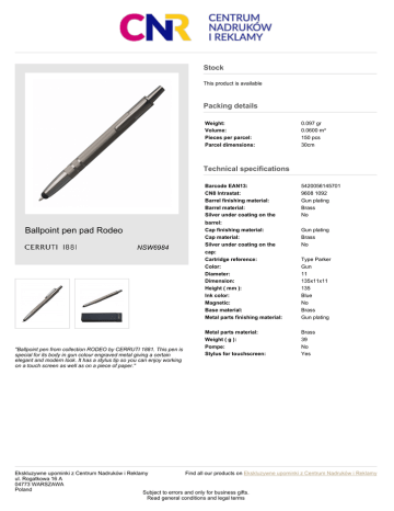 Stock This product is available Packing details Weight: Volume: Pieces per parcel: Parcel dimensions: 0.097 gr 0.0600 m³ 150 pcs 30cm Technical specifications Ballpoint pen pad Rodeo NSW6984 "Ballpoint pen from collection RODEO by CERRUTI 1881. This pen is special for its body in gun colour engraved metal giving a certain elegant and modern look. It has a stylus tip so you can enjoy working on a touch screen as well as on a piece of paper." Barcode EAN13: CN8 Intrastat: Barrel finishing material: Barrel material: Silver under coating on the 5420056145701 9608 1092 Gun plating Brass No barrel: Cap finishing material: Cap material: Silver under coating on the Gun plating Brass No cap: Cartridge reference: Color: Diameter: Dimension: Height ( mm ): Ink color: Magnetic: Base material: Metal parts finishing material: Type Parker Gun 11 135x11x11 135 Blue No Brass Gun plating Metal parts material: Weight ( g ): Pompe: Stylus for touchscreen: Brass 39 No Yes Ekskluzywne upominki z Centrum Nadruków i Reklamy Find all our products on Ekskluzywne upominki z Centrum Nadruków i Reklamy ul. Rogatkowa 16 A 04773 WARSZAWA Poland Subject to errors and only for business gifts. Read general conditions and legal terms