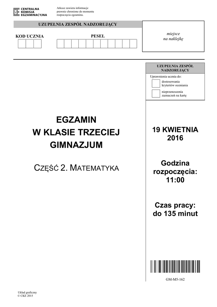 Arkusz zawiera informacje prawnie chronione do momentu rozpoczęcia egzaminu. UZUPEŁNIA ZESPÓŁ NADZORUJĄCY KOD UCZNIA PESEL miejsce na naklejkę UZUPEŁNIA ZESPÓŁ NADZORUJĄCY Uprawnienia ucznia do: dostosowania kryteriów oceniania nieprzenoszenia zaznaczeń na kartę EGZAMIN W KLASIE TRZECIEJ GIMNAZJUM CZĘŚĆ 2. MATEMATYKA 19 KWIETNIA 2016 Godzina rozpoczęcia: 11:00 Czas pracy: do 135 minut GM-M5-162 Układ graficzny © CKE 2015 Instrukcja dla ucznia 1. Sprawdź, czy na kolejno ponumerowanych 34 stronach są wydrukowane 23 zadania. 2. Sprawdź, czy do arkusza jest dołączona karta odpowiedzi. 3. Brak stron lub inne usterki zgłoś nauczycielowi. 4. Czytaj uważnie wszystkie teksty i zadania. 5. Rozwiązania zadań zapisuj długopisem lub piórem z czarnym tuszem / atramentem. Nie używaj korektora. 6. W arkuszu znajdują się różne typy zadań. Do niektórych zadań podane są cztery odpowiedzi: A, B, C, D. Tylko jedna z nich jest poprawna. Wybierz ją i zaznacz znakiem × , np.: A. ×B. C. D. 2 GM-M5 7. W niektórych zadaniach zdecyduj, czy zdanie jest prawdziwe, czy fałszywe i zaznacz znakiem × wybraną odpowiedź, np.: ×P F albo T × N 8. Jeśli się pomylisz, otocz znak × kółkiem i zaznacz inną odpowiedź, np.: A. ×B. ×C. D. 9. Pozostałe zadania wykonuj zgodnie z poleceniami. Rozwiązania zadań od 21. do 23. zapisz czytelnie i starannie w wyznaczonych miejscach. Pomyłki przekreślaj. 10. Zapisy w brudnopisie nie będą sprawdzane i oceniane. Powodzenia! GM-M5 3 Zadanie 1. (0–1) Zastęp harcerzy wyruszył z przystanku autobusowego do obozowiska. Na wykresie przedstawiono zależność między odległością harcerzy od obozowiska a czasem wędrówki. odległość od obozowiska w km 6 5 4 3 2 1 0 13:00 13:30 14:00 14:30 15:00 15:30 godzina 4 GM-M5 Które z poniższych zdań jest fałszywe? Zaznacz odpowiedź spośród podanych. A. Harcerze dotarli do obozowiska po 2,5 godziny. B. W ciągu pierwszej godziny harcerze przeszli 2 km. C. Podczas wędrówki harcerze zatrzymali się na 30-minutowy postój. D. O godzinie 15:00 harcerze byli w odległości 1 km od obozowiska. GM-M5 5 Zadanie 2. (0–1) Dokończ zdanie. Zaznacz odpowiedź spośród podanych. Odległość między liczbami –2,3 i 1 3 na osi liczbowej jest równa A. –2,3 – 1 3 1 B. 2,3 – 3 C. 1 – 2,3 3 D. 1 + 2,3 3 6 GM-M5 Zadanie 3. (0–1) Z cyfr 2, 3 i 5 Ania utworzyła wszystkie możliwe liczby trzycyfrowe o różnych cyfrach. Które z poniższych zdań jest prawdziwe? Zaznacz odpowiedź spośród podanych. A. Wszystkie liczby utworzone przez Anię są nieparzyste. B. Wszystkie liczby utworzone przez Anię są mniejsze od 530. C. Dwie liczby utworzone przez Anię są podzielne przez 5. D. Wśród liczb utworzonych przez Anię są liczby podzielne przez 3. GM-M5 7 Zadanie 4. (0–1) Dane są liczby: I. 2541 II. 12541 III. 2862 IV. 5431 Która z tych liczb jest największa? Zaznacz odpowiedź spośród podanych. A. B. C. D. 8 I II III IV GM-M5 Zadanie 5. (0–1) Dokończ zdanie. Zaznacz odpowiedź spośród podanych. Liczba 3 81 ⋅ 64 jest równa A. 72 B. 36 C. 24 3 3 D. 12 3 3 GM-M5 9 Zadanie 6. (0–1) Cena podstawowa biletu na prom jest równa 40 zł. Cena biletu zmienia się w ciągu roku: • w sezonie zimowym – cena podstawowa obniżona o 20%, • w sezonie letnim – cena podstawowa podwyższona o 200%, • poza sezonem zimowym i letnim – cena podstawowa. Dokończ zdanie. Zaznacz odpowiedź spośród podanych. Bilet na prom w sezonie letnim jest droższy od biletu w sezonie zimowym o A. B. C. D. 10 88 zł 72 zł 48 zł 32 zł GM-M5 Zadanie 7. (0–1) Dane są liczby a i b takie, że 2 < a < 3 oraz –1 < b < 1. Oceń prawdziwość podanych zdań. Zaznacz P, jeśli zdanie jest prawdziwe, albo F – jeśli zdanie jest fałszywe. Iloraz b jest zawsze dodatni. P F a Różnica b – a jest zawsze dodatnia. GM-M5 P F 11 Zadanie 8. (0–1) W klasie IIIa liczba dziewcząt stanowi 2 liczby wszystkich uczniów tej klasy. 3 Dokończ zdanie. Zaznacz odpowiedź spośród podanych. W klasie IIIa A. jest więcej chłopców niż dziewcząt. 3 liczby B. liczba dziewcząt stanowi 2 chłopców. C. jest dwa razy więcej dziewcząt niż chłopców. D. stosunek liczby chłopców do liczby dziewcząt jest równy 1 : 3. 12 GM-M5 Zadanie 9. (0–1) Cenę roweru obniżono o 8%. Klient kupił rower po obniżonej cenie i dzięki temu zapłacił o 120 zł mniej, niż zapłaciłby przed obniżką. Dokończ zdanie. Zaznacz odpowiedź spośród podanych. Przed obniżką ten rower kosztował A. B. C. D. GM-M5 2000 zł 1500 zł 1380 zł 960 zł 13 Zadanie 10. (0–1) W pewnym zakładzie każdy z pracowników codziennie maluje taką samą liczbę jednakowych ozdób. Pracownicy potrzebowali 12 dni roboczych, aby wykonać zamówienie. Gdyby było ich o dwóch więcej, to czas wykonania tego zamówienia byłby o 3 dni krótszy. Dokończ zdanie. Zaznacz odpowiedź spośród podanych. Liczbę pracowników (x) tego zakładu można obliczyć, rozwiązując równanie A. B. C. D. 14 12x = 9(x – 3) 12x = 9(x + 2) 12(x – 3) = 9x 12(x + 2) = 9x GM-M5 Zadanie 11. (0–1) Na rysunku przedstawiono wykres funkcji. y 1 0 1 x Oceń prawdziwość podanych zdań. Zaznacz P, jeśli zdanie jest prawdziwe, albo F – jeśli zdanie jest fałszywe. Funkcja przyjmuje wartość największą dla argumentu 4. P F Funkcja przyjmuje wartość 0 dla czterech argumentów. P F GM-M5 15 Zadanie 12. (0–1) W układzie współrzędnych narysowano sześciokąt foremny o boku 2 tak, że jednym z jego wierzchołków jest punkt (0, 0), a jeden z jego boków leży na osi x. y K 1 0 16 1 x GM-M5 Dokończ zdanie. Zaznacz odpowiedź spośród podanych. Współrzędne wierzchołka K tego sześciokąta są równe A. (3, 3) B. ( 3 , 3) C. ( 3 , 3 ) 2 3 ) D. (3, 2 GM-M5 17 Zadanie 13. (0–1) Do sześciokąta przedstawionego na rysunku w zadaniu 12. dorysowujemy kolejne takie same sześciokąty. Umieszczamy je tak, jak na rysunku, aby każdy następny sześci