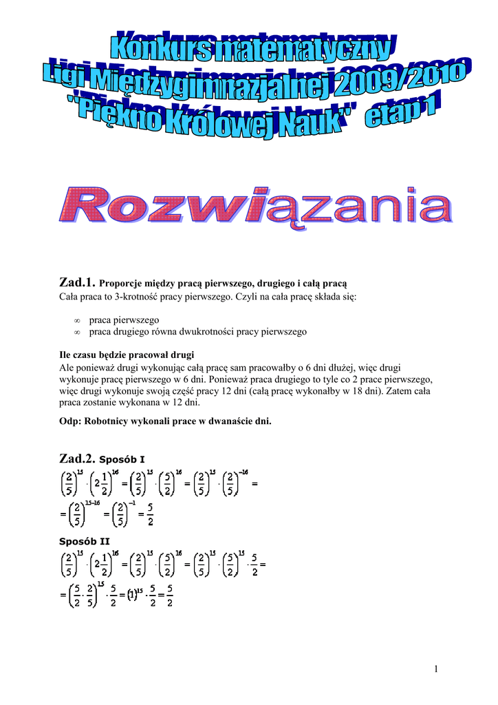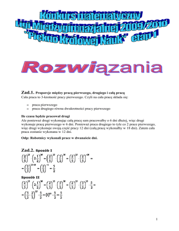 Zad.1. Proporcje między pracą pierwszego, drugiego i całą pracą Cała praca to 3-krotność pracy pierwszego. Czyli na cała pracę składa się: • • praca pierwszego praca drugiego równa dwukrotności pracy pierwszego Ile czasu będzie pracował drugi Ale poniewaŜ drugi wykonując całą pracę sam pracowałby o 6 dni dłuŜej, więc drugi wykonuje pracę pierwszego w 6 dni. PoniewaŜ praca drugiego to tyle co 2 prace pierwszego, więc drugi wykonuje swoją część pracy 12 dni (całą pracę wykonałby w 18 dni). Zatem cała praca zostanie wykonana w 12 dni. Odp: Robotnicy wykonali prace w dwanaście dni. Zad.2. Sposób I Sposób II 1 Zad.3. Przekształcamy dane równanie Suma i róŜnica liczb całkowitych jest całkowita Jeśli x i y są całkowite to ich suma i róŜnica równieŜ będzie całkowita. Zatem mamy iloczyn dwóch liczb całkowitych (pierwsza liczba to x-y, druga liczba to x+y) równy 3. Pierwiastki równania Tylko iloczyn następujących liczb całkowitych moŜe dać 3: (1;3), (-1;-3), (3;1), (-3;-1). Stąd otrzymujemy następujące układy równań i rozwiązania: Układ równań nr 1 Układ równań nr 2 Układ równań nr 3 Układ równań nr 4 Rozwiązaniem równania są następujące pary liczb x, y: (2;1), (-2;-1), (2;-1), (-2;1). Zad.4. Upraszczamy zapis liczby 2 Odp: Liczba jest liczbą wymierną Zad.5. x – wiek Julki Tworzymy równanie: x+2 = 2(x-8) Rozwiązaniem jest 18 lat Zad.6. Na portrecie jest syn męŜczyzny. Zad.7. Rolnik i kura pierwsze przeprawiają się przez rzekę (lis i ziarno razem są bezpieczne), pozostawia kurę na brzegu i wraca. Następnie, rolnik zabiera lisa na drugi brzeg, a poniewaŜ nie moŜe zostawić lisa i kurę razem, zabiera ze sobą kurę z powrotem. I znowu, poniewaŜ nie moŜna zostawić razem kurę i ziarno, zostawia kurę i zabiera ziarno na drugi brzeg i zostawia je z lisem. Potem wraca po kurę i wraca na drugi brzeg po raz ostatni. Zad.8. element c Zad.9. Były tylko trzy osoby – syn, jego ojciec oraz jego dziadek! Zad.10. byk - wszystkie inne wyrazy są dwusylabowe 3