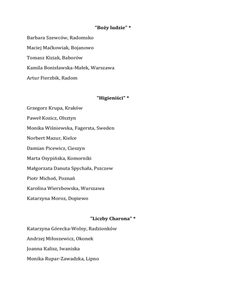 "Boży ludzie" * Barbara Szewców, Radomsko Maciej Maćkowiak, Bojanowo Tomasz Kiziak, Baborów Kamila Bonisławska-Małek, Warszawa Artur Fierzbik, Radom "Higieniści" * Grzegorz Krupa, Kraków Paweł Kozicz, Olsztyn Monika Wiśniewska, Fagersta, Sweden Norbert Mazur, Kielce Damian Picewicz, Cieszyn Marta Osypińska, Komorniki Małgorzata Danuta Spychała, Pszczew Piotr Michoń, Poznań Karolina Wierzbowska, Warszawa Katarzyna Moroz, Dopiewo "Liczby Charona" * Katarzyna Górecka-Wolny, Radzionków Andrzej Miłoszewicz, Okonek Joanna Kalisz, Iwaniska Monika Rupar-Zawadzka, Lipno Anna Młynarczyk, Warszawa Darek Sabramowicz, Medyka Krzysztof Jakubowski, Sosnowiec Bartłomiej Michoń, Sędziszów Młp. Agnieszka Zakrzewska, Pruszcz Gdański Łukasz Dyba, Łódź "Jerozolima. Biografia" * Ewa Daszuta, Gdańsk Agnieszka Go(ó)rczewska, Gdańsk Joanna Rak, Bydgoszcz Maria Lewicka, Warszawa Joanna Bajera, Szczecin Grażyna Czarnowska, Bydgoszcz Michał Nowak, Pińczów Artur Prymon, Przeworsk Marian Kręz(ż)el, Bestwina Adam Guziak, Wrocław "81:1" * Paweł Tyrała, Kraków Marek Krasucki, Czernichów Magdalena Muszalska, Bydgoszcz Jagoda Urabanowicz, Wrocław Agnieszka Markiewicz, Konstantynów Łódzki Wiesław Szałkowski, Iława Jarek Walewski, Bystra Piotr Derwich, Chełmża Maria Maczuga, Poznań Robert Raszewski, Kalisz Maria Charczuk, Bukowina Tatrzańska Marta, Jakób, Kraków "Dzieci Sancheza" * Michał Jakubik, Kraków Marek Filipowski, Szczecin Anna Polewka, Montigny-le-Bretonneux, France Marek Łużyński, Wrocław Elżbieta Kozłowska, Warszawa Jarosław Metrycki, Kraków Wojciech Bałdys, Tychy Agata Zajdel-Metcher, Potsdam, Deutschland Mateusz Mechliński, Starogard Tomasz Kocoń, Łódź