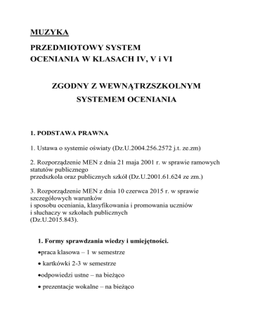 MUZYKA PRZEDMIOTOWY SYSTEM OCENIANIA W KLASACH IV, V i VI ZGODNY Z WEWNĄTRZSZKOLNYM SYSTEMEM OCENIANIA 1. PODSTAWA PRAWNA 1. Ustawa o systemie oświaty (Dz.U.2004.256.2572 j.t. ze.zm) 2. Rozporządzenie MEN z dnia 21 maja 2001 r. w sprawie ramowych statutów publicznego przedszkola oraz publicznych szkół (Dz.U.2001.61.624 ze zm.) 3. Rozporządzenie MEN z dnia 10 czerwca 2015 r. w sprawie szczegółowych warunków i sposobu oceniania, klasyfikowania i promowania uczniów i słuchaczy w szkołach publicznych (Dz.U.2015.843). 1. Formy sprawdzania wiedzy i umiejętności. praca klasowa – 1 w semestrze kartkówki 2-3 w semestrze odpowiedzi ustne – na bieżąco prezentacje wokalne – na bieżąco zadania domowe – na bieżąco wykonywanie zadań dodatkowych /uczestniczenie w zajęciach zespołu wokalnego, angażowanie się w życie artystyczne szkoły/ na bieżąco 2. Skala oceniania w wypowiedziach pisemnych: 100% - 98% punktów – celujący 97% - 90% punktów – bardzo dobry 89% - 70% punktów – dobry 69% - 50% punktów – dostateczny 49% - 31% punktów – dopuszczający 30% - 0 % punktów – niedostateczny 3. Kryteria oceny semestralnej i rocznej. Zasadniczy wpływ na ocenę końcową mają oceny wiodące. Dotyczą one: -prac klasowych -kartkówek -odpowiedzi ustnych -systematycznego odrabiania zadań domowych i przygotowania do lekcji zapisane w formie plusów i minusów oraz ocen -estetyki wykonania utworów wokalnych z pamięci 4. Uwagi końcowe. prace klasowe zapowiadam z tygodniowym wyprzedzeniem; o ocenie informuję w ciągu 2 tygodni. Jeśli uczeń w tym dniu nie był obecny, winien zdać materiał w formie pisemnej lub ustnej w ciągu 2 tygodni od powrotu do szkoły. kartkówek nie zapowiadam; jest to forma pisemnej odpowiedzi na pytania dot. zagadnień omawianych na lekcjach poprzednich, kartkówkę można poprawić. uczeń może poprawić ocenę niedostateczną w ciągu dwóch tygodni. Uczeń poprawia tę ocenę tylko raz i tę ocenę uwzględniam. uczeń nieobecny na kartkówce nie musi jej pisać po powrocie do szkoły, ale poinformowany - przygotowuje się do odpowiedzi ustnej lub pisemnej na lekcję następną z podanych zagadnień nie ma możliwości poprawiania ocen tydzień przed ustalonym terminem klasyfikacji uczeń może otrzymać plusy za aktywność na lekcji; 3 plusy dają ocenę bardzo dobrą nieprzygotowanie do lekcji bez konsekwencji dwa razy w semestrze /zaznaczam minusem/kolejne nieprzygotowanie skutkuje oceną niedostateczną. brak zadania domowego – uczeń otrzymuje „minus”; trzy minusy powodują ocenę niedostateczną ważniejsze są oceny z prac klasowych i kartkówek; ocena końcowa nie jest oceną średnią ocena semestralna i roczna wynika z ocen cząstkowych, jednakże uczeń może otrzymać ocenę celującą semestralną lub roczną jeśli: - uczestniczy w występach zespołu wokalnego - umiejętności muzyczne zdobyte poza szkołą potrafi zaprezentować nauczycielowi, a także podczas szkolnych uroczystości - oceny cząstkowe tego ucznia to głównie celujące i bardzo dobre / oceny dostateczne, dopuszczające, niedostateczne uniemożliwiają uzyskanie oceny celującej/ 5. Informacja zwrotne. 1.Nauczyciel - uczeń a) nauczyciel informuje o wymaganiach i kryteriach oceniania b) uczeń uzyskuje wyjaśnienia dotyczące wystawionej oceny c) nauczyciel motywuje do dalszej pracy 2.Nauczyciel - rodzice a) nauczyciel przekazuje rodzicom informacje o postępach dziecka, trudnościach w nauce i jego uzdolnieniach oraz daje wskazówki do pracy z dzieckiem Nauczyciel - wychowawca klasy - pedagog szkolny, b) nauczyciel informuje wychowawcę klasy o aktualnych osiągnięciach i zachowaniu ucznia, c) nauczyciel informuje pedagoga o sytuacjach wymagających jego interwencji. 6. Ewaluacja. Przedmiotowy system oceniania ulega ewaluacji po każdym roku szkolnym, w razie konieczności w ciągu roku szkolnego. mgr Adam Fajka