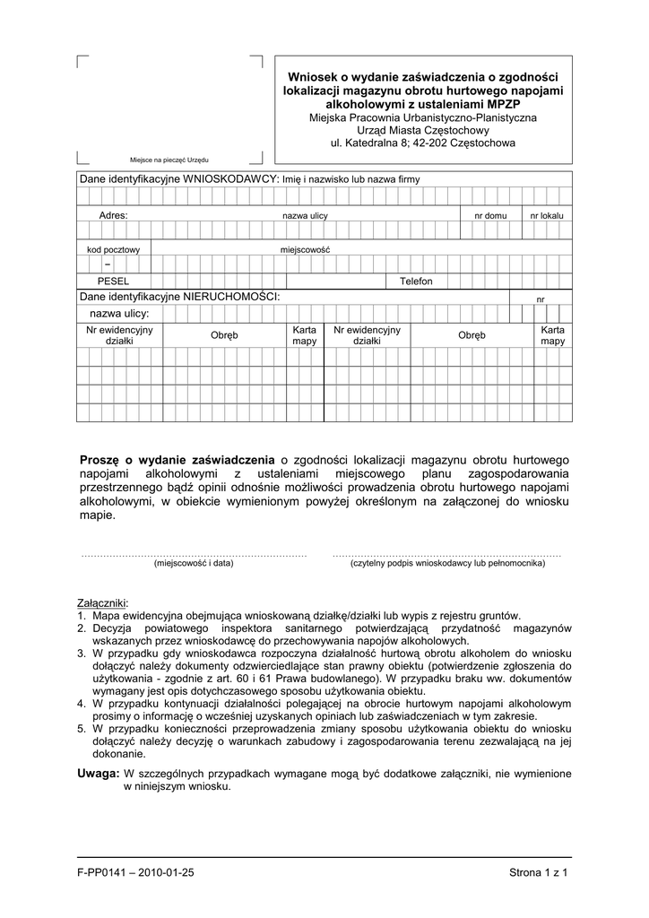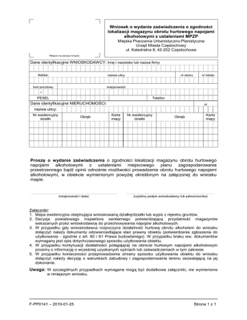Wniosek o wydanie zaświadczenia o zgodności lokalizacji magazynu obrotu hurtowego napojami alkoholowymi z ustaleniami MPZP Miejska Pracownia Urbanistyczno-Planistyczna Urząd Miasta Częstochowy ul. Katedralna 8; 42-202 Częstochowa Miejsce na pieczęć Urzędu Dane identyfikacyjne WNIOSKODAWCY: Imię i nazwisko lub nazwa firmy Adres: nazwa ulicy kod pocztowy miejscowość nr domu nr lokalu – PESEL Telefon Dane identyfikacyjne NIERUCHOMOŚCI: nr nazwa ulicy: Nr ewidencyjny działki Obręb Karta mapy Nr ewidencyjny działki Obręb Karta mapy Proszę o wydanie zaświadczenia o zgodności lokalizacji magazynu obrotu hurtowego napojami alkoholowymi z ustaleniami miejscowego planu zagospodarowania przestrzennego bądź opinii odnośnie moŜliwości prowadzenia obrotu hurtowego napojami alkoholowymi, w obiekcie wymienionym powyŜej określonym na załączonej do wniosku mapie. ........................................................................ ......................................................................... (miejscowość i data) (czytelny podpis wnioskodawcy lub pełnomocnika) Załączniki: 1. Mapa ewidencyjna obejmująca wnioskowaną działkę/działki lub wypis z rejestru gruntów. 2. Decyzja powiatowego inspektora sanitarnego potwierdzającą przydatność magazynów wskazanych przez wnioskodawcę do przechowywania napojów alkoholowych. 3. W przypadku gdy wnioskodawca rozpoczyna działalność hurtową obrotu alkoholem do wniosku dołączyć naleŜy dokumenty odzwierciedlające stan prawny obiektu (potwierdzenie zgłoszenia do uŜytkowania - zgodnie z art. 60 i 61 Prawa budowlanego). W przypadku braku ww. dokumentów wymagany jest opis dotychczasowego sposobu uŜytkowania obiektu. 4. W przypadku kontynuacji działalności polegającej na obrocie hurtowym napojami alkoholowym prosimy o informację o wcześniej uzyskanych opiniach lub zaświadczeniach w tym zakresie. 5. W przypadku konieczności przeprowadzenia zmiany sposobu uŜytkowania obiektu do wniosku dołączyć naleŜy decyzję o warunkach zabudowy i zagospodarowania terenu zezwalającą na jej dokonanie. Uwaga: W szczególnych przypadkach wymagane mogą być dodatkowe załączniki, nie wymienione w niniejszym wniosku. F-PP0141 – 2010-01-25 Strona 1 z 1