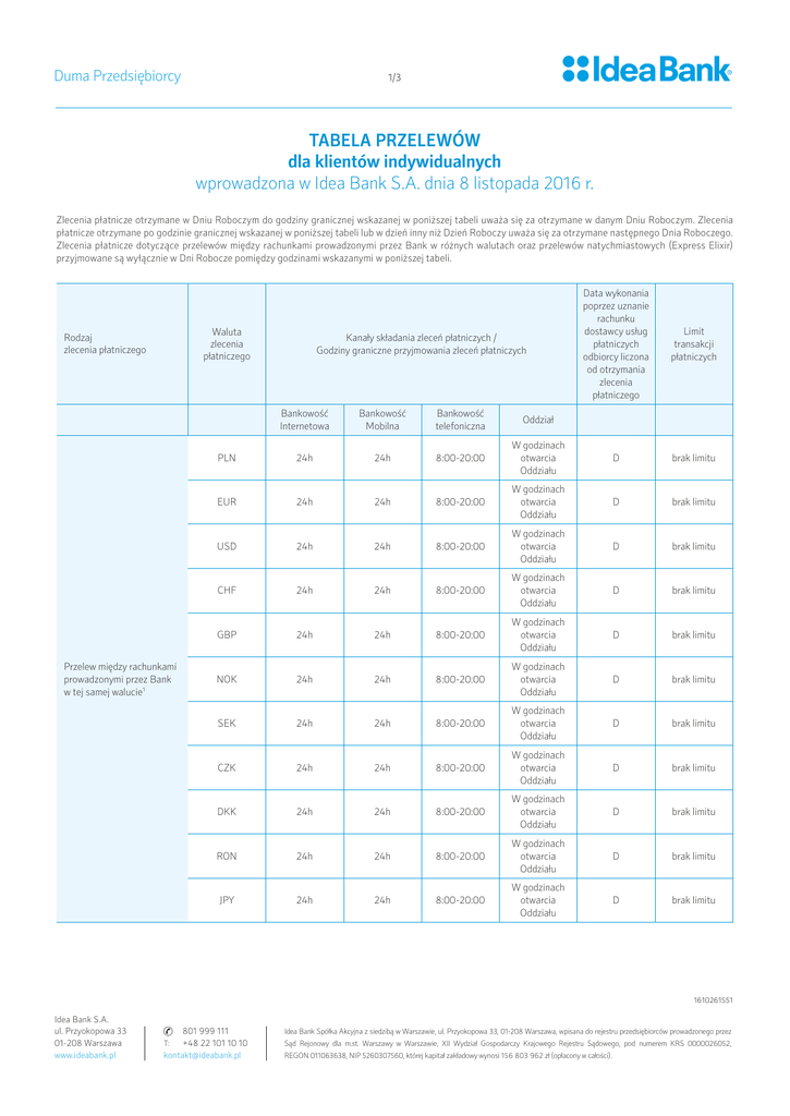 Duma Przedsiębiorcy 1/3 TABELA PRZELEWÓW dla klientów indywidualnych wprowadzona w Idea Bank S.A. dnia 8 listopada 2016 r. Zlecenia płatnicze otrzymane w Dniu Roboczym do godziny granicznej wskazanej w poniższej tabeli uważa się za otrzymane w danym Dniu Roboczym. Zlecenia płatnicze otrzymane po godzinie granicznej wskazanej w poniższej tabeli lub w dzień inny niż Dzień Roboczy uważa się za otrzymane następnego Dnia Roboczego. Zlecenia płatnicze dotyczące przelewów między rachunkami prowadzonymi przez Bank w różnych walutach oraz przelewów natychmiastowych (Express Elixir) przyjmowane są wyłącznie w Dni Robocze pomiędzy godzinami wskazanymi w poniższej tabeli. Waluta zlecenia płatniczego Rodzaj zlecenia płatniczego Przelew między rachunkami prowadzonymi przez Bank w tej samej walucie1 Kanały składania zleceń płatniczych / Godziny graniczne przyjmowania zleceń płatniczych Data wykonania poprzez uznanie rachunku dostawcy usług płatniczych odbiorcy liczona od otrzymania zlecenia płatniczego Limit transakcji płatniczych Bankowość Internetowa Bankowość Mobilna Bankowość telefoniczna Oddział PLN 24h 24h 8:00-20:00 W godzinach otwarcia Oddziału D brak limitu EUR 24h 24h 8:00-20:00 W godzinach otwarcia Oddziału D brak limitu USD 24h 24h 8:00-20:00 W godzinach otwarcia Oddziału D brak limitu CHF 24h 24h 8:00-20:00 W godzinach otwarcia Oddziału D brak limitu GBP 24h 24h 8:00-20:00 W godzinach otwarcia Oddziału D brak limitu NOK 24h 24h 8:00-20:00 W godzinach otwarcia Oddziału D brak limitu SEK 24h 24h 8:00-20:00 W godzinach otwarcia Oddziału D brak limitu CZK 24h 24h 8:00-20:00 W godzinach otwarcia Oddziału D brak limitu DKK 24h 24h 8:00-20:00 W godzinach otwarcia Oddziału D brak limitu RON 24h 24h 8:00-20:00 W godzinach otwarcia Oddziału D brak limitu JPY 24h 24h 8:00-20:00 W godzinach otwarcia Oddziału D brak limitu 1610261551 Idea Bank S.A. ul. Przyokopowa 33 01-208 Warszawa www.ideabank.pl 801 999 111 +48 22 101 10 10 [email protected] T: Idea Bank Spółka Akcyjna z siedzibą w Warszawie, ul. Przyokopowa 33, 01-208 Warszawa, wpisana do rejestru przedsiębiorców prowadzonego przez Sąd Rejonowy dla m.st. Warszawy w Warszawie, XII Wydział Gospodarczy Krajowego Rejestru Sądowego, pod numerem KRS 0000026052, REGON 011063638, NIP 5260307560, której kapitał zakładowy wynosi 156 803 962 zł (opłacony w całości). Duma Przedsiębiorcy 2/3 PLN 8:00-17:00 8:00-17:00 8:00-17:00 8:00-17:00 D brak limitu EUR 8:00-17:00 8:00-17:00 8:00-17:00 8:00-17:00 D brak limitu USD 8:00-17:00 8:00-17:00 8:00-17:00 8:00-17:00 D brak limitu GBP 8:00-17:00 8:00-17:00 8:00-17:00 8:00-17:00 D brak limitu CHF 8:00-17:00 8:00-17:00 8:00-17:00 8:00-17:00 D brak limitu NOK 8:00-17:00 8:00-17:00 8:00-17:00 8:00-17:00 D brak limitu SEK 8:00-17:00 8:00-17:00 8:00-17:00 8:00-17:00 D brak limitu CZK 8:00-17:00 8:00-17:00 8:00-17:00 8:00-17:00 D brak limitu DKK 8:00-17:00 8:00-17:00 8:00-17:00 8:00-17:00 D brak limitu RON 8:00-17:00 8:00-17:00 8:00-17:00 8:00-17:00 D brak limitu JPY 8:00-17:00 8:00-17:00 8:00-17:00 8:00-17:00 D brak limitu Przelew krajowy (na rachunek w innym banku w kraju – ELIXIR) PLN 15:00 15:00 15:00 15:00 D brak limitu Przelewy do ZUS lub Urzędu Skarbowego PLN 15:00 15:00 15:00 15:00 D brak limitu Przelew w systemie SORBNET23 PLN 15:00 15:00 15:00 15:00 D brak limitu Przelew między rachunkami prowadzonymi przez Bank w różnych walutach2 Przelew natychmiastowy (Express Elixir) PLN 02:00 – 22:00 02:00 – 22:00 n/d n/d D maksymalny przelew jednorazowy do 50 tys. Przelew ekspresowy w systemie TARGET2 (tylko w EUR, opcja SHA)4 EUR n/d n/d 14:30 14:30 D brak limitu Przelew europejski (SEPA/EuroElixir) EUR 11:00 n/d 11:00 11:00 D brak limitu PLN 13:30 n/d 13:30 13:30 D+1 brak limitu EUR 13:30 n/d 13:30 13:30 D+1 brak limitu USD 13:30 n/d 13:30 13:30 D+2 brak limitu CHF 13:30 n/d 13:30 13:30 D+1 brak limitu GBP 13:30 n/d 13:30 13:30 D+1 brak limitu NOK 13:30 n/d 13:30 13:30 D+1 brak limitu SEK 13:30 n/d 13:30 13:30 D+1 brak limitu CZK 13:30 n/d 13:30 13:30 D+1 brak limitu DKK 13:30 n/d 13:30 13:30 D+1 brak limitu RON 13:30 n/d 13:30 13:30 D+1 brak limitu JPY 13:30 n/d 13:30 13:30 D+1 brak limitu Przelew międzynarodowy oraz przelew walutowy (w tym przelew walut obcych na rachunki w innych bankach na terenie kraju) tryb zwykły (SWIFT)5 1610261551 Idea Bank S.A. ul. Przyokopowa 33 01-208 Warszawa www.ideabank.pl 801 999 111 +48 22 101 10 10 [email protected] T: Idea Bank Spółka Akcyjna z siedzibą w Warszawie, ul. Przyokopowa 33, 01-208 Warszawa, wpisana do rejestru przedsiębiorców prowadzonego przez Sąd Rejonowy dla m.st. Warszawy w Warszawie, XII Wydział Gospodarczy Krajowego Rejestru Sądowego, pod numerem KRS 0000026052, REGON 011063638, NIP 5260307560, której kapitał zakładowy wynosi 156 803 962 zł (opłacony w całości). Duma Przedsiębiorcy Przelew międzynarodowy oraz przelew walutowy (w tym przelew walut obcych na rachunki w innych bankach na terenie kraju) tryb przyśpieszony (SWIFT) Przelew międzynarodowy oraz przelew walutowy (w tym przelew walut obcych na rachunki w innych bankach na terenie kraju) tryb ekspresowy (SWIFT)5 3/3 PLN n/d n/d n/d n/d n/d n/d EUR n/d n/d n/d n/d n/d n/d USD n/d n/d 13:00 13:00 D+1 brak limitu CHF n/d n/d n/d n/d n/d n/d GBP n/d n/d n/d n/d n/d n/d NOK n/d n/d n/d n/d n/d n/d SEK n/d n/d n/d n/d n/d n/d CZK n/d n/d n/d n/d n/d n/d DKK n/d n/d n/d n/d n/d n/d RON n/d n/d n/d n/d n/d n/d JPY n/d n/d n/d n/d n/d n/d PLN n/d n/d 13:00 13:00 D brak limitu EUR n/d n/d 13:00 13:00 D brak limitu USD n/d n/d 13:00 13:00 D brak limitu CHF n/d n/d n/d n/d n/d n/d GBP n/d n/d n/d n/d n/d n/d NOK n/d n/d 13:00 13:00 D brak limitu SEK n/d n/d 13:00 13:00 D brak limitu CZK n/d n/d 13:00 13:00 D brak limitu DKK n/d n/d 13:00 13:00 D brak limitu RON n/d n/d 13:00 13:00 D brak limitu JPY n/d n/d 13:00 13:00 D brak limitu Oznacza przelew między rachunkami w Idea Bank S.A. w którym waluta transakcji jest taka sam
