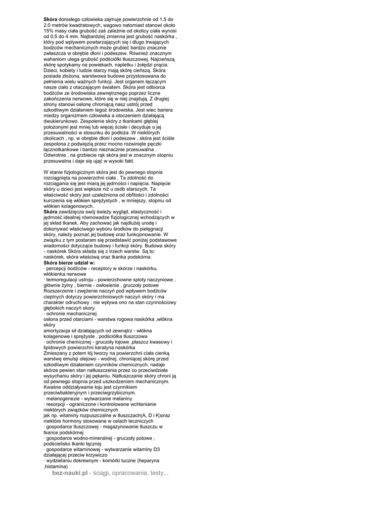 Skóra dorosłego człowieka zajmuje powierzchnie od 1.5 do 2.0 metrów kwadratowych, wagowo natomiast stanowi około 15% masy ciała grubość zaś zależnie od okolicy ciała wynosi od 0,5 do 4 mm. Najbardziej zmienna jest grubość naskórka , który pod wpływem powtarzających się i długo trwających bodźców mechanicznych może grubieć bardzo znacznie zwłaszcza w obrębie dłoni i podeszew. Również znacznym wahaniom ulega grubość podściółki tłuszczowej. Najcieńszą skórę spotykamy na powiekach, napletku i żołędzi prącia. Dzieci, kobiety i ludzie starzy mają skórę cieńszą. Skóra posiada złożona, warstwowa budowe przystosowana do pełnienia wielu ważnych funkcji. Jest organem łączącym nasze ciało z otaczającym światem. Skóra jest odbiorca bodźców ze środowiska zewnętrznego poprzez liczne zakończenia nerwowe, które się w niej znajdują. Z drugiej strony stanowi osłonę chroniącą nasz ustrój przed szkodliwym działaniem tegoż środowiska. Jest wiec bariera miedzy organizmem człowieka a otoczeniem działającą dwukierunkowo. Zespolenie skóry z tkankami głębiej położonymi jest mniej lub więcej ścisłe i decyduje o jej przesuwalności w stosunku do podłoża .W niektórych okolicach , np. w obrębie dłoni i podeszew , skóra jest ściśle zespolona z podwięzią przez mocno rozwinięte pęczki łącznotkankowe i bardzo nieznacznie przesuwalna . Odwrotnie , na grzbiecie rąk skóra jest w znacznym stopniu przesuwalna i daje się ująć w wysoki fałd. W stanie fizjologicznym skóra jest do pewnego stopnia rozciągnięta na powierzchni ciała . Ta zdolność do rozciągania się jest miarą jej jędrności i napięcia. Napięcie skóry u dzieci jest większe niż u osób starszych. Ta właściwość skóry jest uzależniona od obfitości i zdolności kurczenia się włókien sprężystych , w mniejszy, stopniu od włókien kolagenowych. Skóra zawdzięcza swój świeży wygląd, elastyczność i jędrność idealnej równowadze fizjologicznej wchodzących w jej skład tkanek. Aby zachować jak najdłużej urodę i dokonywać właściwego wyboru środków do pielęgnacji skóry, należy poznać jej budowę oraz funkcjonowanie. W związku z tym postaram się przedstawić poniżej podstawowe wiadomości dotyczące budowy i funkcji skóry. Budowa skóry - naskórek Skóra składa się z trzech warstw. Są to: naskórek, skóra właściwą oraz tkanka podskórna. Skóra bierze udział w: · percepcji bodźców - receptory w skórze i naskórku, włókienka nerwowe · termoregulacji ustroju - powierzchowne sploty naczyniowe , głównie żylny , biernie - owłosienie , gruczoły potowe Rozszerzenie i zwężenie naczyń pod wpływem bodźców cieplnych dotyczy powierzchniowych naczyń skóry i ma charakter odruchowy ; nie wpływa ono na stan czynnościowy głębokich naczyń skory. · ochronie mechanicznej osłona przed otarciami - warstwa rogowa naskórka ,włókna skóry amortyzacja sił działających od zewnątrz - włókna kolagenowe i sprężyste , podściółka tłuszczowa · ochronie chemicznej - gruczoły łojowe ,płaszcz kwasowy i lipidowych powierzchni keratyna naskórka Zmieszany z potem łój tworzy na powierzchni ciała cienką warstwę emulsji olejowo - wodnej, chroniącej skórę przed szkodliwym działaniem czynników chemicznych, nadaje skórze pewien stan natłuszczenia przez co przeciwdziała wysychaniu skóry i jej pękaniu. Natłuszczanie skóry chroni ją od pewnego stopnia przed uszkodzeniem mechanicznym. Kwaśne oddziaływanie łoju jest czynnikiem przeciwbakteryjnym i przeciwgrzybicznym. · melanogenezie - wytwarzanie melaniny · resorpcji - ograniczone i kontrolowane wchłanianie niektórych związków chemicznych jak np. witaminy rozpuszczalne w tłuszczach(A, D i K)oraz niektóre hormony stosowane w celach leczniczych · gospodarce tłuszczowej - magazynowanie tłuszczu w tkance podskórnej · gospodarce wodno-mineralnej - gruczoły potowe , podścielisko tkanki łącznej · gospodarce witaminowej - wytwarzanie witaminy D3 działającej przeciw krzywiczo · wydzielaniu dokrewnym - komórki tuczne (heparyna ,histamina) bez-nauki.pl - ściągi, opracowania, testy... HIGIENA, PIELĘGNACJA, ORAZ ZAPOBIEGANIE CHOROBOM SKÓRY. Na powierzchni skory gromadzi się brud, który składa się z potu, łoju, złuszczonych komórek naskórka, kurzu i licznych bakterii W razie uszkodzeń skóry bakterie z powierzchni mogą przenikać do organizmu, dlatego należy codziennie zmywać całą powierzchnię skóry ciepłą wodą i mydłem. Codzienna pielęgnacja skóry ma tez znaczenie estetyczne i wpływa na dobre samopoczucie. Po umyciu dobrze jest ciało nasmarować balsamem, aby się nie łuszczyła oraz żeby nie była sucha. W okresie dojrzewania na skórze twarzy, szyi, pleców pojawia się trądzik. Jest on spowodowany zaburzeniami hormonalnymi w organizmie. Trądzik nie jest stanem chorobowym i jeżeli nie zostanie zainfekowany, po jakimś czasie zniknie. W sprzedaży są również kosmetyki przeznaczone do pielęgnacji cery trądzikowej. Czystość i higiena skóry zabezpiecza nas przed pasożytami, np. wszawicą, pchłami, świerzbem. Do najczęściej występujących chorób skóry zaliczamy: grzybicę, opryszczkę. Skóra narażona jest również na oparzenia i odmrożenia. Oparzenia mogą być spowodowane: ogniem, wrzącą wodą, związkami chemicznymi, i promieniami słonecznymi. Rozróżnia się trzy stopnie oparzeń. Jedynie w przypadku oparzenia pierwszego stopnia (zaczerwienienie i lekki obrzęk skóry) nie trzeba zwracać się do lekarza. W przypadku większego oparzenia nie wolno przekłuwać pęcherzy. Najlepiej przyłożyć sterylizowany opatrunek i udać się do lekarza. Odmrożenie poznajemy po zblednięciu skóry i utracie jej wrażliwości, ponieważ ustaje tam krążenie krwi. Pomoc polega na przywróceniu krążenia przez delikatne nacieranie skóry lub kąpiel w coraz to wyższej temperaturze. Odmrożon