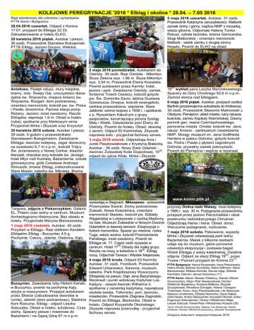 KOLEJOWE PEREGRYNACJE '2016 * Elbląg i okolice * 28.04. – 7.05 2016 5 maja 2016 czwartek. Autokar. 31 osób. Przewodnik Katarzyna Januszkiewicz. Malbork zamek dolny i górny, kaplica NMP z mozaiką, wieża główna. Odjechała Helena Tontor. Ratusz, szkoła łacińska, brama Garncarska. Stogi Malborskie - cmentarz mennonicki. Malbork - widok zamku z drugiej strony Nogatu. Powrót do ELKO na obiad. Rajd szkoleniowy dla członków i sympatyków PTTK Konin i Bydgoszcz. 28.04.2016 czwartek. Odjazd z Konina 17:07, przyjazd do Elbląga 22:33. Zakwaterowanie w hotelu ELKO. 29 kwietnia 2016 piątek. Autokar i pieszo. 36 osób. Przewodnik Stanisław Bukojemski PTTK Elbląg. Jezioro Druzno, Weklice, Dzień Flagi 2 maja 2016 poniedziałek. Autokarem do Ostródy. 39 osób. Rejs Ostróda - Miłomłyn. Śluza Zielona wys. 1,96 m. Śluza Miłomłyn wys. 3,54 m. Przewodnik Elwira Kowalska. Powrót autokarem przez Karnity: hotel, Aniołowo, Pasłęk ratusz, mury miejskie, jezioro i park. Zwiedzanie Ostródy: zamek, bramy, lody. Święty Gaj: uroczystości diece- fontanna Trzech Cesarzy, kościół gotycki zjalne św. Wojciecha, miejsce śmierci św. pw. Św. Dominika Savio, tablica Gustawa Wojciecha. Rozgart: dom podcieniowy, Gizewiusza, Drwęca, kościół ewangelicki, cmentarz mennonicki, kościół pw. św. Piotra cerkiew prawosławna, więzienie. Stare i Pawła, dzwonnica. Parowa stacja pomp Jabłonki: schron bojowy z 1938 r. i spotkanie Różany. Jezioro: most zwodzony. Raczki z p. Ryszardem Kałużnym z grupy Elbląskie: depresja 1,8 m. Obiad w hotelu pasjonatów, kanał łączący jeziora Szeląg (ryba), spotkanie przy Markowym winie. Mały i Wielki. Odwiezienie pani Elwiry do Przyjechali Mirka i Zbyszek oraz Krzysztof. Ostródy. Powrót do hotelu. Obiad: dewolaj 30 kwietnia 2016 sobota. Autokar i pieszo. z serem. Odjazd Eli Kamińskiej. Zbyszek 39 osób. 5 godzin z przewodnikiem naprawia koło - przyjechał fachowy serwis. Stanisławem Bukojemskim. Zwiedzanie 3 maja 2016 wtorek. Odjeżdżają Ania i Elbląga: dworzec kolejowy, zegar słoneczny Jurek Paszkowiakowie z Krystyną Białecką. na wysokości 6,7 m n.p.m., kościół Trójcy Autokar - 36 osób. Nowy Dwór Gdański 00 Św. przeniesiony z Nowej Cerkwi, klasztor dworzec Żuławskiej Kolei Dojazdowej. 10 klarysek, chaczkar przy kościele św. Jerzego, odjazd do ujścia Wisły. Mirka i Zbyszek hotel Młyn nad Kumielą, Bażantarnia, szkoła gimnastyczna, grób Czesława Andrzeja Klimuszki, browar Elbląg, zrekonstruowane Stare Miasto, katedra św. Mikołaja, Brama Targowa, zdjęcie z Piekarczykiem, Galeria EL. Potem czas wolny w centrum. Muzeum Archeologiczno-Historyczne. Bez obiadu w hotelu. Przyjechała Marysia Bieniszewska. 1 maja 2016 niedziela. Autokar. 40 osób. Przystań w Elblągu. Rejs statkiem Kanałem Elbląskim Elbląg - Buczyniec 4,5 g. Pochylnie: Całuny, Jelenie, Oleśnica, Kąty, Buczyniec. Zwiedzanie Izby Historii Kanału w Buczyńcu, powrót na pochylnię Kąty, wizyta w maszynowni. Przejazd autokarem przez Śliwice (zabudowania dworskie w ruinie), Jelonki (dom podcieniowy), Stadnina Koni Rzeczna. Elbląg - odjazd Leszka Sobczaka. Obiad w hotelu: schabowy. Czas wolny. Spacery piesze i rowerowe do Bażantarni i na Gęsią Górę 67 m n.p.m. wysiadają w Stegnach. Mikoszewo - przewodnik Przemysław Siwicki. Domy podcieniowe: Żuławki, Nowa Kościelnica, cmentarz mennonicki Stawiec, kościół pw. Elżbiety Węgierskiej w Lubieszewie z rzeźbą Madonny na lwie, Muzeum Żuławskie w Nowym Dworze Gdańskim w dawnej serowni. Ekspozycja o historii menonitów. Spacer po mieście, rzeka Tuga, wieża wodna, kościół Przemienienia Pańskiego, most zwodzony. Powrót do Elbląga ok. 17. Część osób wysiada w centrum. Hotel 1700.Obiady dla małej grupy. 00 Reszta na mszy w katedrze o 18 . Elbląg nocą. Odjechali Teresa i Włodek Mejerowie. 4 maja 2016 środa. Odjazd Eli Kemnitz. Autokar. 31 osób. Frombork. Przewodnik Edward Urbanowicz. Kanonie, muzeum, katedra. Park Krajobrazowy Wysoczyzny Elbląskiej na pieszo. Dąb Jana Bażyńskiego. Rezerwat i punkt widokowy Kadyński Las. Kadyny - zespół dworski Wilhelma II, spotkanie z ceramiką kadyńską, największa stodoła świata. Tolkmicko: port, dworzec, miasteczko. Przewodnik Zbigniew Zagrodzki. Powrót do Elbląga, Biedronka. Obiad w hotelu. Odjazd Krzysztofa Okońskiego. Zbyszek naprawia przerzutkę - przyjechał fachowy serwis. 1800 wykład pana Leszka Marcinkowskiego. Spacery do Góry Chrobrego 92,6 m n.p.m. Zachód słońca nad Elblągiem. 6 maja 2016 piątek. Autokar, przejazd wzdłuż Berlinki (przedwojenna autostrada do Królewca). 30 osób. Przewodnik Sławomir Malinowski z Olsztyna. Pieniężno: układ miasta, ruiny ratusza, kościoła, zamku Kapituły Warmińskiej. Dawny pomnik gen. Iwana Czerniachowskiego, panorama miasta. Orneta: kościół św. Jana, ratusz. Krosno - sanktuarium nawiedzenia NMP. Morąg: muzeum im. Jana Gottfrieda Herdera w pałacu Dohnów, gotycki kościół św. Piotra i Pawła z płytami nagrobnymi Dohnów, prywatny zamek pokrzyżacki. Powrót do Pieniężna i wejście w rezerwat www.konin.pttk.pl przyrody Dolina rzeki Wałszy, most kolejowy z 1885 r. wys. 30 m. Pożegnanie przewodnika, przejazd przez jezioro Pierzchalskie i obok posterunku radiolokacyjnego Chruściel. Odjeżdżają Hania i Irena. Obiad: dorsz. Wieczorne pożegnanie, rozliczenie. 7 maja 2016 sobota. Pakowanie, wyjazdy. Mirka i Zbyszek odwiedzają park leśny Bażantarnia. Marek z kilkoma osobami udaje się do muzeum, gdzie ponownie odwiedza ekspozycje i zostawia bagaż. Widok Elbląga z wieży katedralnej. Ostatnie zdjęcia. Odjazd ze stacji Elbląg 1655, przez 13 Tczew i Poznań przyjazd do Konina 23 . PTTK Bydgoszcz: Hanna Ryszewska, Irena Piekutowska, Halina Smoła, Barbara Sucharska, Maria Hoffmann, Maria Bieniszewska, Elżbieta Kemnitz, Danuta Zając, Elżbieta Kamińska, Danuta i Janusz Kaczyńscy (11). PTTK Konin: Marek i Renata Chlebiccy, Wanda i Michał Gruszczyńscy, A