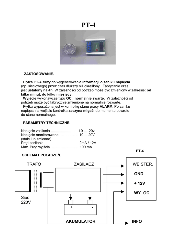 PT-4 ZASTOSOWANIE. Płytka PT-4 służy do wygenerowania informacji o zaniku napięcia (np. sieciowego) przez czas dłuższy niż określony. Fabrycznie czas jest ustalony na 4h. W zależności od potrzeb może być zmieniony w zakresie: od kilku minut, do kilku miesięcy. Wyjście wykonawcze typu OC , normalnie zwarte. W zależności od potrzeb może być fabrycznie zmienione na normalnie rozwarte. Płytka wyposażona jest w kontrolkę stanu pracy ALARM. Po zaniku napięcia na wejściu kontrolka zaczyna migać, do momentu powrotu do stanu normalnego. PARAMETRY TECHNICZNE. Napięcie zasilania .......................... 10 ... 20v Napięcie monitorowane ................. 10 ... 20V (stałe lub zmienne) Prąd zasilania .............................. 2mA / 12V Max. Prąd wyjścia .......................... 100 mA PT-4 SCHEMAT POŁĄCZEŃ. TRAFO ZASILACZ WE STER. GND + 12V WY OC Sieć 220V + - AKUMULATOR INFO PT-4 ZASTOSOWANIE. Płytka PT-4 służy do wygenerowania informacji o zaniku napięcia (np. sieciowego) przez czas dłuższy niż określony. Fabrycznie czas jest ustalony na 4h. W zależności od potrzeb może być zmieniony w zakresie: od kilku minut, do kilku miesięcy. Wyjście wykonawcze typu OC , normalnie zwarte. W zależności od potrzeb może być fabrycznie zmienione na normalnie rozwarte. Płytka wyposażona jest w kontrolkę stanu pracy ALARM. Po zaniku napięcia na wejściu kontrolka zaczyna migać, do momentu powrotu do stanu normalnego. PARAMETRY TECHNICZNE. Napięcie zasilania .......................... 10 ... 20v Napięcie monitorowane ................. 10 ... 20V (stałe lub zmienne) Prąd zasilania .............................. 2mA / 12V Max. Prąd wyjścia .......................... 100 mA PT-4 SCHEMAT POŁĄCZEŃ. TRAFO ZASILACZ WE STER. GND + 12V WY OC Sieć 220V + - AKUMULATOR INFO PT-4 ZASTOSOWANIE. Płytka PT-4 służy do wygenerowania informacji o zaniku napięcia (np. sieciowego) przez czas dłuższy niż określony. Fabrycznie czas jest ustalony na 4h. W zależności od potrzeb może być zmieniony w zakresie: od kilku minut, do kilku miesięcy. Wyjście wykonawcze typu OC , normalnie zwarte. W zależności od potrzeb może być fabrycznie zmienione na normalnie rozwarte. Płytka wyposażona jest w kontrolkę stanu pracy ALARM. Po zaniku napięcia na wejściu kontrolka zaczyna migać, do momentu powrotu do stanu normalnego. PARAMETRY TECHNICZNE. Napięcie zasilania .......................... 10 ... 20v Napięcie monitorowane ................. 10 ... 20V (stałe lub zmienne) Prąd zasilania .............................. 2mA / 12V Max. Prąd wyjścia .......................... 100 mA PT-4 SCHEMAT POŁĄCZEŃ. TRAFO ZASILACZ WE STER. GND + 12V WY OC Sieć 220V + - AKUMULATOR INFO PT-4 ZASTOSOWANIE. Płytka PT-4 służy do wygenerowania informacji o zaniku napięcia (np. sieciowego) przez czas dłuższy niż określony. Fabrycznie czas jest ustalony na 4h. W zależności od potrzeb może być zmieniony w zakresie: od kilku minut, do kilku miesięcy. Wyjście wykonawcze typu OC , normalnie zwarte. W zależności od potrzeb może być fabrycznie zmienione na normalnie rozwarte. Płytka wyposażona jest w kontrolkę stanu pracy ALARM. Po zaniku napięcia na wejściu kontrolka zaczyna migać, do momentu powrotu do stanu normalnego. PARAMETRY TECHNICZNE. Napięcie zasilania .......................... 10 ... 20v Napięcie monitorowane ................. 10 ... 20V (stałe lub zmienne) Prąd zasilania .............................. 2mA / 12V Max. Prąd wyjścia .......................... 100 mA PT-4 SCHEMAT POŁĄCZEŃ. TRAFO ZASILACZ WE STER. GND + 12V WY OC Sieć 220V + - AKUMULATOR INFO POLECAMY NASZE NOWE WYROBY : ODBIORNIK (demodulator) TV typ: TVR-1 OPIS URZĄDZENIA. Urządzenie przystosowane jest do odbioru wizji i fonii na kanałach telewizyjnych 21 ... 69 . Odbiornik współpracuje z anteną zewnętrzną (lub kablem transmisyjnym) poprzez złącze typu „F” . Może odbierać w sposób ciągły, sygnał z jednego nadajnika (lub modulatora) na wybranym (zaprogramowanym) kanale (21-69). Na jednym kablu można przesyłać do 25 sygnałów rozmieszczać należy co drugi kanał. Pracujące na tym samym kablu modulatory nie mogą mieć ustawionych tych samych kanałów, ani sąsiednich (należy ustawiać np. 21; 23; 25; 27; itd.) Odbiorniki (demodulatory) muszą mieć ustawione te same kanały , co pracujące z nimi w parze modulatory. Maksymalny zasięg transmisji (długość kabla) ściśle zależy od typu (parametrów) zastosowanego kabla i może wynosić od kilkudziesięciu do kilkuset metrów – bez zauważalnej straty sygnału. Wewnątrz urządzenia (po zdjęciu pokrywy nadajnika) widoczna jest kontrolka zasilania (zielony LED), przyciski wyboru kanału oraz wyświetlacz . Na wyświetlaczu widoczny jest numer odbieranego kanału. Obok gniazd sygnałowych BNC (AUDIO, VIDEO), są potencjometry umożliwiające regulację poziomu tych sygnałów. PARAMETRY TECHNICZNE. Zakres częstotliwości Zasilanie VIDEO AUDIO Wejście antenowe Zakres temperatur pracy Wymiary (bez złącz) Czułość 470-860 MHz 11 ... 15V / 300mA 1Vpp / 75 (max) 1Vpp / 1.5 k; (max) 75 -25 ... 70 st.C 118 x 80 x 36 mm 36 dBuV OPIS WYPROWADZEŃ ODBIORNIKA : 1. wejście antenowe typu „F”; 2. wyjście VIDEO typu BNC; 3. wyjście AUDIO typu BNC; 4. kontrolka zasilania; 5. wyświetlacz numeru kanału; 6. gniazdo zasilania 12V PRZYCISKI: D – przycisk wyboru kanału „-” ; S – przycisk funkcyjny „wpis” ; U - przycisk wyboru kanału „+” ; POLECAMY NASZE NOWE WYROBY : ODBIORNIK (demodulator) TV typ: TVR-1 OPIS URZĄDZENIA. Urządzenie przystosowane jest do odbioru wizji i fonii na kanałach telewizyjnych 21 ... 69 . Odbiornik współpracuje z anteną zewnętrzną (lub kablem transmisyjnym) poprzez złącze typu „F” . Może odbierać w sposób ciągły, sygnał z jednego nadajnika (lub modulatora) na wybranym (zaprogramowanym) kanale (21-69). Na jednym kablu można przesyłać d
