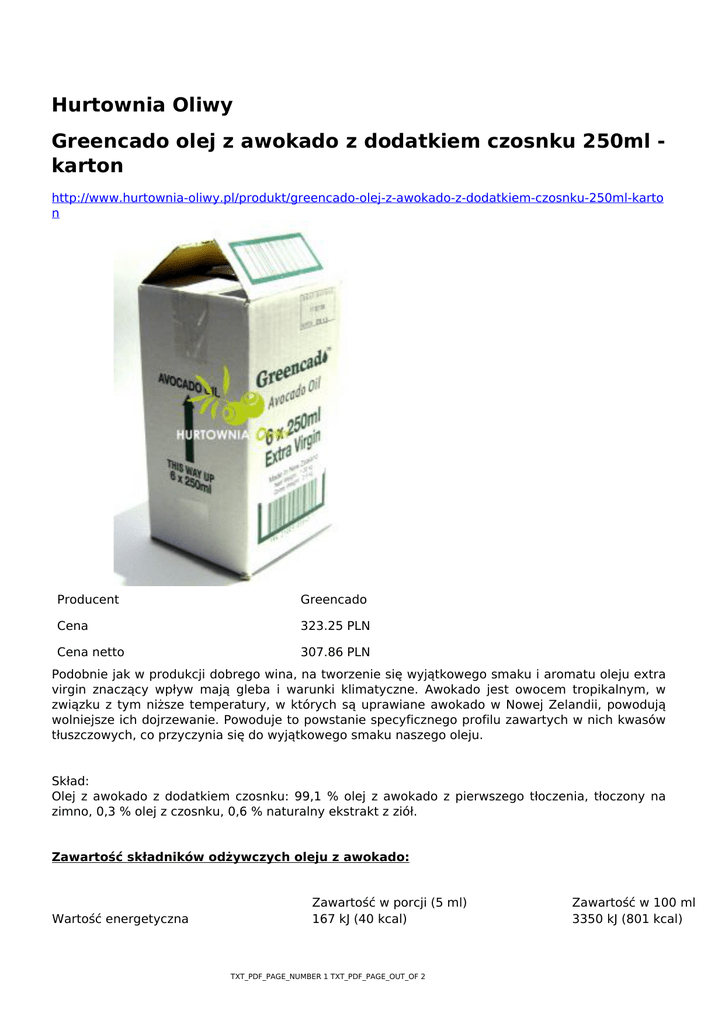 Hurtownia Oliwy Greencado olej z awokado z dodatkiem czosnku 250ml karton http://www.hurtownia-oliwy.pl/produkt/greencado-olej-z-awokado-z-dodatkiem-czosnku-250ml-karto n Producent Greencado Cena 323.25 PLN Cena netto 307.86 PLN Podobnie jak w produkcji dobrego wina, na tworzenie się wyjątkowego smaku i aromatu oleju extra virgin znaczący wpływ mają gleba i warunki klimatyczne. Awokado jest owocem tropikalnym, w związku z tym niższe temperatury, w których są uprawiane awokado w Nowej Zelandii, powodują wolniejsze ich dojrzewanie. Powoduje to powstanie specyficznego profilu zawartych w nich kwasów tłuszczowych, co przyczynia się do wyjątkowego smaku naszego oleju. Skład: Olej z awokado z dodatkiem czosnku: 99,1 % olej z awokado z pierwszego tłoczenia, tłoczony na zimno, 0,3 % olej z czosnku, 0,6 % naturalny ekstrakt z ziół. Zawartość składników odżywczych oleju z awokado: Wartość energetyczna Zawartość w porcji (5 ml) 167 kJ (40 kcal) TXT_PDF_PAGE_NUMBER 1 TXT_PDF_PAGE_OUT_OF 2 Zawartość w 100 ml 3350 kJ (801 kcal) Białko Tłuszcz, w sumie nasycone 0g 4,5 g 0,6 g 0g 90 g 13 g trans 0g 0g jednonienasycone 0,4 g 8 g wielonienasycone Węglowodany Cukry Sód Witamina E W kartonie znajduje się 6 sztuk. 3,5 g 0 g 0 g 0,3 mg (maksymalnie) 1 mg 69 g 0 g 0 g 5 mg (maksymalnie) 12 mg Osoby zainteresowane stałą współpracą i/lub zakupem większej partii towaru, proszę o kontakt via e-mail - prześlemy ofertę cenową, skorygowaną odpowiednio pod zapotrzebowanie klienta. TXT_PDF_PAGE_NUMBER 2 TXT_PDF_PAGE_OUT_OF 2