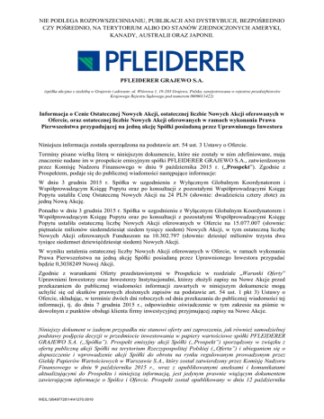 NIE PODLEGA ROZPOWSZECHNIANIU, PUBLIKACJI ANI DYSTRYBUCJI, BEZPOŚREDNIO CZY POŚREDNIO, NA TERYTORIUM ALBO DO STANÓW ZJEDNOCZONYCH AMERYKI, KANADY, AUSTRALII ORAZ JAPONII. PFLEIDERER GRAJEWO S.A. (spółka akcyjna z siedzibą w Grajewie i adresem: ul. Wiórowa 1, 19-203 Grajewo, Polska, zarejestrowana w rejestrze przedsiębiorców Krajowego Rejestru Sądowego pod numerem 0000011422) Informacja o Cenie Ostatecznej Nowych Akcji, ostatecznej liczbie Nowych Akcji oferowanych w Ofercie, oraz ostatecznej liczbie Nowych Akcji oferowanych w ramach wykonania Prawa Pierwszeństwa przypadającej na jedną akcję Spółki posiadaną przez Uprawnionego Inwestora Niniejsza informacja została sporządzona na podstawie art. 54 ust. 3 Ustawy o Ofercie. Terminy pisane wielką literą w niniejszym dokumencie, które nie zostały w nim zdefiniowane, mają znaczenie nadane im w prospekcie emisyjnym spółki PFLEIDERER GRAJEWO S.A., zatwierdzonym przez Komisję Nadzoru Finansowego w dniu 9 października 2015 r. („Prospekt”). Zgodnie z Prospektem, podaje się do publicznej wiadomości następujące informacje: W dniu 3 grudnia 2015 r. Spółka w uzgodnieniu z Wyłącznym Globalnym Koordynatorem i Współprowadzącym Księgę Popytu oraz po konsultacji z pozostałymi Współprowadzącymi Księgę Popytu ustaliła Cenę Ostateczną Nowych Akcji na 24 PLN (słownie: dwadzieścia cztery złote) za jedną Nową Akcję. Ponadto w dniu 3 grudnia 2015 r. Spółka w uzgodnieniu z Wyłącznym Globalnym Koordynatorem i Współprowadzącym Księgę Popytu oraz po konsultacji z pozostałymi Współprowadzącymi Księgę Popytu ustaliła ostateczną liczbę Nowych Akcji oferowanych w Ofercie na 15.077.007 (słownie: piętnaście milionów siedemdziesiąt siedem tysięcy siedem) Nowych Akcji, w tym ostateczną liczbę Nowych Akcji oferowanych Funduszom na 10.302.797 (słownie: dziesięć milionów trzysta dwa tysiące siedemset dziewięćdziesiąt siedem) Nowych Akcji. W wyniku ustalenia ostatecznej liczby Nowych Akcji oferowanych w Ofercie, w ramach wykonania Prawa Pierwszeństwa na jedną akcję Spółki posiadaną przez Uprawnionego Inwestora przypadać będzie 0,3038249 Nowej Akcji. Zgodnie z warunkami Oferty przedstawionymi w Prospekcie w rozdziale „Warunki Oferty” Uprawnieni Inwestorzy oraz Inwestorzy Instytucjonalni, którzy złożyli zapisy na Nowe Akcje przed przekazaniem do publicznej wiadomości informacji zawartych w niniejszym dokumencie mogą uchylić się od skutków prawnych złożonych zapisów na podstawie art. 54 ust. 1 pkt 3) Ustawy o Ofercie, składając, w terminie dwóch dni roboczych od dnia przekazania do publicznej wiadomości tej informacji, tj. do dnia 7 grudnia 2015 r., odpowiednie oświadczenie w tym zakresie na piśmie w dowolnym z punktów obsługi klienta firmy inwestycyjnej przyjmującej zapisy na Nowe Akcje. Niniejszy dokument w żadnym przypadku nie stanowi oferty ani zaproszenia, jak również samodzielnej podstawy podjęcia decyzji w przedmiocie inwestowania w papiery wartościowe spółki PFLEIDERER GRAJEWO S.A. („Spółka”). Prospekt emisyjny akcji Spółki („Prospekt”) sporządzony w związku z ofertą publiczną akcji Spółki na terytorium Rzeczypospolitej Polskiej („Oferta”) i ubieganiem się o dopuszczenie i wprowadzenie akcji Spółki do obrotu na rynku regulowanym prowadzonym przez Giełdę Papierów Wartościowych w Warszawie S.A., który został zatwierdzony przez Komisję Nadzoru Finansowego w dniu 9 października 2015 r., wraz z opublikowanymi aneksami i komunikatami aktualizującymi do Prospektu i niniejszą informacją, jest jedynym prawnie wiążącym dokumentem zawierającym informacje o Spółce i Ofercie. Prospekt został opublikowany w dniu 12 października WEIL:\95497720\14\41270.0010 2015 r. na stronie internetowej Spółki (www.pfleiderer.pl) oraz dodatkowo, w celach informacyjnych na stronie internetowej Oferującego (www.dm.pkobp.pl). Niniejszy dokument nie jest przeznaczony do rozpowszechniania, bezpośrednio albo pośrednio, na terytorium albo do Stanów Zjednoczonych Ameryki, Kanady, Australii oraz Japonii, ani w innych państwach, w których publiczne rozpowszechnianie informacji zawartych w niniejszym dokumencie może podlegać ograniczeniom lub być zakazane przez prawo. Informacje zawarte w niniejszym dokumencie nie stanowią oferty sprzedaży ani zaproszenia do nabywania papierów wartościowych Spółki. Niniejszy materiał nie stanowi rekomendacji w rozumieniu Rozporządzenia Ministra Finansów z dnia 19 października 2005 r. w sprawie informacji stanowiących rekomendacje dotyczące instrumentów finansowych, ich emitentów lub wystawców. Niniejszy komunikat nie jest przeznaczony do rozpowszechniania, bezpośrednio albo pośrednio, na terytorium albo do Stanów Zjednoczonych Ameryki albo w innych państwach, w których publiczne rozpowszechnianie informacji zawartych w niniejszym komunikacie może podlegać ograniczeniom lub być zakazane przez prawo. Papiery wartościowe, o których mowa w niniejszym komunikacie, nie zostały i nie zostaną zarejestrowane na podstawie Amerykańskiej Ustawy o Papierach Wartościowych z 1933 r. ze zmianami (ang. U.S. Securities Act of 1933) ani przez żaden inny organ regulujący obrót papierami wartościowymi jakiegokolwiek innego stanu lub jurysdykcji w Stanach Zjednoczonych Ameryki, i nie mogą być oferowane ani zbywane na terytorium Stanów Zjednoczonych Ameryki za wyjątkiem transakcji niepodlegających obowiązkowi rejestracyjnemu przewidzianemu w Amerykańskiej Ustawie o Papierach Wartościowych lub na podstawie wyjątku od takiego obowiązku rejestracyjnego. Informacje zawarte w niniejszym komunikacie nie stanowią oferty zakupu ani zaproszenia do nabywania; nie jest również dozwolona sprzedaż papierów wartościowych wskazanych w niniejszym komunikacie w jakiejkolwiek jurysdykcji, w której taka oferta lub zaproszenie do nabywania byłyby nielegalne przed uprzednią rejestracją, zw