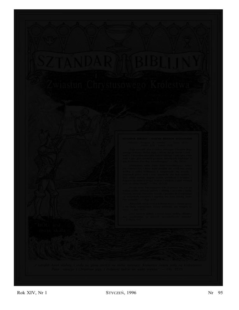 SZTANDAR SZTANDAR BIBLIJNY — NASZYM JEDYNYM SZTANDAREM SZTANDAREM „Podnieście chora˛giew do narodów” — Izajasz 62:10; Izajasz 8:20; Łukasz 11:28. „Tedy wyszedł głos z stolicy, mówia˛cy: Chwalcie Boga naszego wszyscy słudzy jego, i którzy sie˛ go boicie, i mali i wielcy. I słyszałem głos jako ludu wielkiego, i jako głos wielu wód, i jako głos mocnych gromów, mówia˛cych: Halleluja! iż uja˛ł Królestwo Pan Bóg wszechmoga˛cy” — Obj. 19:5,6. „Dzie˛kujemy tobie, Panie Boże wszechmoga˛cy, któryś jest, i któryś był, i który masz przyjść! żeś wzia˛ł moc swoja˛ wielka˛, i uja˛łeś królestwo; I rozgniewały sie˛ narody, i przyszedł gniew twój i czas umarłych, aby byli sa˛dzeni, i abyś oddał zapłate˛ sługom twoim, prorokom i świe˛tym, i boja˛cym sie˛ imienia twego, małym i wielkim, i abyś wytracił tych, co psuja˛ ziemie˛” — Obj. 11:17,18. „Bo tak mówi Pan zaste˛pów: Oto Ja jeszcze raz, a to po małym czasie, porusze˛ niebem i ziemia˛, i morzem i sucha˛; Porusze˛, mówie˛, wszystkie narody, i przyjda˛ do Poża˛danego od wszystkich narodów; i napełnie˛ ten dom chwała˛, mówi Pan zaste˛pów” — Agg. 2:7,8. „Albowiem oto Ja tworze˛ niebiosa nowe, i ziemie˛ nowa˛, a nie be˛da˛ wspominane rzeczy pierwsze, ani wsta˛pia˛ na serce” — Izaj. 65:17. „Lecz nowych niebios i nowej ziemi według obietnicy jego oczekujemy, w których sprawiedliwość mieszka” — 2 Piotra 3:13. „I zatra˛bił Anioł siódmy, i stały sie˛ głosy wielkie na niebie mówia˛ce: Królestwa świata stały sie˛ królestwami Pana naszego i Chrystusa jego, i królować be˛dzie na wieki wieków” — Obj. 11:15. Rok XIV, Nr 1 STYCZEŃ, 1996 Nr 95 i Zwiastun Chrystusowego Królestwa MIESIE˛CZNIK. Wydawany przez ŚWIECKI RUCH MISYJNY „E P I F A N I A” w Nowym Dworze Mazowieckim. Redaktor: Bernard Hedman, Chester Springs, Pa. 19425, USA. Redaktor odpowiedzialny w Polsce: Piotr Woźnicki, ul. Zdobywców Kosmosu 17, 05–100 Nowy Dwór Maz. WERSET NASZEGO GODŁA „Przestawając na tym, co macie." (Żyd. 13 : 5) D UCHEM TEGO WIEKU jest niepokój. Prawie każdy poszukuje jakiejś zmiany w życiu. Stąd celowość naszego artykułu. Zacytowany werset mówi o zadowoleniu, które jest trzeciorzędną łaską. Rezygnacja jest jej cechą rozwijaną w niepomyślnych warunkach, lecz w normalnych okolicznościach jest jej cechą określoną słowem — zadowolenie. Chcielibyśmy zacytować pewne wersety Pisma Świętego, aby pokazać, że tak się też ma sprawa w odniesieniu do zadowolenia. Z licznych wersetów Pisma Św. wybraliśmy kilka: Lepsze jest trochę ze sprawiedliwością, niż wiele dochodów z niesprawiedliwością (Przyp. 16:8). Lepszy jest kęs suchego chleba a w pokoju, niżeli pełen dom nabitego bydła ze swarem (Przyp. 17:1). Serce wesołe oczerstwia jako lekarstwo (Przyp. 17:22). Marność i słowo kłamliwe oddal ode mnie; ubóstwa i bogactwa nie dawaj mi; żyw mię tylko pokarmem według potrzeby mojej (Przyp. 30:8). Lepsza jest pełna garść z pokojem, niżeli obie garści pełne z pracą i z udręczeniem ducha. (Kazn. 4:6). Pytali Go też i żołnierze, mówiąc: A my co czynić będziemy? I rzekł do nich: Nikomu gwałtu nie czyńcie, i nikogo nie potwarzajcie, a przestawajcie na żołdzie waszym. (Łuk. 3:14). Jednak jako każdemu udzielił Bóg, jako każdego powołał Pan, tak niech postępuje ... Każdy w tym powołaniu, w którym powołany jest, niech zostaje. Jesteś powołany niewolnikiem, nie dbajże na to; ale jeśli też możesz być wolnym, raczej wolności używaj. Każdy tedy, jakim jest powołany, bracia! Takim niechaj zostaje przed Bogiem (1 Kor. 7:17,20,21,24). Nie żebym to mówił dla niedostatku; bomci się ja nauczył, na tym przestawać, co mam. Umiem i uniżać się, umiem i obfitować; wszędy i we wszystkich rzeczach jestem wyćwiczony, i nasyconym być, i łaknąć, i obfitować, i niedostatek cierpieć (Fil. 4:11,12). A jestci wielki zysk pobożność z przestawaniem na swym; Albowiem niceśmy nie przynieśli na ten świat, bez pochyby że też wynieść nic nie możemy; Ale mając żywność i odzienie, na tym przestawać mamy. (1 Tym. 6:6-8). Przestawając na tym, co macie; boć sam powiedział: Nie zaniecham cię, ani cię opuszczę. (Żyd. 13:5). Możemy przytoczyć pewne przykłady okazywania zadowolenia: Ezaw odrzucający dar Jakuba (1 Moj. 33:9); Barsylaj odmawiający Dawidowi towarzyszenia mu do Jeruzalem (2 Sam. 19:33—37); Sunamitka, która nie skorzystała ze sposobności poproszenia o coś Elizeusza (2 Król. 4:13). ROZWAŻENIE PRZECIWIEŃSTWA ZADOWOLENIA Zastanowienie się nad przeciwieństwem zadowolenia, być może, umożliwi nam nieco lepsze zrozumienie tego przedmiotu, gdyż wiemy, że nasze umysły często wyciągają wnioski na podstawie kontrastu. Bezpośrednim przeciwieństwem zadowolenia jest szemranie, narzekanie i uskarżanie się w pomyślnych doświadczeniach. Lecz w niepomyślnych doświadczeniach może wystąpić buntowniczość, skrajne niezadowolenie i zgryzota. Te przeciwności są wszędzie i zawsze ciężkie do zniesienia, zwłaszcza gdy przeważa poczucie nieszczęśliwości, związane z zarobkami i warunkami bytowymi, ustrojem politycznym, szczególnymi zainteresowaniami, artykułami konsumpcyjnymi, produkcją, odsetkami itp. Innym przeciwieństwem może być opieszałość, letarg lub bierność różniąca się od wysiłku — innymi słowy, zbyt dużo zadowolenia kosztem wyższych pierwszorzędnych łask, takich jak samokontrola i cierpliwość. SKŁADNIKI ZADOWOLENIA Składnikami zadowolenia są: w niepomyślnych doświadczeniach — rezygnacja, w pomyślnych doświadczeniach — zadośćuczynienie. Widzimy więc, że składa się ono z dwóch części. Kiedy występują doświadczenia ze złem zadowolenie się poddaje rezygnacji w pełnieniu woli Pańskiej wyrażonej w Jego Słowie, Duchu i opatrznościach, kiedy zaś doświadczenia 
