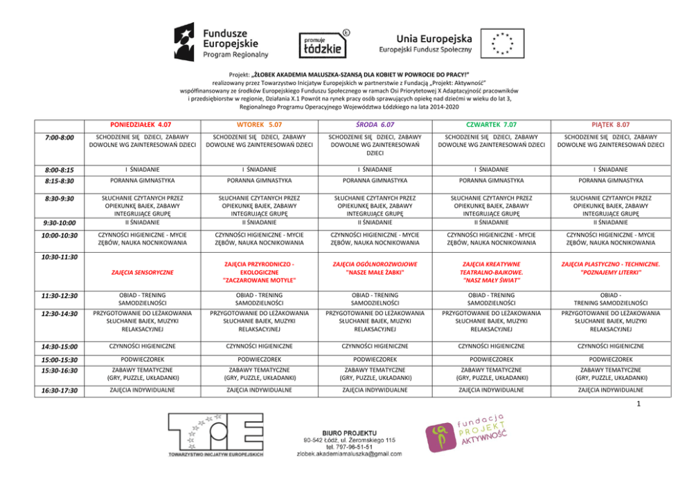 Projekt: „ŻŁOBEK AKADEMIA MALUSZKA-SZANSĄ DLA KOBIET W POWROCIE DO PRACY!” realizowany przez Towarzystwo Inicjatyw Europejskich w partnerstwie z Fundacją „Projekt: Aktywność” współfinansowany ze środków Europejskiego Funduszu Społecznego w ramach Osi Priorytetowej X Adaptacyjność pracowników i przedsiębiorstw w regionie, Działania X.1 Powrót na rynek pracy osób sprawujących opiekę nad dziećmi w wieku do lat 3, Regionalnego Programu Operacyjnego Województwa Łódzkiego na lata 2014-2020 7:00-8:00 PONIEDZIAŁEK 4.07 WTOREK 5.07 ŚRODA 6.07 CZWARTEK 7.07 PIĄTEK 8.07 SCHODZENIE SIĘ DZIECI, ZABAWY DOWOLNE WG ZAINTERESOWAŃ DZIECI SCHODZENIE SIĘ DZIECI, ZABAWY DOWOLNE WG ZAINTERESOWAŃ DZIECI SCHODZENIE SIĘ DZIECI, ZABAWY DOWOLNE WG ZAINTERESOWAŃ DZIECI SCHODZENIE SIĘ DZIECI, ZABAWY DOWOLNE WG ZAINTERESOWAŃ DZIECI SCHODZENIE SIĘ DZIECI, ZABAWY DOWOLNE WG ZAINTERESOWAŃ DZIECI I ŚNIADANIE I ŚNIADANIE I ŚNIADANIE I ŚNIADANIE I ŚNIADANIE PORANNA GIMNASTYKA PORANNA GIMNASTYKA PORANNA GIMNASTYKA PORANNA GIMNASTYKA PORANNA GIMNASTYKA SŁUCHANIE CZYTANYCH PRZEZ OPIEKUNKĘ BAJEK, ZABAWY INTEGRUJĄCE GRUPĘ II ŚNIADANIE SŁUCHANIE CZYTANYCH PRZEZ OPIEKUNKĘ BAJEK, ZABAWY INTEGRUJĄCE GRUPĘ II ŚNIADANIE SŁUCHANIE CZYTANYCH PRZEZ OPIEKUNKĘ BAJEK, ZABAWY INTEGRUJĄCE GRUPĘ II ŚNIADANIE SŁUCHANIE CZYTANYCH PRZEZ OPIEKUNKĘ BAJEK, ZABAWY INTEGRUJĄCE GRUPĘ II ŚNIADANIE SŁUCHANIE CZYTANYCH PRZEZ OPIEKUNKĘ BAJEK, ZABAWY INTEGRUJĄCE GRUPĘ II ŚNIADANIE CZYNNOŚCI HIGIENICZNE - MYCIE ZĘBÓW, NAUKA NOCNIKOWANIA CZYNNOŚCI HIGIENICZNE - MYCIE ZĘBÓW, NAUKA NOCNIKOWANIA CZYNNOŚCI HIGIENICZNE - MYCIE ZĘBÓW, NAUKA NOCNIKOWANIA CZYNNOŚCI HIGIENICZNE - MYCIE ZĘBÓW, NAUKA NOCNIKOWANIA CZYNNOŚCI HIGIENICZNE - MYCIE ZĘBÓW, NAUKA NOCNIKOWANIA ZAJĘCIA SENSORYCZNE ZAJĘCIA PRZYRODNICZO EKOLOGICZNE "ZACZAROWANE MOTYLE" ZAJĘCIA OGÓLNOROZWOJOWE "NASZE MAŁE ŻABKI" ZAJĘCIA KREATYWNE TEATRALNO-BAJKOWE. "NASZ MAŁY ŚWIAT" ZAJĘCIA PLASTYCZNO - TECHNICZNE. "POZNAJEMY LITERKI" 11:30-12:30 OBIAD - TRENING SAMODZIELNOŚCI OBIAD - TRENING SAMODZIELNOŚCI OBIAD - TRENING SAMODZIELNOŚCI OBIAD - TRENING SAMODZIELNOŚCI OBIAD TRENING SAMODZIELNOŚCI 12:30-14:30 PRZYGOTOWANIE DO LEŻAKOWANIA SŁUCHANIE BAJEK, MUZYKI RELAKSACYJNEJ PRZYGOTOWANIE DO LEŻAKOWANIA SŁUCHANIE BAJEK, MUZYKI RELAKSACYJNEJ PRZYGOTOWANIE DO LEŻAKOWANIA SŁUCHANIE BAJEK, MUZYKI RELAKSACYJNEJ PRZYGOTOWANIE DO LEŻAKOWANIA SŁUCHANIE BAJEK, MUZYKI RELAKSACYJNEJ PRZYGOTOWANIE DO LEŻAKOWANIA SŁUCHANIE BAJEK, MUZYKI RELAKSACYJNEJ 14:30-15:00 CZYNNOŚCI HIGIENICZNE CZYNNOŚCI HIGIENICZNE CZYNNOŚCI HIGIENICZNE CZYNNOŚCI HIGIENICZNE CZYNNOŚCI HIGIENICZNE 15:00-15:30 15:30-16:30 PODWIECZOREK PODWIECZOREK PODWIECZOREK PODWIECZOREK PODWIECZOREK ZABAWY TEMATYCZNE (GRY, PUZZLE, UKŁADANKI) ZABAWY TEMATYCZNE (GRY, PUZZLE, UKŁADANKI) ZABAWY TEMATYCZNE (GRY, PUZZLE, UKŁADANKI) ZABAWY TEMATYCZNE (GRY, PUZZLE, UKŁADANKI) ZABAWY TEMATYCZNE (GRY, PUZZLE, UKŁADANKI) ZAJĘCIA INDYWIDUALNE ZAJĘCIA INDYWIDUALNE ZAJĘCIA INDYWIDUALNE ZAJĘCIA INDYWIDUALNE ZAJĘCIA INDYWIDUALNE 8:00-8:15 8:15-8:30 8:30-9:30 9:30-10:00 10:00-10:30 10:30-11:30 16:30-17:30 1 Projekt: „ŻŁOBEK AKADEMIA MALUSZKA-SZANSĄ DLA KOBIET W POWROCIE DO PRACY!” realizowany przez Towarzystwo Inicjatyw Europejskich w partnerstwie z Fundacją „Projekt: Aktywność” współfinansowany ze środków Europejskiego Funduszu Społecznego w ramach Osi Priorytetowej X Adaptacyjność pracowników i przedsiębiorstw w regionie, Działania X.1 Powrót na rynek pracy osób sprawujących opiekę nad dziećmi w wieku do lat 3, Regionalnego Programu Operacyjnego Województwa Łódzkiego na lata 2014-2020 PONIEDZIAŁEK 11.07 7:00-8:00 8:00-8:15 8:15-8:30 8:30-9:30 9:30-10:00 10:00-10:30 SCHODZENIE SIĘ DZIECI, ZABAWY DOWOLNE WG ZAINTERESOWAŃ DZIECI WTOREK 12.07 ŚRODA 13.07 CZWARTEK 14.07 PIĄTEK 15.07 SCHODZENIE SIĘ DZIECI, ZABAWY DOWOLNE WG ZAINTERESOWAŃ DZIECI SCHODZENIE SIĘ DZIECI, ZABAWY DOWOLNE WG ZAINTERESOWAŃ DZIECI SCHODZENIE SIĘ DZIECI, ZABAWY DOWOLNE WG ZAINTERESOWAŃ DZIECI I ŚNIADANIE I ŚNIADANIE SCHODZENIE SIĘ DZIECI, ZABAWY DOWOLNE WG ZAINTERESOWAŃ DZIECI I ŚNIADANIE I ŚNIADANIE I ŚNIADANIE PORANNA GIMNASTYKA PORANNA GIMNASTYKA PORANNA GIMNASTYKA PORANNA GIMNASTYKA PORANNA GIMNASTYKA SŁUCHANIE CZYTANYCH PRZEZ OPIEKUNKĘ BAJEK, ZABAWY INTEGRUJĄCE GRUPĘ II ŚNIADANIE SŁUCHANIE CZYTANYCH PRZEZ OPIEKUNKĘ BAJEK, ZABAWY INTEGRUJĄCE GRUPĘ II ŚNIADANIE SŁUCHANIE CZYTANYCH PRZEZ OPIEKUNKĘ BAJEK, ZABAWY INTEGRUJĄCE GRUPĘ II ŚNIADANIE SŁUCHANIE CZYTANYCH PRZEZ OPIEKUNKĘ BAJEK, ZABAWY INTEGRUJĄCE GRUPĘ II ŚNIADANIE SŁUCHANIE CZYTANYCH PRZEZ OPIEKUNKĘ BAJEK, ZABAWY INTEGRUJĄCE GRUPĘ II ŚNIADANIE CZYNNOŚCI HIGIENICZNE - MYCIE ZĘBÓW, NAUKA NOCNIKOWANIA CZYNNOŚCI HIGIENICZNE - MYCIE ZĘBÓW, NAUKA NOCNIKOWANIA CZYNNOŚCI HIGIENICZNE - MYCIE ZĘBÓW, NAUKA NOCNIKOWANIA CZYNNOŚCI HIGIENICZNE - MYCIE ZĘBÓW, NAUKA NOCNIKOWANIA CZYNNOŚCI HIGIENICZNE - MYCIE ZĘBÓW, NAUKA NOCNIKOWANIA ZAJĘCIA PRZYRODNICZO EKOLOGICZNE "COŚ I NIC , CZYLI CO TO JEST POWIETRZE" ZAJĘCIA OGÓLNOROZWOJOWE "LETNIA WYPRAWA" ZAJĘCIA KREATYWNE TEATRALNO-BAJKOWE. "EMOCJE" ZAJĘCIA PLASTYCZNO - TECHNICZNE "DOPASOWYWANIE KSZTAŁTÓW" 10:30-11:30 ZAJĘCIA SENSORYCZNE 11:30-12:30 OBIAD - TRENING SAMODZIELNOŚCI OBIAD - TRENING SAMODZIELNOŚCI OBIAD - TRENING SAMODZIELNOŚCI OBIAD - TRENING SAMODZIELNOŚCI OBIAD TRENING SAMODZIELNOŚCI 12:30-14:30 PRZYGOTOWANIE DO LEŻAKOWANIA SŁUCHANIE BAJEK, MUZYKI RELAKSACYJNEJ CZYNNOŚCI HIGIENICZNE PRZYGOTOWANIE DO LEŻAKOWANIA SŁUCHANIE BAJEK, MUZYKI RELAKSACYJNEJ CZYNNOŚCI HIGIENICZNE PRZYGOTOWANIE DO LEŻAKOWANIA SŁUCHANIE BAJEK, MUZYKI RELAKSACYJNEJ CZYNNOŚCI HIGIENICZNE PRZYGOTOWANIE DO LEŻAKOWANIA SŁUCHANIE BAJEK, MUZYKI RELAKSACYJNEJ CZYNNOŚCI HIGIENICZNE PRZYGOTOWANIE DO LEŻAKOWANIA SŁUCHANIE BAJEK, MUZYKI RELAKSACYJNEJ CZYNNOŚCI HIGIENICZNE PODWIECZOREK PODWIECZOREK PODWIECZOREK PO