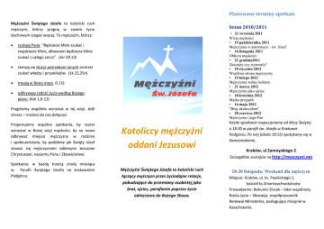 Planowane terminy spotkań: Mężczyźni Świętego Józefa to katolicki ruch mężczyzn, którzy pragną w swoim życiu duchowym czegoś więcej. To mężczyźni, którzy: Sezon 2010/2011 • 21 września 2011 Wizja męskości • 19 października 2011 Mężczyzna w autorytecie - św. Józef • 16 listopada 2011 Oblicza męskości • 21 grudnia2011 Zawzięty czy wytrwały? • 18 stycznia 2012 Wrażliwa strona mężczyzny • 15 lutego 2012 Mężczyzna wobec kobiety • 21 marca 2012 Mężczyzna jako ojciec • 18 kwietnia 2012 Męska przyjaźń • 16 maja 2012 "Bieg ukończyłem" • 20 czerwca 2012 Mężczyzna i jego Pan szukają Pana: “Będziecie Mnie szukad i znajdziecie Mnie, albowiem będziecie Mnie szukad z całego serca”. (Jer 29,13) starają się służyd potrzebom innych zamiast szukad władzy i przywilejów. (Łk 22,25n) trwają w Bożej mocy (J 15) odkrywają radośd życia według Bożego planu. (Kol 1,9-12) Pragniemy wspólnie wzrastad w tej wizji. Jeśli chcesz – możesz do nas dołączyd. Proponujemy wspólne spotkania, by razem wzrastad w Bożej wizji męskości, by na nowo odkrywad miejsce mężczyzny w rodzinie i społeczeostwie, by podobnie jak Święty Józef stawad się mężczyznami oddanymi Jezusowi Chrystusowi, naszemu Panu i Zbawicielowi. Spotkania: w każdą trzecią środę miesiąca w Parafii Świętego Józefa na krakowskim Podgórzu. Katoliccy mężczyźni oddani Jezusowi Mężczyźni Świętego Józefa to katolicki ruch łączący mężczyzn przez życiodajne relacje, pobudzające do przemiany osobistej jako brat, ojciec, parafianin poprzez życie odniesione do Bożego Słowa. Każde spotkanie rozpoczynamy od Mszy Świętej o 18:30 w parafii św. Józefa w Krakowie Podgórzu. Po niej (około 19:15) spotykamy się w Kamieniołomie. Kraków, ul Zamoyskiego 2 Szczegółów szukajcie na http://mezczyzni.net 18-20 listopada: Weekend dla mężczyzn Miejsce: Kraków, ul. ks. Pawlickiego 1, kościół ks Zmartwychwstaoców Prowadzenie: Bohumir Zivcak – lider wspólnoty Rzeka życia – Słowacja, współpracownik Renewal Ministeries, posługujący misyjnie w Kazachstanie. Św. Józef – opiekun Jezusa Święty Józef był mężem Maryi. Jego postad znamy ze stron Ewangelii. Całe swoje życie św. Józef spędził jako rękodzielnik i wyrobnik w ciężkiej zarobkowej pracy. Ewangelie określają go mianem faber, przez co rozumiano wyrobnika - rzemieślnika od naprawy narzędzi rolniczych, przedmiotów drewnianych itp. Były to więc prace związane z budownictwem, z robotą w drzewie i w żelazie. Józef wykonywał na zamówienie bardzo ciężkie prace i z nich utrzymywał Najświętszą Rodzinę. Ta właśnie praca stała się równocześnie dla niego źródłem uświęcenia. Był on mistykiem nie przez kontemplację, przez uczynki pokutne czy przez dzieła miłosierdzia, ale przez pracę. Praca go uświęciła, gdyż wykonywał ją rzetelnie, nie żądał za nią wygórowanych cen, wypełniał ją cicho i pokornie jako zleconą sobie od Boga misję na ziemi. Spełniał ją zapatrzony w Jezusa i Maryję. Dla nich żył, dla nich się trudził, dla nich był gotów do najwyższych ofiar. Równocześnie był charyzmatykiem – mężem otwartym na działanie i prowadzenie Ducha Świętego. To właśnie dzięki swojej wrażliwości na Boga mógł w sposób doskonały zrealizowad plan Boga i zapewnid ochronę Jezusowi w czasie największego zagrożenia. Taki powinien byd styl pracy każdego chrześcijaoskiego mężczyzny. Praca ma go uświęcad, równocześnie pielęgnując relację z Bogiem w Duchu Świętym powinien on wzrastad we wrażliwości duchowej i obecności Bożej. Takie połączenie pozwala najpełniej rozwinąd jego uzdolnienia, energię, inicjatywę. Jest szkołą wielu cnót osobistych i społecznych, takich jak na przykład wytrzymałośd, solidarnośd, cierpliwośd, męstwo, odwaga i ład, współpraca, współzawodnictwo. Józef pochodził z rodu króla Dawida. Wykazuje to św. Mateusz w genealogii przodków św. Józefa. Na podstawie: brewiarz.pl Dziękczynienie za ochronę św. Józefa Boże, nieskooczenie dobry, który stworzyłeś wszystko poprzez Swoją miłośd i władasz światem w swej niewysłowionej opatrzności, z głębi serca dziękujemy Ci za Twe niezliczone łaski, które nam dajesz, a szczególnie za przywilej przyjęcia Św. Józefa za naszego orędownika, który z miłością troszczy się o nasze dobro. Z pomocą Twej łaski we wszystkim naśladując św. Józefa pragniemy okazad się godnymi Twojej przychylności. Obyśmy byli godni nazywad się dziedmi Boga, bradmi Chrystusa i synami Maryi. “Boży Mężczyzna w XXI wieku Spotkanie mężczyzn Amen. (Joseph: The Man Closest to Jesus, St. Paul Editions, 1962.) ZAPRASZAMY Godz. 18:30 Msza święta w Kościele, po niej spotkanie w Kamieniołomie. http://www.mezczyzni.net