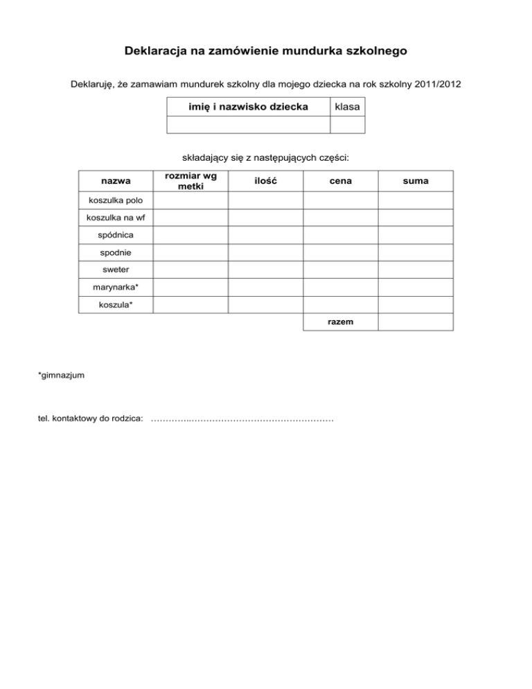 Deklaracja na zamówienie mundurka szkolnego Deklaruję, że zamawiam mundurek szkolny dla mojego dziecka na rok szkolny 2011/2012 imię i nazwisko dziecka klasa składający się z następujących części: nazwa rozmiar wg metki ilość cena koszulka polo koszulka na wf spódnica spodnie sweter marynarka* koszula* razem *gimnazjum tel. kontaktowy do rodzica: …………..………………………………………… suma