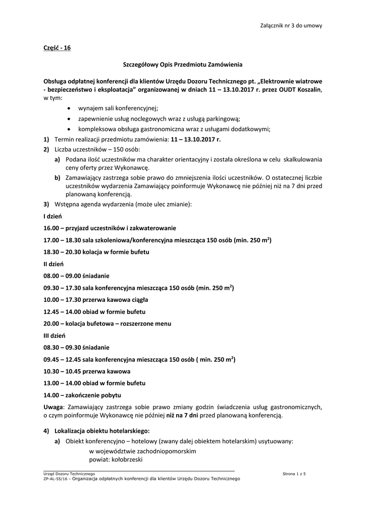 Załącznik nr 3 do umowy Część - 16 Szczegółowy Opis Przedmiotu Zamówienia Obsługa odpłatnej konferencji dla klientów Urzędu Dozoru Technicznego pt. „Elektrownie wiatrowe - bezpieczeństwo i eksploatacja” organizowanej w dniach 11 – 13.10.2017 r. przez OUDT Koszalin, w tym: wynajem sali konferencyjnej; zapewnienie usług noclegowych wraz z usługą parkingową; kompleksowa obsługa gastronomiczna wraz z usługami dodatkowymi; 1) Termin realizacji przedmiotu zamówienia: 11 – 13.10.2017 r. 2) Liczba uczestników – 150 osób: a) Podana ilość uczestników ma charakter orientacyjny i została określona w celu skalkulowania ceny oferty przez Wykonawcę. b) Zamawiający zastrzega sobie prawo do zmniejszenia ilości uczestników. O ostatecznej liczbie uczestników wydarzenia Zamawiający poinformuje Wykonawcę nie później niż na 7 dni przed planowaną konferencją. 3) Wstępna agenda wydarzenia (może ulec zmianie): I dzień 16.00 – przyjazd uczestników i zakwaterowanie 17.00 – 18.30 sala szkoleniowa/konferencyjna mieszcząca 150 osób (min. 250 m2) 18.30 – 20.30 kolacja w formie bufetu II dzień 08.00 – 09.00 śniadanie 09.30 – 17.30 sala konferencyjna mieszcząca 150 osób (min. 250 m2) 10.00 – 17.30 przerwa kawowa ciągła 12.45 – 14.00 obiad w formie bufetu 20.00 – kolacja bufetowa – rozszerzone menu III dzień 08.30 – 09.30 śniadanie 09.45 – 12.45 sala konferencyjna mieszcząca 150 osób ( min. 250 m2) 10.30 – 10.45 przerwa kawowa 13.00 – 14.00 obiad w formie bufetu 14.00 – zakończenie pobytu Uwaga: Zamawiający zastrzega sobie prawo zmiany godzin świadczenia usług gastronomicznych, o czym poinformuje Wykonawcę nie później niż na 7 dni przed planowaną konferencją. 4) Lokalizacja obiektu hotelarskiego: a) Obiekt konferencyjno – hotelowy (zwany dalej obiektem hotelarskim) usytuowany: w województwie zachodniopomorskim powiat: kołobrzeski _________________________________________________________________________ Urząd Dozoru Technicznego ZP-AL-55/16 – Organizacja odpłatnych konferencji dla klientów Urzędu Dozoru Technicznego Strona 1 z 5 b) Obiekt hotelarski nie powinien znajdować się bezpośrednio przy trasie szybkiego ruchu lub w miejscu o natężonym hałasie. c) Obiekt hotelarski powinien znajdować się bezpośrednio przy plaży w pasie nadmorskim. 5) Standard i ogólne wymagania Zamawiającego w stosunku do zaoferowanego obiektu hotelarskiego: a) Wykonawca zapewni realizację usług w obiekcie hotelarskim o standardzie min pięciu gwiazdek, tzn. zapewniony obiekt hotelarski musi spełniać kryteria określone dla hoteli pięciogwiazdkowych – ***** zgodnie z załącznikiem nr 1 do Rozporządzenia Ministra Gospodarki i Pracy z dnia 19 sierpnia 2004 r. w sprawie obiektów hotelarskich i innych obiektów, w których są świadczone usługi hotelarskie (Dz. U. z 2006 r. Nr 22, poz.169 z pózn.zm.) b) Obiekt hotelarski powinien być oddany do użytku lub wyremontowany nie wcześniej niż 10 lat przed dniem opublikowania niniejszego postępowania. c) Obiekt hotelarski nie może być w trakcie prac remontowych w czasie realizacji usług, tj. w czasie konferencji. d) Jeśli w obiekcie hotelarskim, w terminie realizacji przedmiotu zamówienia, będzie jednocześnie organizowana inna impreza/konferencja, nie może ona w jakikolwiek sposób kolidować lub wpływać na przebieg konferencji Zamawiającego, komfort uczestników, identyfikację konferencji Zamawiającego, czy w inny sposób powodować np. hałas, mieszanie się uczestników, połączenie oznaczeń, stoisk czy punktów rejestracji uczestników itp. e) Wykonawca zobligowany jest do świadczenia usługi konferencyjnej i gastronomicznej oraz noclegowej w tym samym obiekcie. f) Na terenie obiektu – bar/restauracja do skorzystania przez uczestników konferencji we własnym zakresie (zakup napojów zimnych, gorących, alkoholowych, przekąsek). 6) Wykonawca zapewni obiekt hotelarski spełniający poniższe szczegółowe wymagania: a) Odpowiednia ilości pokoi do ułożenia grupy max 150 osób, w pokojach jednoosobowych lub dwuosobowych do pojedynczego wykorzystania. Pokoje posiadające standard minimum ***** (pięciogwiazdkowy) - zgodnie z załącznikiem nr 1 do Rozporządzenia Ministra Gospodarki i Pracy z dnia 19 sierpnia 2004 r. w sprawie obiektów hotelarskich i innych obiektów, w których są świadczone usługi hotelarskie (Dz. U. z 2006 r. Nr. 22, poz. 169, z późn. zm.). Uwaga : Zamawiający może, w uzgodnieniu z Wykonawcą, zamówić usługi noclegowe w dobie hotelowej poprzedzającej dzień rozpoczęcia konferencji, lub dobie następującej po ostatnim dniu konferencji, w miarę dostępności pokoi w obiekcie hotelarskim. Sumaryczna liczba noclegów w ramach realizowanych usług nie przekroczy 150. b) Sala konferencyjna: - swobodnie mieszcząca grupę 150 osób w ustawieniu szkolnym (ustawienie sali w każdym dniu konferencji do uzgodnienia z Zamawiającym) oraz umożliwiająca postawienie stoisk wystawienniczych. - sala konferencyjna nie może znajdować się w tym samym miejscu co sala restauracyjna. - wyposażona w nagłośnienie, mównicę, stół prezydialny dla 5 osób, rzutnik multimedialny, ekran, co najmniej 2 mikrofony bezprzewodowe, tablica (papierowa lub tablica biała sucho ścieralna), markery do tablicy; ekran jest dobrze widoczny z każdego miejsca sali; - wskazane jest, by sala miała dwa wyjścia z przodu i z tyłu; - z dostępem do światła dziennego, możliwością zaciemnienia (WAŻNE) oraz możliwością regulacji oświetlenia sztucznego; _________________________________________________________________________ Urząd Dozoru Technicznego ZP-AL-55/16 – Organizacja odpłatnych konferencji dla klientów Urzędu Dozoru Technicznego Strona 2 z 5 - sala klimatyzowana z możliwością regulacji temperatury; każdego dnia konferencji Zamawiający korzysta z tej samej sali w obiekcie; na sali konferencyjnej obecna obsługa techniczna z