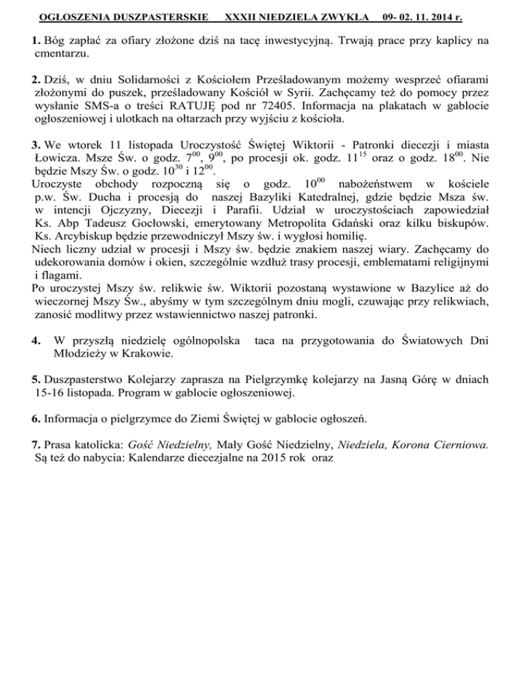 OGŁOSZENIA DUSZPASTERSKIE XXXII NIEDZIELA ZWYKŁA 09- 02. 11. 2014 r. 1. Bóg zapłać za ofiary złożone dziś na tacę inwestycyjną. Trwają prace przy kaplicy na cmentarzu. 2. Dziś, w dniu Solidarności z Kościołem Prześladowanym możemy wesprzeć ofiarami złożonymi do puszek, prześladowany Kościół w Syrii. Zachęcamy też do pomocy przez wysłanie SMS-a o treści RATUJĘ pod nr 72405. Informacja na plakatach w gablocie ogłoszeniowej i ulotkach na ołtarzach przy wyjściu z kościoła. 3. We wtorek 11 listopada Uroczystość Świętej Wiktorii - Patronki diecezji i miasta Łowicza. Msze Św. o godz. 700, 900, po procesji ok. godz. 1115 oraz o godz. 1800. Nie będzie Mszy Św. o godz. 1030 i 1200. Uroczyste obchody rozpoczną się o godz. 1000 nabożeństwem w kościele p.w. Św. Ducha i procesją do naszej Bazyliki Katedralnej, gdzie będzie Msza św. w intencji Ojczyzny, Diecezji i Parafii. Udział w uroczystościach zapowiedział Ks. Abp Tadeusz Gocłowski, emerytowany Metropolita Gdański oraz kilku biskupów. Ks. Arcybiskup będzie przewodniczył Mszy św. i wygłosi homilię. Niech liczny udział w procesji i Mszy św. będzie znakiem naszej wiary. Zachęcamy do udekorowania domów i okien, szczególnie wzdłuż trasy procesji, emblematami religijnymi i flagami. Po uroczystej Mszy św. relikwie św. Wiktorii pozostaną wystawione w Bazylice aż do wieczornej Mszy Św., abyśmy w tym szczególnym dniu mogli, czuwając przy relikwiach, zanosić modlitwy przez wstawiennictwo naszej patronki. 4. W przyszłą niedzielę ogólnopolska Młodzieży w Krakowie. taca na przygotowania do Światowych Dni 5. Duszpasterstwo Kolejarzy zaprasza na Pielgrzymkę kolejarzy na Jasną Górę w dniach 15-16 listopada. Program w gablocie ogłoszeniowej. 6. Informacja o pielgrzymce do Ziemi Świętej w gablocie ogłoszeń. 7. Prasa katolicka: Gość Niedzielny, Mały Gość Niedzielny, Niedziela, Korona Cierniowa. Są też do nabycia: Kalendarze diecezjalne na 2015 rok oraz