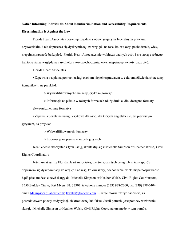 Notice Informing Individuals About Nondiscrimination and Accessibility Requirements Discrimination is Against the Law Florida Heart Associates postępuje zgodnie z obowiązującymi federalnymi prawami obywatelskimi i nie dopuszcza się dyskryminacji ze względu na rasę, kolor skóry, pochodzenie, wiek, niepełnosprawność bądź płeć. Florida Heart Associates nie wyklucza żadnych osób i nie stosuje różnego traktowania ze względu na rasę, kolor skóry, pochodzenie, wiek, niepełnosprawność bądź płeć. Florida Heart Associates • Zapewnia bezpłatną pomoc i usługi osobom niepełnosprawnym w celu umożliwienia skutecznej komunikacji, na przykład: ○ Wykwalifikowanych tłumaczy języka migowego ○ Informacje na piśmie w różnych formatach (duży druk, audio, dostępne formaty elektroniczne, inne formaty) • Zapewnia bezpłatne usługi językowe dla osób, dla których angielski nie jest pierwszym językiem, na przykład: ○ Wykwalifikowanych tłumaczy ○ Informacje na piśmie w innych językach Jeżeli chcesz skorzystać z tych usług, skontaktuj się z Michelle Simpson or Heather Walsh, Civil Rights Coordinators Jeżeli uważasz, że Florida Heart Associates, nie świadczy tych usług lub w inny sposób dopuszcza się dyskryminacji ze względu na rasę, koloru skóry, pochodzenie, wiek, niepełnosprawność bądź płeć, możesz złożyć skargę do: Michelle Simpson or Heather Walsh, Civil Rights Coordinators, 1550 Barkley Circle, Fort Myers, FL 33907, telephone number (239) 938-2000, fax (239) 278-0404, email [email protected]; [email protected] . Skargę można złożyć osobiście, za pośrednictwem poczty tradycyjnej, elektronicznej lub faksu. Jeżeli potrzebujesz pomocy w złożeniu skargi, : Michelle Simpson or Heather Walsh, Civil Rights Coordinators może w tym pomóc. Skargę obywatelską można również złożyć w U.S. Department of Health and Human Services (Departamentu Zdrowia i Opieki Społecznej Stanów Zjednoczonych), Office for Civil Rights (Biuro Praw Obywatelskich), drogą elektroniczną za pośrednictwem Office for Civil Rights Complaint Portal na stronie https://ocrportal.hhs.gov/ocr/portal/lobby.jsf, pocztą tradycyjną lub dzwoniąc pod numer telefonu: U.S. Department of Health and Human Services 200 Independence Avenue, SW Room 509F, HHH Building Washington, D.C. 20201 1-800-368-1019, 800-537-7697 (TDD) Formularze skarg są dostępne na stronie http://www.hhs.gov/ocr/office/file/index.html.
