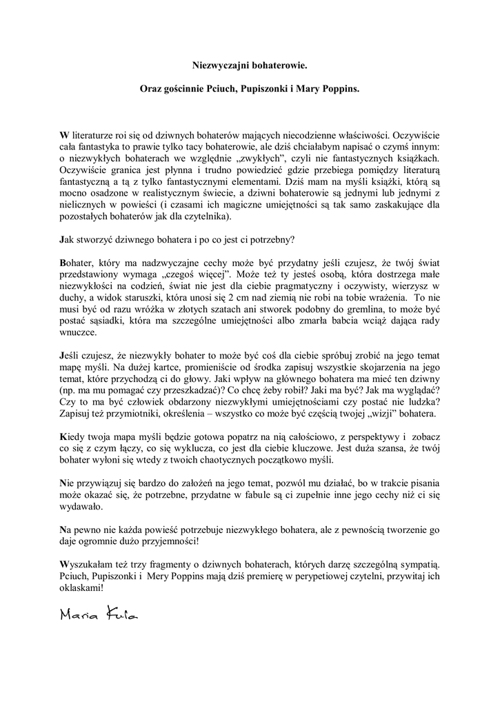 Niezwyczajni bohaterowie. Oraz gościnnie Pciuch, Pupiszonki i Mary Poppins. W literaturze roi się od dziwnych bohaterów mających niecodzienne właściwości. Oczywiście cała fantastyka to prawie tylko tacy bohaterowie, ale dziś chciałabym napisać o czymś innym: o niezwykłych bohaterach we względnie „zwykłych”, czyli nie fantastycznych książkach. Oczywiście granica jest płynna i trudno powiedzieć gdzie przebiega pomiędzy literaturą fantastyczną a tą z tylko fantastycznymi elementami. Dziś mam na myśli książki, którą są mocno osadzone w realistycznym świecie, a dziwni bohaterowie są jednymi lub jednymi z nielicznych w powieści (i czasami ich magiczne umiejętności są tak samo zaskakujące dla pozostałych bohaterów jak dla czytelnika). Jak stworzyć dziwnego bohatera i po co jest ci potrzebny? Bohater, który ma nadzwyczajne cechy może być przydatny jeśli czujesz, że twój świat przedstawiony wymaga „czegoś więcej”. Może też ty jesteś osobą, która dostrzega małe niezwykłości na codzień, świat nie jest dla ciebie pragmatyczny i oczywisty, wierzysz w duchy, a widok staruszki, która unosi się 2 cm nad ziemią nie robi na tobie wrażenia. To nie musi być od razu wróżka w złotych szatach ani stworek podobny do gremlina, to może być postać sąsiadki, która ma szczególne umiejętności albo zmarła babcia wciąż dająca rady wnuczce. Jeśli czujesz, że niezwykły bohater to może być coś dla ciebie spróbuj zrobić na jego temat mapę myśli. Na dużej kartce, promieniście od środka zapisuj wszystkie skojarzenia na jego temat, które przychodzą ci do głowy. Jaki wpływ na głównego bohatera ma mieć ten dziwny (np. ma mu pomagać czy przeszkadzać)? Co chcę żeby robił? Jaki ma być? Jak ma wyglądać? Czy to ma być człowiek obdarzony niezwykłymi umiejętnościami czy postać nie ludzka? Zapisuj też przymiotniki, określenia – wszystko co może być częścią twojej „wizji” bohatera. Kiedy twoja mapa myśli będzie gotowa popatrz na nią całościowo, z perspektywy i zobacz co się z czym łączy, co się wyklucza, co jest dla ciebie kluczowe. Jest duża szansa, że twój bohater wyłoni się wtedy z twoich chaotycznych początkowo myśli. Nie przywiązuj się bardzo do założeń na jego temat, pozwól mu działać, bo w trakcie pisania może okazać się, że potrzebne, przydatne w fabule są ci zupełnie inne jego cechy niż ci się wydawało. Na pewno nie każda powieść potrzebuje niezwykłego bohatera, ale z pewnością tworzenie go daje ogromnie dużo przyjemności! Wyszukałam też trzy fragmenty o dziwnych bohaterach, których darzę szczególną sympatią. Pciuch, Pupiszonki i Mery Poppins mają dziś premierę w perypetiowej czytelni, przywitaj ich oklaskami! Pupiszonki /Fragment książki „Ronja, córka zbójnika” Astrid Lindgren/ Z głębi jamy doszło ją jakieś mamrotanie, ale zupełnie nie rozumiała, co to mogło być. Wtem kawałek dalej ujrzała gramolące się poprzez śnieg stadko Pupiszonków. Łatwo je było poznać po ich szerokich pupkach, małych, pomarszczonych twarzyczkach i zmierzwionych włosach. Pupiszonki były zazwyczaj przyjazne, nastawione pokojowo i nie czyniły nikomu krzywdy. Ale te tutaj, które stały teraz i gapiły się na nią głupiutkimi oczami, te były najwyraźniej niezadowolone. Chrząkały i wzdychały, a jeden z nich powiedział ponurym głosem: - Cemu una tak lobi? I zaraz przyłączyły się inne: - Cemu una tak lobi? Dlacego lozwala nam dach? Cemu tak? Ronja pojęła, że wpadła stopą w ich ziemiankę. Pupiszonki budowały ją sobie, jeśli nie znalazły dziupli odpowiedniej na mieszkanie. - Nic nie mogłam poradzić – powiedziała – Pomóżcie mi się wydostać. Ale Pupiszonki tylko gapiły się na nią i wzdychały równie ponuro jak przedtem. - Una siedzi w dachu, cemu una tak lobi? Mary Poppins /fragment książki „Mary Poppins” P. L. Travers/ Gdy Mamusia wyszła z pokoju, Janeczka i Michaś zwrócili się w stronę Mary, która stała nieruchomo jak słup, z rękoma skrzyżowanymi na piersi. - Jakeś ty tu przyszła? - spytała Janeczka. - Wyglądało, jakby cię przywiał wiatr. - Bo tak było - odparła krótko Mary i zaczęła odwiązywać szalik z szyi i zdejmować kapelusz, który powiesiła potem na poręczy łóżka. Ponieważ nie zanosiło się na to, aby Mary zamierzała jeszcze coś powiedzieć - mimo że mocno pociągnęła nosem - Janeczka także milczała. Za to gdy Mary schyliła się, by otworzyć torbę, Michaś nie mógł zapanować nad sobą. - Co za dziwna torba... - powiedział, dotykając jej palcami. - Dywanikowa - wyjaśniła Mary, wkładając kluczyk do zamka. - Do noszenia dywanów? - Nie, zrobiona jest z dywanika. - Aha - rzekł Michaś - rozumiem. Ale nie bardzo rozumiał. Tymczasem torba została otwarta i dzieci były więcej niż zdziwione, gdy przekonały się, że jest ona zupełnie pusta. - Coż to? - spytała Janeczka. - Nic w niej nie ma? - Jak to „nic”? - zapytała Mary Poppins z obrażoną miną. - Powiedziałaś, że nic w niej ma? To mówiąc, wydobyła z pustej torby biały nakrochmalony fartuch, którym się zaraz przepasała, potem wyjęła wielki kawał mydła, szczotkę do zębów, paczkę szpilek do włosów, flakon perfum, mały składany fotelik i pudełko pastylek od bólu gardła. Janeczka i Michaś osłupieli. Pciuch /fragment książki „Bromba i inni” Macieja Wojtyszko/ Pciuch zamieszkuje czas. To znaczy, że można go zobaczyć tylko wtedy, kiedy się żyje kiedy indziej. Jeża na przykład możemy zobaczyć dziś. Pciucha wyłącznie jutro albo wczoraj. Dzieje się tak dlatego, że jest on szalenie szybkim, nowoczesnym stworzeniem: wyprzedza nasze czasy dzięki własnemu napędowi rakietowemu. Pciuchów jest niewielu, około trzydziestu, a nasza historia opowiada o pewnym dzielnym, młodym Pciuchu, który był posiadaczem numeru dwadzieścia cztery. Tradycyjnie wszystkie 