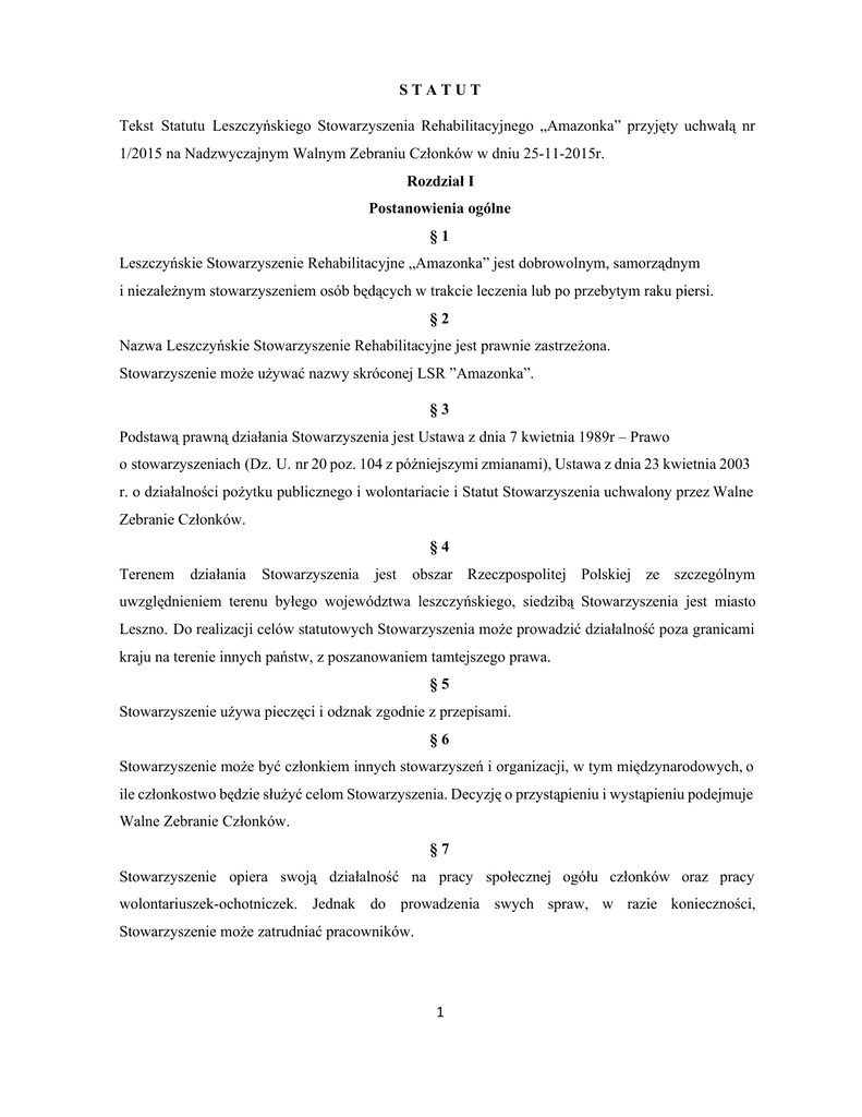 S T A T U T Tekst Statutu Leszczyńskiego Stowarzyszenia Rehabilitacyjnego „Amazonka” przyjęty uchwałą nr 1/2015 na Nadzwyczajnym Walnym Zebraniu Członków w dniu 25112015r. Rozdział I Postanowienia ogólne § 1 Leszczyńskie Stowarzyszenie Rehabilitacyjne „Amazonka” jest dobrowolnym, samorządnym i niezależnym stowarzyszeniem osób będących w trakcie leczenia lub po przebytym raku piersi. § 2 Nazwa Leszczyńskie Stowarzyszenie Rehabilitacyjne jest prawnie zastrzeżona. Stowarzyszenie może używać nazwy skróconej LSR ”Amazonka”. § 3 Podstawą prawną działania Stowarzyszenia jest Ustawa z dnia 7 kwietnia 1989r – Prawo o stowarzyszeniach (Dz. U. nr 20 poz. 104 z późniejszymi zmianami), Ustawa z dnia 23 kwietnia 2003 r. o działalności pożytku publicznego i wolontariacie i Statut Stowarzyszenia uchwalony przez Walne Zebranie Członków. § 4 Terenem działania Stowarzyszenia jest obszar Rzeczpospolitej Polskiej ze szczególnym uwzględnieniem terenu byłego województwa leszczyńskiego, siedzibą Stowarzyszenia jest miasto Leszno. Do realizacji celów statutowych Stowarzyszenia może prowadzić działalność poza granicami kraju na terenie innych państw, z poszanowaniem tamtejszego prawa. § 5 Stowarzyszenie używa pieczęci i odznak zgodnie z przepisami. § 6 Stowarzyszenie może być członkiem innych stowarzyszeń i organizacji, w tym międzynarodowych, o ile członkostwo będzie służyć celom Stowarzyszenia. Decyzję o przystąpieniu i wystąpieniu podejmuje Walne Zebranie Członków. § 7 Stowarzyszenie opiera swoją działalność na pracy społecznej ogółu członków oraz pracy wolontariuszekochotniczek. Jednak do prowadzenia swych spraw, w razie konieczności, Stowarzyszenie może zatrudniać pracowników. 1 Rozdział II Cele i sposoby działania § 8 1. Celem Stowarzyszenia jest : a) organizowanie i prowadzenie różnych form działalności zmierzającej do zwalczania i minimalizowania kalectwa i inwalidztwa związanego z przebyta chorobą nowotworową piersi; b) popieranie i inicjowanie pracy naukowej , rehabilitacji leczniczej, zawodowej i społecznej; c) dążenie do zniesienia barier psychospołecznych i psychofizycznych wynikających z przebycia choroby i leczenia; 2. Stowarzyszenie realizuje swoje cele poprzez nieodpłatną działalność pożytku publicznego w zakresie: a) organizowania wzajemnego wsparcia, pomocy i samopomocy; b) tworzenia warunków do integracji kobiet po leczeniu raka piersi; c) włączania się w akcje związane z profilaktyką i diagnostyką, mające na celu wczesne wykrycie raka piersi; d) organizowania spotkań towarzyskich, imprez kulturalnych, sportowych i turystycznych dla członków Stowarzyszenia; e) nawiązywania kontaktów z podobnymi Stowarzyszeniami i organizacjami lokalnymi; f) organizowania i szkolenia sekcji ochotniczek jako grup wsparcia i samopomocy; g) udziału w imprezach organizowanych na rzecz walki z rakiem piersi w celu propagowania działalności Stowarzyszenia oraz jego idei; h) podnoszenia kondycji psychofizycznej członków poprzez motywowanie ich do aktywności fizycznej i rehabilitacji; i) pozyskiwania środków na realizację zadań statutowych; j) wydawania broszur, folderów, plakatów, materiałów edukacyjnych; k) organizowania szkoleń, wystaw, pokazów, konferencji oraz spotkań z profesjonalistami l) o tematyce związanej z zapobieganiem i zwalczaniem choroby nowotworowej; m) współpracy z instytucjami, stowarzyszeniami i fundacjami działającymi na rzecz chorych i niepełnosprawnych; n) 3. współuczestniczenie w międzynarodowej działalności w ramach celów Stowarzyszenia. W razie konieczności cel może być realizowany poprzez odpłatną działalność pożytku publicznego w zakresie: a) organizowania spotkań towarzyskich, imprez kulturalnych, sportowych 2 i turystycznych (PKD 94.99. Z); b) 4. wydawania broszur, folderów, plakatów materiałów edukacyjnych (PKD 58.19.Z); W przypadku działalności odpłatnej cały dochód z tej działalności przeznaczony będzie na cele statutowe stowarzyszenia. 5. Przedmiotem działalności pożytku publicznego jest wszechstronne działanie na rzecz osób z rakiem piersi, a w szczególności w zakresie: a) pomocy społecznej osobom w trudnej sytuacji życiowej oraz wyrównania szans tych osób ( PKD 94.99. Z); b) działalności charytatywnej (PKD 88.99.Z); c) ochrony i promocji zdrowia (PKD 86. 90.E); d) działania na rzecz osób niepełnosprawnych(PKD 88.10.Z); e) promocji zatrudnienia i aktywizacji zawodowej osób pozostających bez pracy i zagrożonych wykluczeniem społecznym (PKD 86.90.E); f) nauki, edukacji, oświaty i wydawnictw (PKD 85.59.B); g) upowszechniania kultury fizycznej i aktywnego wypoczynku (PKD 93.19.Z); h) działalności wspomagającej rozwój wspólnot i społeczności lokalnych oraz działalność na rzecz integracji europejskiej oraz rozwoju kontaktów i współpracy między społeczeństwami ( PKD 94.99. Z); Rozdział III Członkowie, ich prawa i obowiązki § 9 1. Członkowie dzielą się na zwyczajnych i wspierających. 2. Członkiem zwyczajnym może być każda osoba fizyczna będąca w trakcie lub po leczeniu raka piersi, która zgłosi swój udział w realizacji celów Stowarzyszenia, złoży odpowiednią deklarację oraz opłaci składkę członkowską. 3. Osoby prawne wspierające cele LSR ”Amazonka” oraz deklarujące pomoc finansową, prawną, rzeczową i merytoryczną w realizacji statutowych celów mogą być jedynie członkami wspierającymi Stowarzyszenie. Osoby prawne biorą udział w Walnych Zebraniach Członków z głosem doradczym przez wyznaczonego i prawidłowo umocowanego przedstawiciela. 4. Pełnoletnie osoby fizyczne deklarujące pomoc finansową, prawną, rzeczową i merytoryczną w realizacji statutowych celów mogą być także członkami wspierającymi Stowarzyszenia i brać udział w Walnych Zebraniach Członków z głosem doradczym. 3 5. Członkiem wspierającym LSR „Amazonka