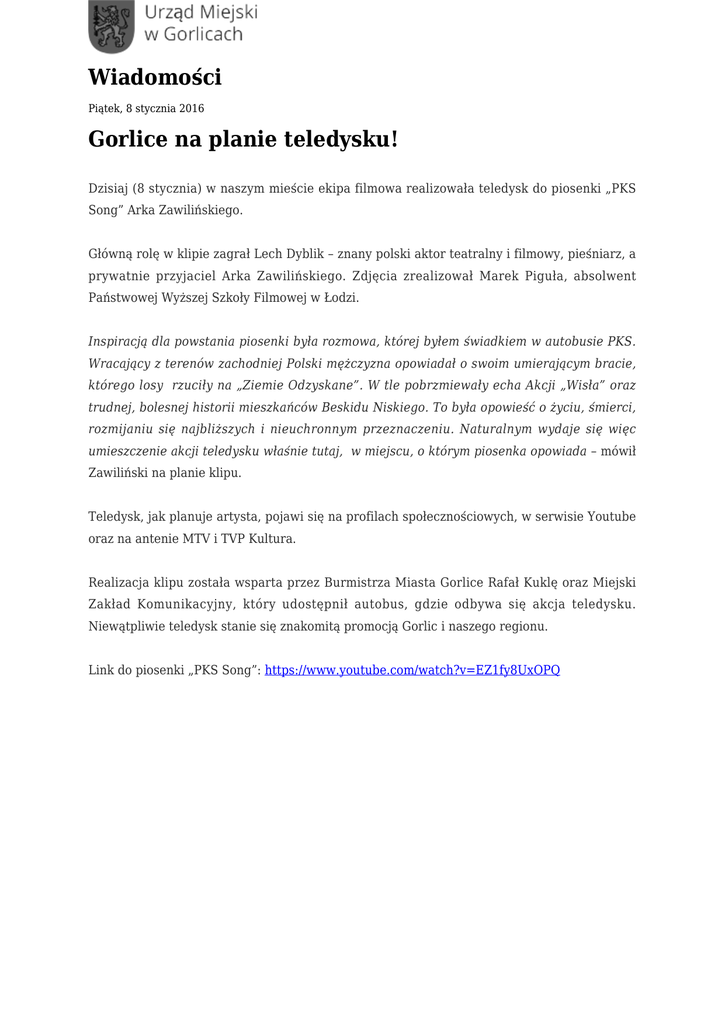 Wiadomości Piątek, 8 stycznia 2016 Gorlice na planie teledysku! Dzisiaj (8 stycznia) w naszym mieście ekipa filmowa realizowała teledysk do piosenki „PKS Song” Arka Zawilińskiego. Główną rolę w klipie zagrał Lech Dyblik – znany polski aktor teatralny i filmowy, pieśniarz, a prywatnie przyjaciel Arka Zawilińskiego. Zdjęcia zrealizował Marek Piguła, absolwent Państwowej Wyższej Szkoły Filmowej w Łodzi. Inspiracją dla powstania piosenki była rozmowa, której byłem świadkiem w autobusie PKS. Wracający z terenów zachodniej Polski mężczyzna opowiadał o swoim umierającym bracie, którego losy rzuciły na „Ziemie Odzyskane”. W tle pobrzmiewały echa Akcji „Wisła” oraz trudnej, bolesnej historii mieszkańców Beskidu Niskiego. To była opowieść o życiu, śmierci, rozmijaniu się najbliższych i nieuchronnym przeznaczeniu. Naturalnym wydaje się więc umieszczenie akcji teledysku właśnie tutaj, w miejscu, o którym piosenka opowiada – mówił Zawiliński na planie klipu. Teledysk, jak planuje artysta, pojawi się na profilach społecznościowych, w serwisie Youtube oraz na antenie MTV i TVP Kultura. Realizacja klipu została wsparta przez Burmistrza Miasta Gorlice Rafał Kuklę oraz Miejski Zakład Komunikacyjny, który udostępnił autobus, gdzie odbywa się akcja teledysku. Niewątpliwie teledysk stanie się znakomitą promocją Gorlic i naszego regionu. Link do piosenki „PKS Song”: https://www.youtube.com/watch?v=EZ1fy8UxOPQ