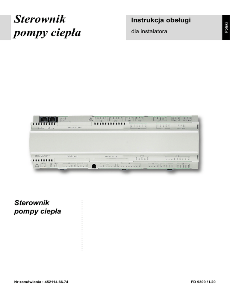 Instrukcja obsługi Polski Sterownik pompy ciepła dla instalatora Sterownik pompy ciepła Nr zamówienia : 452114.66.74 FD 9309 / L20 '( Einstellung der Sprache Die Einstellung der Sprache ist nach einem Neustart des Wärmepumpenmanagers oder im Menü Einstellungen möglich. MENUE-Taste für einige Sekunden gedrückt halten Auswahl des Menüpunktes Einstellungen und bestätigen durch Drücken der ENTER-Taste () Auswahl des Untermenüpunktes Sprache mit der Pfeiltasten () und bestätigen durch Drücken der ENTER-Taste () bis Cursor zum Einstellwert springt Gewünschte Sprache mit Pfeiltasten ( und ) einstellen Gewählte Sprache mit ENTER-Taste () bestätigen oder durch die ESC-Taste verwerfen *% Sets the desired language The language can be set after restarting the heat pump manager or in the Settings menu. Press and hold the MENUE button for several seconds Select the menu item Settings and confirm by pressing the ENTER key () Select the Language submenu item with the arrow keys () and confirm by pressing the ENTER key () until the cursor jumps to the setting value Set the desired language with the arrow keys ( and ) Confirm the selected language with the ENTER key () or revoke with the ESC key )5 Réglage de la langue Il est possible de régler la langue après un redémarrage du gestionnaire de pompe à chaleur ou dans le menu Réglages. Maintenir la touche MENUE enfoncée pendant plusieurs secondes. Sélectionner l'option de menu Réglages et confirmer en appuyant sur la touche ENTRÉE (). Sélectionner l'option de sous-menu Langue à l'aide des touches flèches () et confirmer en appuyant sur la touche ENTRÉE () jusqu'à ce que le curseur se positionne sur la valeur de réglage. Sélectionner la langue souhaitée à l'aide des touches flèches ( et ). Confirmer la langue choisie avec la touche ENTRÉE () ou la rejeter à l'aide de la touche ESC. 6, Nastavitev jezika Nastavitev jezika je mogoèa po ponovnem zagonu upravitelja toplotne èrpalke ali v meniju za nastavitve. Tipko MENUE držite pritisnjeno nekaj sekund Izberite menijsko toèko za nastavitve in jo potrdite s pritiskom na tipko ENTER () Podmenijsko toèko za jezik izberite s tipkami s pušèico () in potrdite s pritiskom na tipko ENTER (), dokler kazalec ne skoèi na nastavitveno vrednost Želeni jezik nastavite s tipkami s pušèico ( in ) Izbrani jezik potrdite s tipko ENTER () ali zavrzite s tipko ESC ,7 Impostazione della lingua È possibile impostare la lingua al riavvio del programmatore della pompa di calore oppure nel menu Impostazioni. Tenere premuto il tasto MENUE per alcuni secondi Selezionare la voce di menu Impostazioni e confermare premendo il tasto ENTER () Selezionare la voce di sottomenu Lingua con il tasto freccia () e confermare premendo il tasto ENTER () fino a che il cursore non si posiziona sul valore da impostare Impostare la lingua desiderata con i tasti freccia ( e ) Confermare la lingua selezionata con il tasto ENTER () oppure scartarla con il tasto ESC 6( Inställning av språket Inställningen av språket är möjligt efter en nystart av värmepumphanteraren eller i menyn Inställningar. Håll MENUE- knappen nedtryckt några sekunder. Välj menypunkt Inställningar och bekräfta med ENTER-knappen () Välj undermenypunkten Språk med pilknapparna () och bekräfta med ENTER-knappen () tills markören hoppar till inställningsvärdet Ställ in önskat språk med pilknapparna ( och ) Bekräfta utvalt språk med ENTER-knappen () eller annulera med ESC-knappen &= Nastavení jazyka Nastavení jazyka je možné po novém spuštìní manažera tepelného èerpadla nebo v nabídce Nastavení. Po dobu nìkolika sekund držte stisknuto tlaèítko MENUE Výbìr nabídky menu Nastavení a potvrzení stisknutím tlaèítka ENTER () Výbìr nabídky podmenu Jazyk pomocí šipkových tlaèítek () a potvrzení stisknutím tlaèítka ENTER (), až kurzor pøeskoèí k hodnotì nastavení Nastavení požadovaného jazyka pomocí šipkových tlaèítek ( a ) Zvolený jazyk potvrdit pomocí tlaèítka ENTER () nebo zrušit volbu pomocí tlaèítka ESC 3/ Ustawienia języka Ustawienie języka możliwe jest po ponownym uruchomieniu sterownika pompy ciepła lub w menu Ustawienia. Przytrzymać przycisk MENUE przez kilka sekund Wybrać punkt menu Ustawienia i potwierdzić wciskając przycisk ENTER () Wybrać podpunkt menu „Język” strzałkami () i potwierdzić wciskając przycisk ENTER () aż kursor przejdzie do ustawień Ustawić żądany język strzałkami ( i ) Wybrany język potwierdzić przyciskiem ENTER () lub odrzucić przyciskiem ESC 5& 语言设定 可在重新启动热泵管理器后或通过菜单中的设定项设定语言。 持续按住 MENUE 键几秒钟 选择菜单项 “设定”并通过按 ENTER 键 ()进行确认 用方向键 () 选择子菜单项 “语言”并通过按 ENTER 键 ()进行 确认,直至光标跳至设定值 通过方向键 ( 及 )对所需语言进行设定 通过 ENTER 键 () 确定所需语言或通过 ESC 键取消 37 Definição do idioma A definição do idioma é possível depois de reiniciado o controlador da bomba de calor ou através do menu Definições. Manter a tecla MENUE premida durante alguns segundos Seleção do ponto de menu Definições e confirmar premindo a tecla ENTER () Seleção do ponto do submenu Idioma com as teclas de setas () e confirmar premindo a tecla ENTER () até o cursor saltar para o valor de definição Definir o idioma desejado com as teclas de setas ( e ) Confirmar o idioma selecionado com a tecla ENTER () ou cancelar através da tecla ESC 1/ Instelling van de taal De taal kan worden ingesteld na een nieuwe start van de warmtepompmanager of in het menu Instellingen. Houd de MENUE-toets enkele seconden lang ingedrukt Kies de menuoptie Instellingen en bevestig de keuze met de ENTER-toets () Kies de submenuoptie Taal met de pijltjestoets () en bevestig de keuze met de ENTER-toets () tot de cursor naar de instelwaarde springt Stel de gewenste 