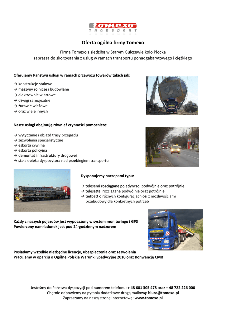 Oferta ogólna firmy Tomexo Firma Tomexo z siedzibą w Starym Gulczewie koło Płocka zaprasza do skorzystania z usług w ramach transportu ponadgabarytowego i ciężkiego Oferujemy Państwu usługi w ramach przewozu towarów takich jak: → konstrukcje stalowe → maszyny rolnicze i budowlane → elektrownie wiatrowe → dźwigi samojezdne → żurawie wieżowe → oraz wiele innych Nasze usługi obejmują również czynności pomocnicze: → wytyczanie i objazd trasy przejazdu → zezwolenia specjalistyczne → eskorta cywilna → eskorta policyjna → demontaż infrastruktury drogowej → stała opieka dyspozytora nad przebiegiem transportu Dysponujemy naczepami typu: → telesemi rozciągane pojedynczo, podwójnie oraz potrójnie → telesattel rozciągane podwójnie oraz potrójnie → tiefbett o różnych konfiguracjach osi z możliwościami przebudowy dla konkretnych potrzeb Każdy z naszych pojazdów jest wyposażony w system monitoringu i GPS Powierzony nam ładunek jest pod 24-godzinnym nadzorem Posiadamy wszelkie niezbędne licencje, ubezpieczenia oraz zezwolenia Pracujemy w oparciu o Ogólne Polskie Warunki Spedycyjne 2010 oraz Konwencję CMR Jesteśmy do Państwa dyspozycji pod numerem telefonu: + 48 601 305 478 oraz + 48 722 226 000 Chętnie odpowiemy na pytania dodatkowe drogą mailową: [email protected] Zapraszamy na naszą stronę internetową: www.tomexo.pl