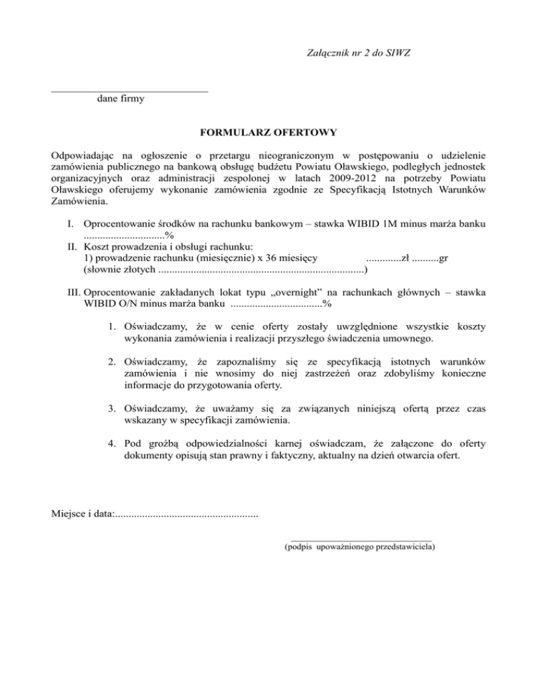 Załącznik nr 2 do SIWZ _____________________________ dane firmy FORMULARZ OFERTOWY Odpowiadając na ogłoszenie o przetargu nieograniczonym w postępowaniu o udzielenie zamówienia publicznego na bankową obsługę budżetu Powiatu Oławskiego, podległych jednostek organizacyjnych oraz administracji zespolonej w latach 2009-2012 na potrzeby Powiatu Oławskiego oferujemy wykonanie zamówienia zgodnie ze Specyfikacją Istotnych Warunków Zamówienia. I. Oprocentowanie środków na rachunku bankowym – stawka WIBID 1M minus marża banku ..............................% II. Koszt prowadzenia i obsługi rachunku: 1) prowadzenie rachunku (miesięcznie) x 36 miesięcy .............zł ..........gr (słownie złotych ............................................................................) III. Oprocentowanie zakładanych lokat typu „overnight” na rachunkach głównych – stawka WIBID O/N minus marża banku ..................................% 1. Oświadczamy, że w cenie oferty zostały uwzględnione wszystkie koszty wykonania zamówienia i realizacji przyszłego świadczenia umownego. 2. Oświadczamy, że zapoznaliśmy się ze specyfikacją istotnych warunków zamówienia i nie wnosimy do niej zastrzeżeń oraz zdobyliśmy konieczne informacje do przygotowania oferty. 3. Oświadczamy, że uważamy się za związanych niniejszą ofertą przez czas wskazany w specyfikacji zamówienia. 4. Pod groźbą odpowiedzialności karnej oświadczam, że załączone do oferty dokumenty opisują stan prawny i faktyczny, aktualny na dzień otwarcia ofert. Miejsce i data:..................................................... __________________________ (podpis upoważnionego przedstawiciela)