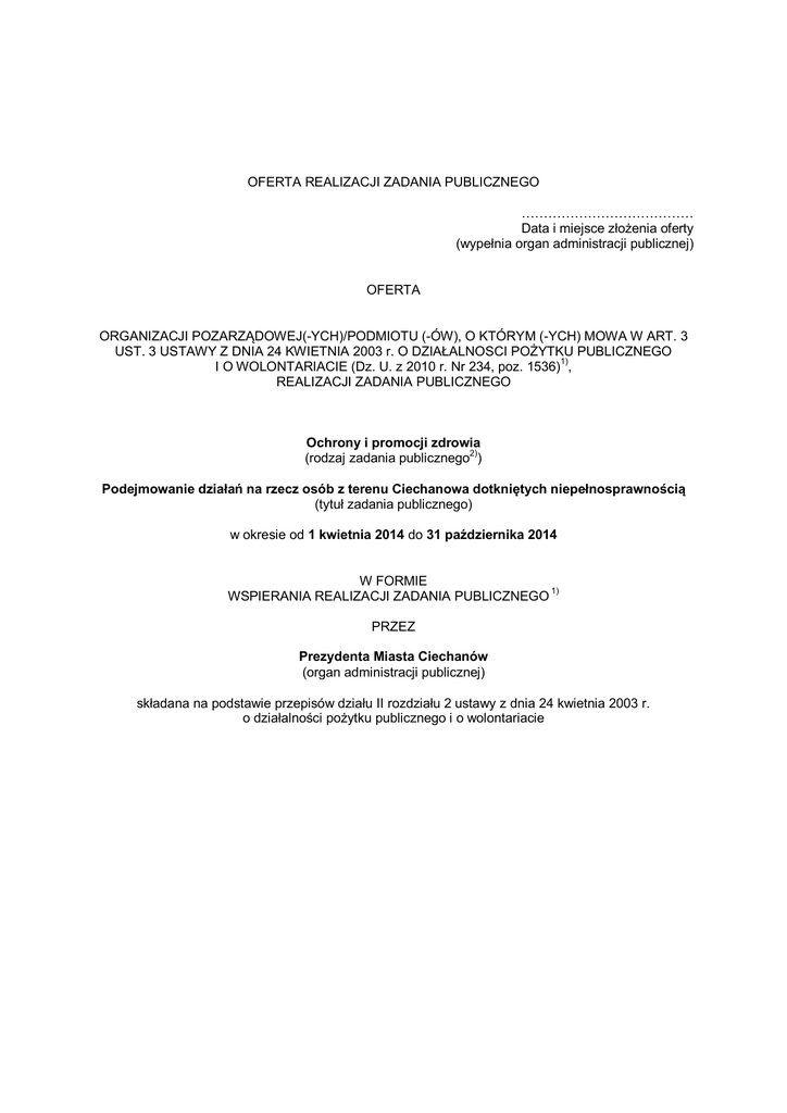 OFERTA REALIZACJI ZADANIA PUBLICZNEGO ………………………………… Data i miejsce złożenia oferty (wypełnia organ administracji publicznej) OFERTA ORGANIZACJI POZARZĄDOWEJ(-YCH)/PODMIOTU (-ÓW), O KTÓRYM (-YCH) MOWA W ART. 3 UST. 3 USTAWY Z DNIA 24 KWIETNIA 2003 r. O DZIAŁALNOSCI POŻYTKU PUBLICZNEGO I O WOLONTARIACIE (Dz. U. z 2010 r. Nr 234, poz. 1536)1), REALIZACJI ZADANIA PUBLICZNEGO Ochrony i promocji zdrowia (rodzaj zadania publicznego2)) Podejmowanie działań na rzecz osób z terenu Ciechanowa dotkniętych niepełnosprawnością (tytuł zadania publicznego) w okresie od 1 kwietnia 2014 do 31 października 2014 W FORMIE WSPIERANIA REALIZACJI ZADANIA PUBLICZNEGO 1) PRZEZ Prezydenta Miasta Ciechanów (organ administracji publicznej) składana na podstawie przepisów działu II rozdziału 2 ustawy z dnia 24 kwietnia 2003 r. o działalności pożytku publicznego i o wolontariacie I. Dane oferenta/oferentów 1)3) 1) nazwa: CIECHANOWSKIE STOWARZYSZENIE DLA NIEPEŁNOSPRAWNYCH 2) forma prawna:4) ( X ) stowarzyszenie ( ) fundacja ( ) kościelna osoba prawna ( ) kościelna jednostka organizacyjna ( ) spółdzielnia socjalna ( ) inna………………………………… 3) numer w Krajowym Rejestrze Sądowym, w innym rejestrze lub ewidencji:5) 0000144250 4) data wpisu, rejestracji lub utworzenia:6) 19.12.2002r. 5) nr NIP: 566 18 64 303 nr REGON: 130926136 6) adres: miejscowość: Ciechanów ul.: 17 stycznia 37 dzielnica lub inna jednostka pomocnicza:7) ……………………………………….. gmina: Ciechanów powiat:8) Ciechanów województwo: mazowieckie kod pocztowy: 06- 400 poczta: Ciechanów 7) tel.: 23 673 67 33 faks: ..................................................... e-mail: [email protected] 8) numer rachunku bankowego: 38 2030 0045 1110 0000 0065 7760 nazwa banku: BGŻ 9) nazwiska i imiona osób upoważnionych do reprezentowania oferenta/oferentów1): a) Sawulski Zbigniew b) Olszewska Alicja c) Kuźbicka Anna 10) nazwa, adres i telefon kontaktowy jednostki organizacyjnej bezpośrednio wykonującej zadanie, o którym mowa w ofercie: 9) Ciechanowskie Stowarzyszenie dla Niepełnosprawnych Ciechanów ul. 17 stycznia 37 tel. 23 673 67 33 11) osoba upoważniona do składania wyjaśnień dotyczących oferty (imię i nazwisko oraz nr telefonu kontaktowego) Zbigniew Sawulski 23 672 15 37 12) przedmiot działalności pożytku publicznego: a) działalność nieodpłatna pożytku publicznego 85, 14, F, Pozostała działalność związana z ochroną zdrowia ludzkiego, gdzie indziej niesklasyfikowana 85,32 Opieka wychowawcza i społeczna bez zakwaterowania 85,32,B Poradnie psychologiczno- pedagogiczne 85, 31 B Pozostała opieka wychowawcza i społeczna z zakwaterowaniem b) działalność odpłatna pożytku publicznego Nie dotyczy 13) jeżeli oferent /oferenci1) prowadzi/prowadzą1) działalność gospodarczą: a) numer wpisu do rejestru przedsiębiorców ………………………………………………………….. b) przedmiot działalności gospodarczej Nie prowadzi działalności gospodarczej II. Informacja o sposobie reprezentacji oferentów wobec organu administracji publicznej wraz z przytoczeniem podstawy prawnej10) Nie dotyczy III. Szczegółowy zakres rzeczowy zadania publicznego proponowanego do realizacji 1. Krótka charakterystyka zadania publicznego Indywidualne zajęcia wyrównawczo wspomagające rozwój dzieci niepełnosprawnych. Zajęcia w zakresie programów szkół specjalnych oraz wskazań dotyczących orzeczeń o stopniu niepełnosprawności. Pomoc w zakresie wsparcia w samodzielnej egzystencji w procesie jego leczenia, rehabilitacji i edukacji. Zajęcia odbywałyby się 1-2 godziny tygodniowo dla każdego dziecka. Dzieci zgłoszone na zajęcia przez rodziców nie potrafiących dostarczać dzieciom wzorców zachowania, uczenia, zdobywania umiejętności i nawyków w życiu rodzinnym. Uczniowie uczęszczający na zajęcia otrzymaliby w przeciągu 6 miesięcy około 40 godzin edukacji wg potrzeb zgłaszanych przez rodziców lub widocznych zaniedbań. 2. Opis potrzeb wskazujących na konieczność wykonania zadania publicznego, opis ich przyczyn oraz skutków U dzieci niepełnosprawnych widoczny jest brak przygotowania do samodzielnego życia i przyszłej pracy. Dzieci niepełnosprawne najczęściej funkcjonują przy stałej opiece rodziców, stąd potrzeba wprowadzenia dzieci w samodzielny tryb życia. Brak opieki rodzicielskiej po skończonej szkole skutkuje powrotem do stałej lub długotrwałej opieki innej osoby w związku ze znacznie ograniczoną możliwością samodzielnej egzystencji. W projekcie pragniemy się temu przeciwstawić. Pragniemy spowodować u dzieci nawyki związane z prowadzeniem domu rodzinnego oraz szacunku do przyszłej pracy zawodowej. 3. Opis grup adresatów zadania publicznego Dzieci niepełnosprawne z orzeczeniami w wieku do 20 lat z terenu miasta Ciechanowa i gminy Ciechanów. 4. Uzasadnienie potrzeby dofinansowania z dotacji inwestycji związanych z realizacją zadania publicznego, w szczególności ze wskazaniem w jaki sposób przyczyni się to do podwyższenia standardu realizacji zadania.11) Nie dotyczy 5. Informacja, czy w ciągu ostatnich 5 lat oferent/oferenci 1) otrzymał/otrzymali 1) dotację na dofinansowanie inwestycji związanych z realizacją zadania publicznego z podaniem inwestycji, które zostały dofinansowane, organu który udzielił dofinansowania oraz daty otrzymania dotacji .11) Nie dotyczy 6. Zakładane cele realizacji zadania publicznego oraz sposób ich realizacji Zdobywanie nawyków i umiejętności w samodzielnym życiu tj. rzetelna praca zawodowa, dokładność, czystość, systematyczność na stanowisku pracy i w domu Powodowanie większej samodzielności w życiu codziennym Prace pomocnicze w domu: zdrowe odżywianie, gospodarka funduszami rodzinnymi, prace porządkowe w domu, pomoc rodzicom 7. Miejsce realizacji zadania publicznego Siedziba stowarzyszenia Ciechanów ul. 17 stycznia 37