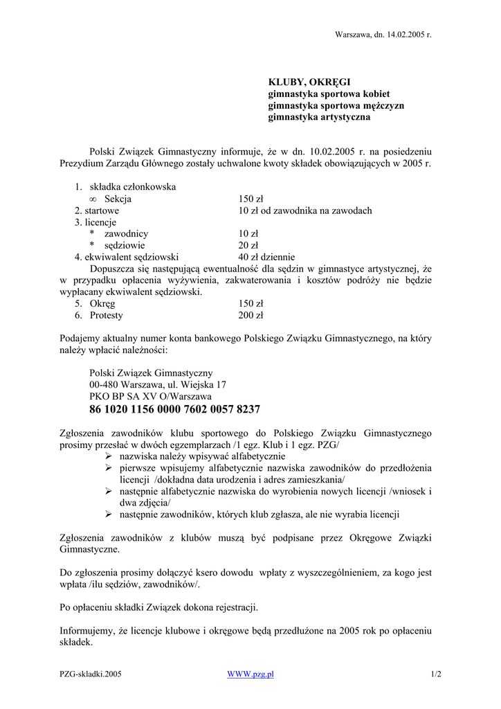 Warszawa, dn. 14.02.2005 r. KLUBY, OKRĘGI gimnastyka sportowa kobiet gimnastyka sportowa mężczyzn gimnastyka artystyczna Polski Związek Gimnastyczny informuje, że w dn. 10.02.2005 r. na posiedzeniu Prezydium Zarządu Głównego zostały uchwalone kwoty składek obowiązujących w 2005 r. 1. składka członkowska • Sekcja 150 zł 2. startowe 10 zł od zawodnika na zawodach 3. licencje * zawodnicy 10 zł * sędziowie 20 zł 4. ekwiwalent sędziowski 40 zł dziennie Dopuszcza się następującą ewentualność dla sędzin w gimnastyce artystycznej, że w przypadku opłacenia wyżywienia, zakwaterowania i kosztów podróży nie będzie wypłacany ekwiwalent sędziowski. 5. Okręg 150 zł 6. Protesty 200 zł Podajemy aktualny numer konta bankowego Polskiego Związku Gimnastycznego, na który należy wpłacić należności: Polski Związek Gimnastyczny 00-480 Warszawa, ul. Wiejska 17 PKO BP SA XV O/Warszawa 86 1020 1156 0000 7602 0057 8237 Zgłoszenia zawodników klubu sportowego do Polskiego Związku Gimnastycznego prosimy przesłać w dwóch egzemplarzach /1 egz. Klub i 1 egz. PZG/ nazwiska należy wpisywać alfabetycznie pierwsze wpisujemy alfabetycznie nazwiska zawodników do przedłożenia licencji /dokładna data urodzenia i adres zamieszkania/ następnie alfabetycznie nazwiska do wyrobienia nowych licencji /wniosek i dwa zdjęcia/ następnie zawodników, których klub zgłasza, ale nie wyrabia licencji Zgłoszenia zawodników z klubów muszą być podpisane przez Okręgowe Związki Gimnastyczne. Do zgłoszenia prosimy dołączyć ksero dowodu wpłaty z wyszczególnieniem, za kogo jest wpłata /ilu sędziów, zawodników/. Po opłaceniu składki Związek dokona rejestracji. Informujemy, że licencje klubowe i okręgowe będą przedłużone na 2005 rok po opłaceniu składek. PZG-skladki.2005 WWW.pzg.pl 1/2 Warszawa, dn. 14.02.2005 r. Zobowiązuje się KLUBY i OKRĘGI o poinformowaniu sędziów z Waszego terenu o terminie składania dokumentów wysokości opłat za licencję Prosimy o przestrzeganie terminu wysyłania komunikatów przez organizatora zawodów, a także zgłaszania do startu w zawodach. W/w dokument prosimy przesłać do dnia 30 marca 2005 r. wraz z opłatami. Polski Związek Gimnastyczny prosi o podanie e-maila klubu, gdyż dokumentacje będziemy przesyłać drogą elektroniczną. Strona internetowa Polskiego Związku Gimnastycznego: www.pzg.pl, e-mail: [email protected] PZG-skladki.2005 WWW.pzg.pl 2/2