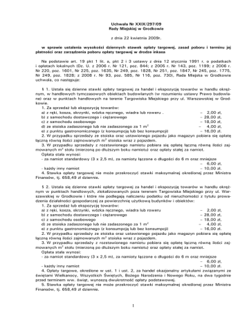 Uchwała Nr XXIX/297/09 Rady Miejskiej w Grodkowie z dnia 22 kwietnia 2009r. w sprawie ustalenia wysokości dziennych stawek opłaty targowej, zasad poboru i terminu jej płatności oraz zarządzenia poboru opłaty targowej w drodze inkasa Na podstawie art. 19 pkt 1 lit. a, pkt 2 i 3 ustawy z dnia 12 stycznia 1991 r. o podatkach i opłatach lokalnych (Dz. U. z 2006 r. Nr 121, poz. 844; z 2005 r. Nr 143, poz. 1199; z 2006 r. Nr 220, poz. 1601, Nr 225, poz. 1635, Nr 249, poz. 1828, Nr 251, poz. 1847, Nr 245, poz. 1775, Nr 249, poz. 1828; z 2008 r. Nr 93, poz. 585, Nr 116, poz. 730), Rada Miejska w Grodkowie uchwala, co następuje: § 1. Ustala się dzienne stawki opłaty targowej za handel i ekspozycję towarów w handlu okrężnym, w handlowych tymczasowych obiektach budowlanych (w rozumieniu ustawy Prawo budowlane) oraz w punktach handlowych na terenie Targowiska Miejskiego przy ul. Warszawskiej w Grodkowie. 1. Za sprzedaż lub ekspozycję towarów: a) z ręki, kosza, skrzynki, wózka ręcznego, wiadra lub roweru . – 2,00 zł, b) z samochodu dostawczego i ciężarowego – 28,00 zł, c) z samochodu osobowego – 18,00 zł, d) ze stoiska zadaszonego lub nie zadaszonego za 1 m 2 – 4,00 zł, e) z punktu gastronomicznego (z konsumpcją lub bez konsumpcji) – 16,00 zł. 2. W przypadku sprzedaży ze stoiska oraz ustawionego pojazdu jako magazyn pobiera się opłatę łączną równą ilości zajmowanych m2 stoiska wraz z pojazdem. 3. W przypadku sprzedaży z rozstawionego namiotu pobiera się opłatę łączną równą ilości zajmowanych m2 stołu (mierzoną po dłuższym boku namiotu) oraz opłaty stałej za namiot. Opłata stała wynosi: - za namiot standardowy (3 x 2,5 m), za namioty łączone o długości do 6 m oraz mniejsze – 6,00 zł, - każdy inny namiot – 10,00 zł. 4. Stawka opłaty targowej nie może przekroczyć stawki maksymalnej określonej przez Ministra Finansów, tj. 658,49 zł dziennie. § 2. Ustala się dzienne stawki opłaty targowej za handel i ekspozycję towarów w handlu okrężnym w punktach handlowych, zlokalizowanych poza terenem Targowiska Miejskiego przy ul. Warszawskiej w Grodkowie i które nie podlegają naliczeniu podatku od nieruchomości z tytułu prowadzenia działalności gospodarczej za powierzchnię użytkową budynków i obiektów: 1. Za sprzedaż lub ekspozycję towarów: a) z ręki, kosza, skrzynki, wózka ręcznego, wiadra lub roweru – 2,00 zł, b) z samochodu dostawczego i ciężarowego – 28,00 zł, c) z samochodu osobowego – 18,00 zł, d) ze stoiska zadaszonego lub nie zadaszonego za 1 m2 – 4,00 zł, e) z punktu gastronomicznego (z konsumpcją lub bez konsumpcji) – 16,00 zł. 2. W przypadku sprzedaży ze stoiska oraz ustawionego pojazdu jako magazyn pobiera się opłatę łączną równą ilości zajmowanych m2 stoiska wraz z pojazdem. 3. W przypadku sprzedaży z rozstawionego namiotu pobiera się opłatę łączną równą ilości zajmowanych m2 stołu (mierzoną po dłuższym boku namiotu) oraz opłaty stałej za namiot. Opłata stała wynosi: - za namiot standardowy (3 x 2,5 m), za namioty łączone o długości do 6 m oraz mniejsze – 6,00 zł, - każdy inny namiot – 10,00 zł. 4. Opłaty targowe, określone w ust. 1 i ust. 2, za handel okazjonalny artykułami związanymi ze świętami Wielkanocy, Wszystkich Świętych, Bożego Narodzenia i Nowego Roku, na dwa tygodnie przed terminem ww. świąt, wynoszą dwukrotność opłaty podstawowej. 5. Stawka opłaty targowej nie może przekroczyć stawki maksymalnej określonej przez Ministra Finansów, tj. 658,49 zł dziennie. 1 § 3.1. Prowadzenie handlu i ekspozycji towarów w handlu okrężnym na terenie miasta i gminy poza terenem Targowiska Miejskiego przy ul. Warszawskiej, wymaga uzyskania zgody właściciela danego terenu. 2. Opłatę targową, poza terenem Targowiska Miejskiego przy ul. Warszawskiej, pobiera się niezależnie od innych opłat przewidzianych w odrębnych przepisach oraz określonych przez właściciela nieruchomości. § 4.1. Do poboru opłaty targowej wyznacza się jako inkasentów: Pani Beata Tarapata - dz. nr 208/8, 209/2, 208/6, część dz. nr 427/6 oraz teren miasta, Pani Alfreda Zarzeczna - dz. nr 428/4, 430, Pani Żaneta Kmieć - dz. nr 433/1, 433/3, 433/4, 433/5. 2. Za pobór opłaty targowej ustala się wynagrodzenie dla inkasentów w wysokości 14% zebranej opłaty. 3. Osoby prowadzące handel okrężny poza terenem Targowiska Miejskiego przy ul. Warszawskiej zobowiązane są do okazywania w czasie kontroli dokumentów określonych § 3. § 5. Poza zwolnieniami ustawowymi z opłaty targowej zwolniona jest sprzedaż i ekspozycja towarów: 1) w punktach handlowych na imprezach i festynach kulturalnych, sportowych, rekreacyjnych i charytatywnych, na organizację których zostało wydane przez Burmistrza Grodkowa zezwolenie na przeprowadzenie imprezy masowej (na mocy ustawy o bezpieczeństwie imprez masowych) lub, które zostały zgłoszone w Urzędzie Miejskim w Grodkowie (na mocy ustawy o organizowaniu i prowadzeniu działalności kulturalnej); 2) prowadzona na terenie określonym w umowie dzierżawy gruntu na prowadzenie handlu zawartej z Urzędem Miejskim w Grodkowie. § 6. Wykonanie uchwały powierza się Burmistrzowi Grodkowa. § 7. Traci moc uchwała Nr XII/127/04 Rady Miejskiej w Grodkowie z dnia 28 kwietnia 2004 r. w sprawie ustalenia wysokości dziennych stawek opłaty targowej, zasad poboru i terminu jej płatności oraz zarządzenia poboru opłaty targowej w drodze inkasa na terenie placu targowego w Grodkowie oraz uchwała Nr XXV/271/08 Rady Miejskiej w Grodkowie z dnia 30 grudnia 2008 r. w sprawie zmiany uchwały w sprawie ustalenia wysokości dziennych stawek opłaty targowej, zasad poboru i terminu jej płatności oraz zarządzenia poboru opłaty targowej w drodze inkasa na terenie placu targowego w Grodkowie. § 8. Uchwała wchodzi w życie po upływie 14 dni od dnia ogłoszenia w Dzienniku Urzędowym Województwa Opolskiego. Przewodn