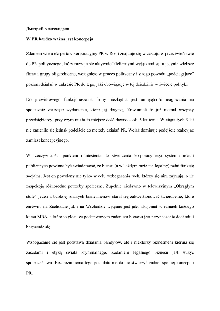 Дмитрий Александров W PR bardzo ważna jest koncepcja Zdaniem wielu ekspertów korporacyjny PR w Rosji znajduje się w zastoju w przeciwieństwie do PR politycznego, który rozwija się aktywnie.Nielicznymi wyjątkami są tu jedynie większe firmy i grupy oligarchiczne, wciągnięte w proces polityczny i z tego powodu „podciągające” poziom działań w zakresie PR do tego, jaki obowiązuje w tej dziedzinie w świecie polityki. Do prawidłowego funkcjonowania firmy niezbędna jest umiejętność reagowania na społecznie znaczące wydarzenia, które jej dotyczą. Zrozumieli to już niemal wszyscy przedsiębiorcy, przy czym miało to miejsce dość dawno – ok. 5 lat temu. W ciągu tych 5 lat nie zmieniło się jednak podejście do metody działań PR. Wciąż dominuje podejście reakcyjne zamiast koncepcyjnego. W rzeczywistości punktem odniesienia do stworzenia korporacyjnego systemu relacji publicznych powinna być świadomość, że biznes (a w każdym razie ten legalny) pełni funkcję socjalną. Jest on powołany nie tylko w celu wzbogacania tych, którzy się nim zajmują, o ile zaspokoją różnorodne potrzeby społeczne. Zupełnie niedawno w telewizyjnym „Okrągłym stole” jeden z bardziej znanych biznesmenów starał się zakwestionować twierdzenie, które zarówno na Zachodzie jak i na Wschodzie wpajane jest jako aksjomat w ramach każdego kursu MBA, a które to głosi, że podstawowym zadaniem biznesu jest przynoszenie dochodu i bogacenie się. Wzbogacanie się jest podstawą działania bandytów, ale i niektórzy biznesmeni kierują się zasadami i etyką świata kryminalnego. Zadaniem legalnego biznesu jest służyć społeczeństwu. Bez rozumienia tego postulatu nie da się stworzyć żadnej spójnej koncepcji PR. Punktem wyjścia właściwego PR jest uświadomienie sobie funkcji firmy w społeczeństwie. To jeden z ważniejszych aspektów korporacyjnej misji. Dlatego właściciele i menadżerowie wyższego szczebla powinni przeanalizować potrzeby, które zaspokaja firma, skonfrontować je ze społecznymi wartościami, kierunkami rozwoju społeczeństwa (kraju lub regionu) i z właśnie z tego punktu wyjścia tworzyć koncepcję działań PR. Politykę w obszarze PR powinni zdefiniować właśnie właściciele i menadżerowie wyższego szczebla, a nie specjaliści z działu PR lub zewnętrznej agencji PR. Profesjonaliści mogą pomóc w zakresie technik relacji społecznych, ale ideologia powinna zostać stworzona przez ludzi sprawujących funkcje decyzyjne. Nawiasem mówiąc, jeżeli ten warunek zostanie zachowany, to profesjonaliści PR nie będą mieli żadnych problemów z realizacją niezbędnych działań. Do aktywów firmy należy jej dobre imię, reputacja– z jednej strony w oczach całego społeczeństwa, z drugiej – klientów i kontrahentów firmy. Nad reputacją pracować należy systematycznie – temu celowi służą szczególne działania kierownictwa firmy. Działania te określa się mianem „kierowania reputacją”. Kierowanie reputacją ma dwa aspekty: szeroki – dotyczący społecznego otoczenia firmy, bezpośrednio nie związanego z nią w ekonomicznej działalności i wąski - dotyczący kręgu partnerów firmy. Pierwszy kierunek wiele firm lekceważy skupiając się jedynie na tym drugim. Tym samym pokazując swojemu wąskiemu otoczeniu, że jest jednodniowe. Nie bierze się pod uwagę wkładu firmy w gospodarkę kraju i rozwój społeczeństwa. Uważa się, że o szerokim społecznym image należy myśleć dopiero wtedy, gdy firma zaczyna działać w odpowiednim zakresie i wyrasta do „politycznego” rozmiaru. W rzeczywistości do tego czasu może być już za późno. Jak wiadomo, wiele firm z nader „nieczystym” początkiem, które zostały dużymi oligarchicznymi strukturami, wkłada ogromne środki w swoje „wybialenie”, nie odnosząc na tym polu widocznych sukcesów. Takie „wybielanie”, w zasadzie, nie może przynieść rezultatów w bardziej lub mniej otwartym społeczeństwie. Utrzymanie perspektywicznego rozwoju firmy jest jednym z najważniejszych zadań reputacyjnego kierowania PR. Z tego powodu firma powinna mieć plan działań strategicznych, w oparciu, o który buduje się plan społecznych stosunków oraz wypracowuje się warianty działań dla rozwoju i ochrony reputacji od różnego rodzaju niebezpieczeństw z uwzględnieniem wartości firmy. Stworzenie takiego planu należy do specjalistów w dziedzinie PR. Powinni oni przeanalizować, co sobą reprezentuje firma, jakie są jej obiektywnie mocne i słabe strony oraz zaproponować strategię wzmocnienia i zaakcentowania tych obiektywnie właściwych firmie zalet i kompensacji problemów, które istnieją w działalności organizacji. Plan taki powinien zawierać sugestie, jak nie krępując się, opowiadać o trudnościach, bo przecież właściwie nie ma nic idealnego. Eksperci uważają, że bardzo ważne jest by na początku wyjaśnić głębokie przyczyny jakiegoś negatywnego zdarzenia, by w dalszej perspektywie, w miarę rozwoju procesu, za każdym razem nie tłumaczyć się. Kierownictwo powinno udostępniać menadżerowi PR realistyczne prognozy rozwoju zdarzeń, aby był on gotów szybko i adekwatnie reagować na nie. To właśnie wiedza o tym, co się wydarzy pozwala formułować oczekiwania – jeden z ważniejszych środków działalności PR. Menadżer PR powinien poznać charakter szefa - co on sobą reprezentuje, do jakiego typu ludzi należy. Taka praca oczywiście wymaga określonych psychologicznych kwalifikacji. Tłumaczenie: Katarzyna Kłąb www.gudym.ru za www.propr.com.ua