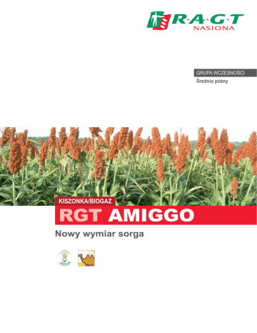 grupa wczesnoŚci średnio późny kiszonka/biogaz RGT amiggo Nowy wymiar sorga OGA Z BI kiszonka/biogaz profil odmiany RGT amiggo Nowy wymiar sorga Rejestracja: 2012 EU BI - Roślina wysoka, bardzo mocno ulistniona - Bardzo gruba, sztywna łodyga - Liście gęste i masywne OGA Z Morfologia - Bardzo wysoki potencjał plonowania - Dobry wigor początkowy - Masywne, bardzo duże rośliny - łatwość zbioru i zakiszania - Stabilność plonowania Kryteria agronomiczne Kryteria bezpieczeństwa - Brak wylegania Sorgo na kiszonkę. Doświadczenia RAGT Francja 2012 r. 165 RGT AMIGGO Plon ogólny suchej masy (dt ha) - Bardzo wysoka wydajność biogazu - Dobry wigor początkowy - Wysoka jakość paszowa - Zdrowa, sztywna łodyga - Potencjał plonu: 15-25 t/ha plonu suchej masy - średnia zawartość cukru: 8-10% 155 145 135 125 115 20 22 24 26 28 30 32 34 36 Zawartość suchej masy w plonie ogólnym (%) Średnia wzorca Pozostałe badane odmiany zgs Zalecana gęstość siewu (nasion/ha) Dobre stanowiska Słabe stanowiska 220-240 000 180-200 000 w w w . r a g t . p l RAGT Semences POLSKA Sp. z o.o. • ul. Sadowa 10A • 87-148 Łysomice • Tél. 566783207 • Tél/fax. 5667879 Wszyskie prezentowane dane techniczne zostały opracowane na podstawie wyników uzyskanych w oficjalnych badaniach COBORU oraz testów prowadzonych w sieci doświaczalnej RAGT Semences. Odzwierciedlają aktualny stan naszej wiedzy opartej na licznych, dokładnych badaniach i obserwacjach prowadzonych w wielu powtórzeniach i różnorodnych warunkach z uwzględnieniem trwałości poszczególnych gatunków. Prezentowane dane zmieniają się w zależności od warunków agroklimatycznych oraz stosowanej technologii uprawy. Wykorzystane zdjęcia pochodzą ze zbioru RAGT Semences..
