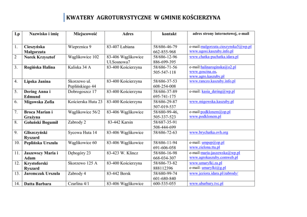 KWATERY AGROTURYSTYCZNE W GMINIE KOŚCIERZYNA Lp 1. Nazwisko i imię Miejscowość Adres kontakt 58/686-46-79 662-855-968 58/686-12-96 886-699-395 58/686-71-56 505-547-118 Wieprznica 9 83-407 Łubiana 2 Cieszyńska Małgorzata Norek Krzysztof Wąglikowice 102 3. Rogińska Halina Kaliska 34 A 83-406 Wąglikowice Ul.Sosnowa7 83-400 Kościerzyna 4. Lipska Janina 5. Dering Anna i Edmund Migowska Zofia Skorzewo ul. Peplińskiego 44 Dobrogoszcz 17 6. 7. 83-400 Kościerzyna 83-400 Kościerzyna Kościerska Huta 23 83-400 Kościerzyna Wąglikowice 56/2 83-406 Wąglikowice Zabrody 2 83-442 Karsin Gliszczyński Ryszard 10. Peplińska Urszula Sycowa Huta 14 83-406 Wąglikowice Wąglikowice 60 83-406 Wąglikowice 11. Jaszewscy Maria i Adam 12. Krystoforski Ryszard 13. Jaremczak Urszula Dębogóry 23 83-423 W. Klincz Skorzewo 125 A 83-400 Kościerzyna Zabrody 4 83-442 Borsk 14. Datta Barbara Czarlina 4/1 83-406 Wąglikowice 8. Broca Marian i Grażyna Gołuński Bogumił 9. 58/686-37-53 608-254-008 58/686-37-89 695-741-175 58/686-29-87 507-019-537 58/680-99-46, 505-337-523 58/687-35-91 508-444-699 58/686-72-63 58/686-11-94 691-606-058 58/686-16-98 668-034-307 58/686-73-82 888112396 58/680-99-74 601-680-840 600-535-055 adres strony internetowej, e-mail e-mail:[email protected] www.ugosi.kaszuby.info.pl www.chatka-puchatka.idara.pl e-mail:[email protected] www.goscina.eu, www.agro.kaszuby.pl www.ranczo.kaszuby.info.pl e-mail: [email protected] www.migowska.kaszuby.pl e-mail:[email protected] www.podklonem.pl www.brychatka.ovh.org e-mail: [email protected] www.zielona.ttu.pl e-mail:[email protected] www.agrokaszuby.comweb.pl www.umarylki.za.pl e-mail: [email protected] www.jeziora.idara.pl/zabrody/ www.ubarbary.tvc.pl KWATERY AGROTURYSTYCZNE W GMINIE KOŚCIERZYNA 15. Jaszewska Krystyna 16. Konkol Kazimierz Skoczkowo5 Rotembark 26 83-406 Wąglikowice 83-400 Kościerzyna 504-844-170 58/686-58-23 697529-054 17. Mroch Zbigniew Niedomowo 24 83-423 W. Klincz 512-479-164 18. Mańska Danuta Dobrogoszcz 19 b 83-400 Kościerzyna 19. Jakubowski Dorota Kościerska Huta 22 83-400 Kościerzyna 20. Seyda Marian Skorzewo 205 83-400 Kościerzyna 21. Grulkowski Wacław 83-406 Wąglikowice 22. Szczypior Danuta Czarlina Skoczkowo Sycowa Huta 3 23. Łangowska Maria Wdzydze 30 83-406 Wąglikowice 24. Rekowska Eryka Loryniec 3 83-406 Wąglikowice 58/686-26-02 605-119-683 58/686-58-50, 503-972-249 58/680-99-24 602-798-774 58/680-42-07 694-149-269 58/686-67-94 698-004-040 58/686-13-29, 660-941-211 58/686-10-21 25. Ziplińska Agata Lizaki 6 83-406 Wąglikowice 26. Rudnicka Anna Zielenin 5 27. Gańska Ewa Skorzewo 109A 83-422 Nowy Barkoczyn 83-400 Kościerzyna 28. Jażdżewska Magdalena 29. Kościelski Sebastian Szarlota 6 83-400 Kościerzyna Wąglikowice ul. Kościerska 61 83-406 Wąglikowice 83-406 Wąglikowice 58/686-70-97 692-632-861 604-974-201 604-340344 58/680-99-13 608-228-941 606-145-729 58/ 686-12-91 788037089 www.agroturystyka.kaszuby.org e-mail:[email protected] www.nakampie.kaszuby.info.pl, www.na-kaszuby.pl www.manska.kaszuby.info.pl e-mail: [email protected] www.kaszuby.gda.pl e-mail:[email protected] www.oto-wakacje.idara.pl e-mail: [email protected] www.wczasy.kaszuby.org.pl www.szczypiorki.kaszuby.info.pl e-mail [email protected] www.wdzydze.wczasy.com e-mail:[email protected] www.kaszuby-wda.pl.tl e-mail: [email protected] www.zielone-kaszuby.pl www.dworekzielenin.pl e-mail:[email protected] www.turystykadlaaktywnych.pl e-mail:[email protected] www.agata1.tvc.pl www.idara.pl KWATERY AGROTURYSTYCZNE W GMINIE KOŚCIERZYNA 30. Przytarska Mariola Nowa Kiszewa 42 83-430 Stara Kiszewa 693-451-146 31. Pniewski Adam Sycowa Huta 29 83-406 Wąglikowice 601-406-176 32. Czapiewska Jolanta Sarnowy 8A 83-423 W. Klincz 33. Jaszewscy Iwona i Piotr 34. Modrzejewski Andrzej 35. Hetmańska Irena Loryniec 18/1 83-406 Wąglikowice Kłobuczyno 57 83-315 Szymbark Kaliska Kościerskie 34 B Kłobuczyno 57A 83-400 Kościerzyna 83-315 Szymbark 507-197-694 58/686-26-28 58/686-10-35 605050091 58/686-73-48 605-746-516 609-392-997 58/686-29-93 691-752-322 37. Brzezińscy Mirosław i Ewa 38. Peplińska Joanna 39. Domian Arkadiusz Czarlina19 83-406 Wąglikowice 782-455-007 Loryniec 20 Nowa Kiszewa 20a 83-406 Wąglikowice 83-430 Stara Kiszewa 40. Grulkowska Maria 41. Hinc Maria Skoczkowo 4a Skorzewo 157 83-406 Wąglikowice 83-400 Kościerzyna 601-176-650 58/6870419, 667182388 692-288-097 58/68644-48 42 Dobrogoszcz 8C 83-423 Kościerzyna 609-786-260 83-406 Wąglikowice 44. Lipski Zbigniew Wąglikowice Spacerowa7 Dębogóry 7 58/686-12-96, 880-046-646 602-517-635 36. Toczek Agata Leszkowski Zygmunt 43. Norek Jakub 83-423 Wielki Klincz e-mail:[email protected] www.kaszubyagro.pl e-mail:[email protected] www.guzkowka.pl www.kaszuby.info.pl, www.na-kaszuby.info.pl www.podlipa.idara.pl www.stajniaklobuczyno.pl e-mail: [email protected] www.ihetmanska.republika.pl e-mail: [email protected] e-mail:[email protected], www.agroczrlina.pl e-mail:[email protected], www.gospodarstwo.domian.ns48.pl www.noclegi.kaszuby.org e-mail: [email protected] www.hincowka.kaszuby.info.pl e-mail:[email protected] e-mail:[email protected] www.norek.tvc.pl e-mail:[email protected] www.zbyszeklp.nocuj.com.pl 45. Czucha Danuta Szenajda 9 83-431 Stary Bukowiec 660-185-687