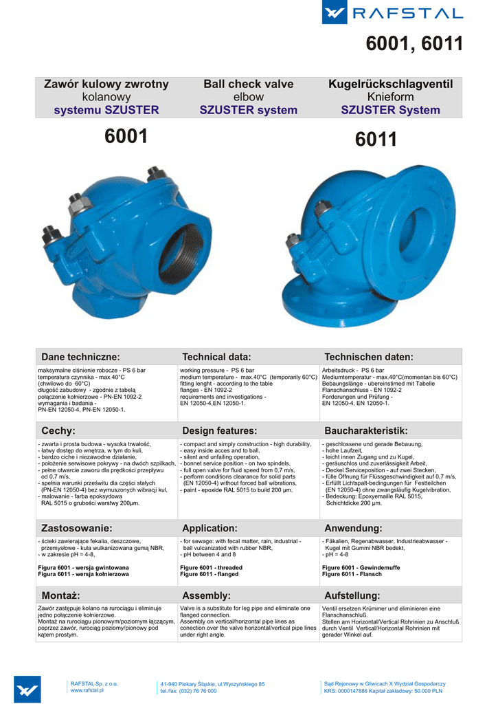 6001, 6011 Zawór kulowy zwrotny kolanowy systemu SZUSTER Ball check valve elbow SZUSTER system 6001 Kugelrückschlagventil Knieform SZUSTER System 6011 Dane techniczne: Technical data: maksymalne ciœnienie robocze - PS 6 bar temperatura czynnika - max.40°C (chwilowo do 60°C) d³ugoœæ zabudowy - zgodnie z tabel¹ po³¹czenie ko³nierzowe - PN-EN 1092-2 wymagania i badania PN-EN 12050-4, PN-EN 12050-1. working pressure - PS 6 bar medium temperature - max.40°C (temporarily 60°C) fitting lenght - according to the table flanges - EN 1092-2 requirements and investigations EN 12050-4,EN 12050-1. Cechy: Design features: - zwarta i prosta budowa - wysoka trwa³oœæ, - ³atwy dostêp do wnêtrza, w tym do kuli, - bardzo ciche i niezawodne dzia³anie, - po³o¿enie serwisowe pokrywy - na dwóch szpilkach, - pe³ne otwarcie zaworu dla prêdkoœci przep³ywu od 0,7 m/s, - spe³nia warunki przeœwitu dla czêœci sta³ych (PN-EN 12050-4) bez wymuszonych wibracji kul, - malowanie - farba epoksydowa Zastosowanie: - compact and simply construction - high durability, - easy inside acces and to ball, - silent and unfailing operation, - bonnet service position - on two spindels, - full open valve for fluid speed from 0,7 m/s, - perform conditions clearance for solid parts (EN 12050-4) without forced ball wibrations, Application: Technischen daten: Arbeitsdruck - PS 6 bar Mediumtemperatur - max.40°C(momentan bis 60°C) Bebaungslänge - ubereinstimed mit Tabelle Flanschanschluss - EN 1092-2 Forderungen und Prüfung EN 12050-4, EN 12050-1. Baucharakteristik: - geschlossene und gerade Bebauung, - hohe Laufzeit, - leicht innen Zugang und zu Kugel, - geräuschlos und zuverlässigkeit Arbeit, - Deckel Serviceposition - auf zwei Stecken, - fülle Öffnung für Flüssgeschwindigkeit auf 0,7 m/s, - Erfüllt Lichtspalt-bedingungen für Festteilchen (EN 12050-4) ohne zwangsläufig Kugelvibration, - Bedeckung: Epoxyemaille RAL 5015, Anwendung: - œcieki zawieraj¹ce fekalia, deszczowe, przemys³owe - kula wulkanizowana gum¹ NBR, - w zakresie pH = 4-8, - for sewage: with fecal matter, rain, industrial ball vulcanizated with rubber NBR, - pH between 4 and 8 - Fäkalien, Regenabwasser, Industrieabwasser Kugel mit Gummi NBR bedekt, - pH = 4-8 Figura 6001 - wersja gwintowana Figura 6011 - wersja ko³nierzowa Figure 6001 - threaded Figure 6011 - flanged Figure 6001 - Gewindemuffe Figure 6011 - Flansch Monta¿: Assembly: Zawór zastêpuje kolano na ruroci¹gu i eliminuje jedno po³¹czenie ko³nierzowe. Monta¿ na ruroci¹gu pionowym/poziomym ³¹cz¹cym, poprzez zawór, ruroci¹g poziomy/pionowy pod k¹tem prostym. Valve is a substitute for leg pipe and eliminate one flanged connection. Assembly on vertical/horizontal pipe lines as conection over the valve horizontal/vertical pipe lines under right angle. Aufstellung: Ventil ersetzen Krümmer und eliminieren eine Flanschanschluß. Stellen am Horizontal/Vertical Rohrinien zu Anschluß durch Ventil Vertical/Horizontal Rohrinien mit gerader Winkel auf. 1/2 6001-6011 / 2006-03-02 RAFSTAL Sp. z o.o. www.rafstal.pl 41-940 Piekary Śląskie, ul.Wyszyńskiego 85 tel./fax: (032) 76 76 000 Sąd Rejonowy w Gliwicach X Wydział Gospodarczy KRS: 0000147886 Kapitał zakładowy: 50.000 PLN 6001, 6011 Zamawianie /Order procedure /Bestellung: TYP(E); DN; PS; Przyk³ad /Example /Beispiel: 6001; DN150; 6 bar; [bar] 32 6 80 40 6 100 50 6 100 50 6 100 165 102 125 18x4 65 6 165 185 122 145 18x4 80 6 165 200 138 160 18x8 1,7 16,7 100 6 200 220 158 180 18x8 1,6 24,4 125 6 250 250 188 210 18x8 150 6 300 285 212 240 22x8 200 6 400 340 268 295 22x8(12)* 250 6 500 395 320 350 22x12 300 6 600 445 370 400 22x12 6011 6001 [mm] z* - D d K l x S Gw ["] [kg] 55 1 1/4 1,9 60 1 1/2 2,4 75 2 [mm] No. Masa Weight Gewicht PN L/H n z* TYP DN 2,4 4,1 2,4 8,4 wspó³czynnik oporów miejscowych w zakresie zalecanych prêdkoœci przep³ywu przez zawór od 0,8 m/s do 2,3 m/s UWAGA: wspólczynnik oporów miejscowych jest sta³y równie¿ dla wy¿szych prêdkoœci przep³ywu Materia³, Material 1 ¯eliwo szare EN-GJL-250 PN-EN 1561:2000 2 Pokrywa, Bonnet, Decket ¯eliwo szare EN-GJL-250 PN-EN 1561:2000 3 Kula, Ball, Kugel Guma, Rubber, Gummi NBR 4 Uszczelka, Gasket, Flachdichtung Guma, Rubber, Gummi NBR 5 Œruba, Screw, Schraube Stal, Steel, Stahl - A2 PN-90/M-82131 6 Nakrêtka, Nut, Mutter Stal, Steel, Stahl - A2 PN-EN ISO 4032: 2004 7 Podk³adka, Washer, Unterlage Stal, Steel, Stahl - A2 PN-EN ISO 7091: 2002 15,8 60 Czêœæ, Part, Teil Korpus, Body, Gehäuse Ze wzglêdu na ci¹g³y rozwój firmy zastrzegamy sobie prawo do modyfikacji produkowanych wyrobów. 2/2 Fabryka Armatur JAFAR SA ul. Kadyiego 12; 38-200 Jas³o www.jafar.com.pl RAFSTAL Sp. z o.o. www.rafstal.pl telefon: +48 13 442 96 11 +48 13 442 90 41 fax: +48 13 442 96 12 [email protected] [email protected] [email protected] 41-940 Piekary Śląskie, ul.Wyszyńskiego 85 tel./fax: (032) 76 76 000 Sąd Rejonowy w Gliwicach X Wydział Gospodarczy KRS: 0000147886 Kapitał zakładowy: 50.000 PLN