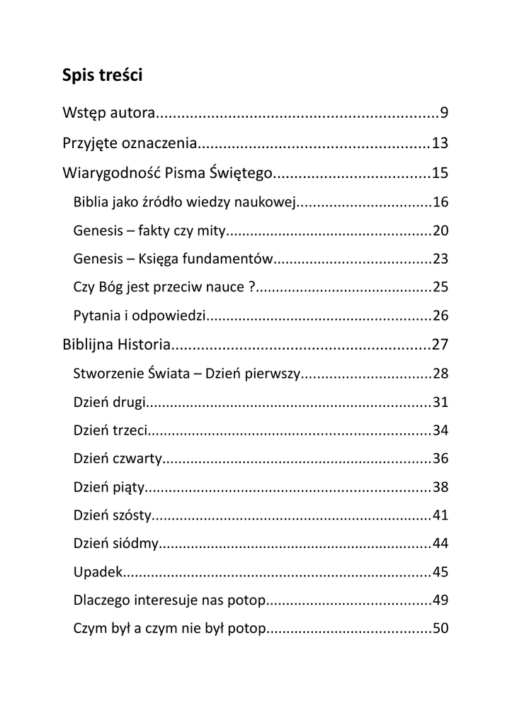Spis treści Wstęp autora..................................................................9 Przyjęte oznaczenia......................................................13 Wiarygodność Pisma Świętego.....................................15 Biblia jako źródło wiedzy naukowej.................................16 Genesis – fakty czy mity...................................................20 Genesis – Księga fundamentów.......................................23 Czy Bóg jest przeciw nauce ?............................................25 Pytania i odpowiedzi........................................................26 Biblijna Historia.............................................................27 Stworzenie Świata – Dzień pierwszy................................28 Dzień drugi.......................................................................31 Dzień trzeci......................................................................34 Dzień czwarty...................................................................36 Dzień piąty.......................................................................38 Dzień szósty......................................................................41 Dzień siódmy....................................................................44 Upadek.............................................................................45 Dlaczego interesuje nas potop.........................................49 Czym był a czym nie był potop.........................................50 Skąd tyle wody ?..............................................................51 Gdzie się podziały szczątki roślin i zwierząt ?...................54 Arka..................................................................................56 Świat po potopie..............................................................58 Upadek, odkupienie i nadzieja którą żyjemy....................62 Pytania i odpowiedzi........................................................63 Debata...........................................................................67 Ateistyczna alternatywa...................................................68 Teoria ewolucji.................................................................70 Pierwotna zupa................................................................75 Białko...............................................................................79 DNA..................................................................................81 Nieredukowalna złożoność...............................................82 Informacja........................................................................84 Inteligentny projektant....................................................87 Mutacje............................................................................88 Różnorodność świata istot żywych...................................91 Algorytmy genetyczne......................................................92 Zasada antropiczna..........................................................94 Zasada entropii................................................................96 Góra Świętej Heleny.........................................................97 Fakty, hipoteza a teoria....................................................99 Dialog – trochę obiektywizmu.......................................101 Pytania i odpowiedzi......................................................103 Konsekwencje społeczne ewolucjonizmu..................109 Ateizm............................................................................110 Relatywizm.....................................................................111 Typowe kompromisy......................................................112 Konsekwencje dla teologii chrześcijańskiej....................117 Dominujące zwierzę: człowiek.......................................121 Wypaczenie seksualności człowieka...............................122 Homoseksualizm............................................................123 Eugenika.........................................................................124 Faszyzm..........................................................................125 Pytania i odpowiedzi......................................................126 Podsumowanie...........................................................129 O co w tym wszystkim chodzi ?......................................130 Mity o kreacjonizmie......................................................131 A co właściwie z tymi dinozaurami ?..............................135 Dodatki.......................................................................139 Czy wiara w Boże Stworzenie jest niezbędna do zbawienia ?....................................................................140 Jak zwiastować ?............................................................141 Jak rodzic ma rozmawiać o tym z dziećmi ?...................144 Zawodowy naukowiec a kreacjonizm.............................146 Bibliografia..................................................................147 Książki............................................................................147 Filmy...............................................................................149 Witryny internetowe