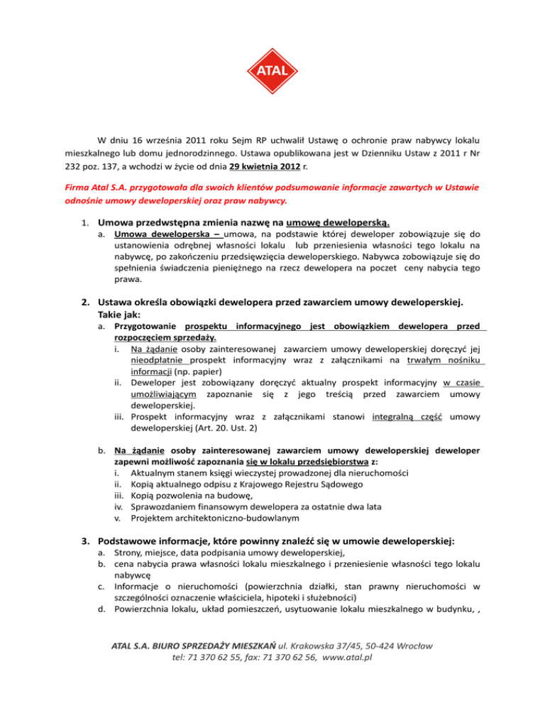W dniu 16 września 2011 roku Sejm RP uchwalił Ustawę o ochronie praw nabywcy lokalu mieszkalnego lub domu jednorodzinnego. Ustawa opublikowana jest w Dzienniku Ustaw z 2011 r Nr 232 poz. 137, a wchodzi w życie od dnia 29 kwietnia 2012 r. Firma Atal S.A. przygotowała dla swoich klientów podsumowanie informacje zawartych w Ustawie odnośnie umowy deweloperskiej oraz praw nabywcy. 1. Umowa przedwstępna zmienia nazwę na umowę deweloperską. a. Umowa deweloperska – umowa, na podstawie której deweloper zobowiązuje się do ustanowienia odrębnej własności lokalu lub przeniesienia własności tego lokalu na nabywcę, po zakończeniu przedsięwzięcia deweloperskiego. Nabywca zobowiązuje się do spełnienia świadczenia pieniężnego na rzecz dewelopera na poczet ceny nabycia tego prawa. 2. Ustawa określa obowiązki dewelopera przed zawarciem umowy deweloperskiej. Takie jak: a. Przygotowanie prospektu informacyjnego jest obowiązkiem dewelopera przed rozpoczęciem sprzedaży. i. Na żądanie osoby zainteresowanej zawarciem umowy deweloperskiej doręczyć jej nieodpłatnie prospekt informacyjny wraz z załącznikami na trwałym nośniku informacji (np. papier) ii. Deweloper jest zobowiązany doręczyć aktualny prospekt informacyjny w czasie umożliwiającym zapoznanie się z jego treścią przed zawarciem umowy deweloperskiej. iii. Prospekt informacyjny wraz z załącznikami stanowi integralną część umowy deweloperskiej (Art. 20. Ust. 2) b. Na żądanie osoby zainteresowanej zawarciem umowy deweloperskiej deweloper zapewni możliwość zapoznania się w lokalu przedsiębiorstwa z: i. Aktualnym stanem księgi wieczystej prowadzonej dla nieruchomości ii. Kopią aktualnego odpisu z Krajowego Rejestru Sądowego iii. Kopią pozwolenia na budowę, iv. Sprawozdaniem finansowym dewelopera za ostatnie dwa lata v. Projektem architektoniczno-budowlanym 3. Podstawowe informacje, które powinny znaleźć się w umowie deweloperskiej: a. Strony, miejsce, data podpisania umowy deweloperskiej, b. cena nabycia prawa własności lokalu mieszkalnego i przeniesienie własności tego lokalu nabywcę c. Informacje o nieruchomości (powierzchnia działki, stan prawny nieruchomości w szczególności oznaczenie właściciela, hipoteki i służebności) d. Powierzchnia lokalu, układ pomieszczeń, usytuowanie lokalu mieszkalnego w budynku, , ATAL S.A. BIURO SPRZEDAŻY MIESZKAŃ ul. Krakowska 37/45, 50-424 Wrocław tel: 71 370 62 55, fax: 71 370 62 56, www.atal.pl e. f. g. h. i. j. k. l. m. opis wykończenia, Harmonogram płatności określający wysokości i terminy spełnienia świadczeń pieniężnych przez nabywcę na rzecz dewelopera Informacje o pozwoleniu na budowę (tj. numer pozwolenia, informacja czy jest prawomocne czy zaskarżone, oznaczenie organu wydającego.), Warunki odstąpienia od umowy w tym warunki zwrotu środków pieniężnych wpłacanych przez nabywcę Kary i odsetki i. Wysokość odsetek zastrzeżonych na rzecz dewelopera , nie może przewyższać kar umownych zastrzeżonych na rzecz nabywcy (Art. 25) Sposób pomiaru powierzchni lokalu Oświadczenie nabywcy o odbiorze i zapoznaniem się z prospektem informacyjnym wraz z załącznikami przed zawarciem umowy deweloperskiej. Termin i sposób, w jaki deweloper zawiadomi nabywcę o odbiorze lokalu mieszkalnego Informacje o zgodzie banku na bezobciążeniowe wyodrębnienie lokalu mieszkalnego i przeniesienia jego własności na nabywcę po wpłacie pełnej ceny (jeżeli takie obciążenie istnieje) Określenie terminów i. Wyodrębnienie lokalu mieszkalnego i przeniesienie własności lokalu na nabywcę ii. Rozpoczęcia oraz zakończenia prac budowlanych 4. Dodatkowe informacje o umowie deweloperskiej: a. Obowiązek zawierania umowy w formie aktu notarialnego b. Wszelkie koszty czynności notarialnych, w tym koszt sporządzenia aktu notarialnego, sporządzenie wypisów aktu notarialnego oraz koszty sądowe ponoszą nabywca i deweloper (50%/50%) c. Umowa deweloperska stanowi podstawę wpisu roszczeń do księgi wieczystej do księgi wieczystej roszczeń, takich jak: roszczenie o wybudowanie budynku, o wyodrębnienie lokalu mieszkalnego i przeniesienie własności tego lokalu na nabywcę. d. Odbiór lokalu mieszkalnego może nastąpić po uzyskania pozwolenia na użytkowanie. e. Termin usunięcia usterek przez dewelopera wpisanym do protokołu odbioru to 30 dni ( przedłużenie terminu wymaga uzasadnienia ) 5. Odstąpienie od umowy deweloperskiej. a. Jeżeli umowa deweloperska nie zawiera wszystkich wymaganych informacji (Art. 22) lub informacje są błędne (do 30 dni od zawarcia umowy), b. Jeżeli deweloper nie doręczy prospektu informacyjnego lub informacje w nim zawarte są błędne (do 30 dni od zawarcia umowy), c. W przypadku nie przeniesienia na nabywcę prawa własności w terminie określonym w umowie deweloperskiej (po upływie 120 dniowego terminu wyznaczonego osobnym wezwaniem). d. Deweloper może odstąpić w przypadku nie spełnienia przez nabywcę świadczenia ATAL S.A. BIURO SPRZEDAŻY MIESZKAŃ ul. Krakowska 37/45, 50-424 Wrocław tel: 71 370 62 55, fax: 71 370 62 56, www.atal.pl pieniężnego w terminie określonej w umowie (po wcześniejszym wezwaniu do zapłaty z terminem 30 dni) e. Deweloper może odstąpić w przypadku niestawienia się przez nabywcę do odbioru lokalu lub podpisania aktu notarialnego. (po dwukrotnym wezwaniu w odstępie 60 dni) 6. Rachunki powiernicze a. Deweloper zapewnia nabywcom co najmniej jeden z następujących środków ochrony (Art. 4) i. Zamknięty mieszkaniowy rachunek powierniczy ii. Otwarty mieszkaniowy rachunek powierniczy i gwarancję ubezpieczeniową iii. Otwarty mieszkaniowy rachunek powierniczy i gwarancję bankową iv. Otwarty mieszkaniowy rachunek powierniczy b. Koszty związane z rachunkami powierniczymi ponosi deweloper c. Przepis art. 4 ustawy stosuje się do przedsięwzięć deweloperskich, w odniesieniu do których rozpoczęcie sprzedaży nastąpiło po dniu wejścia w 