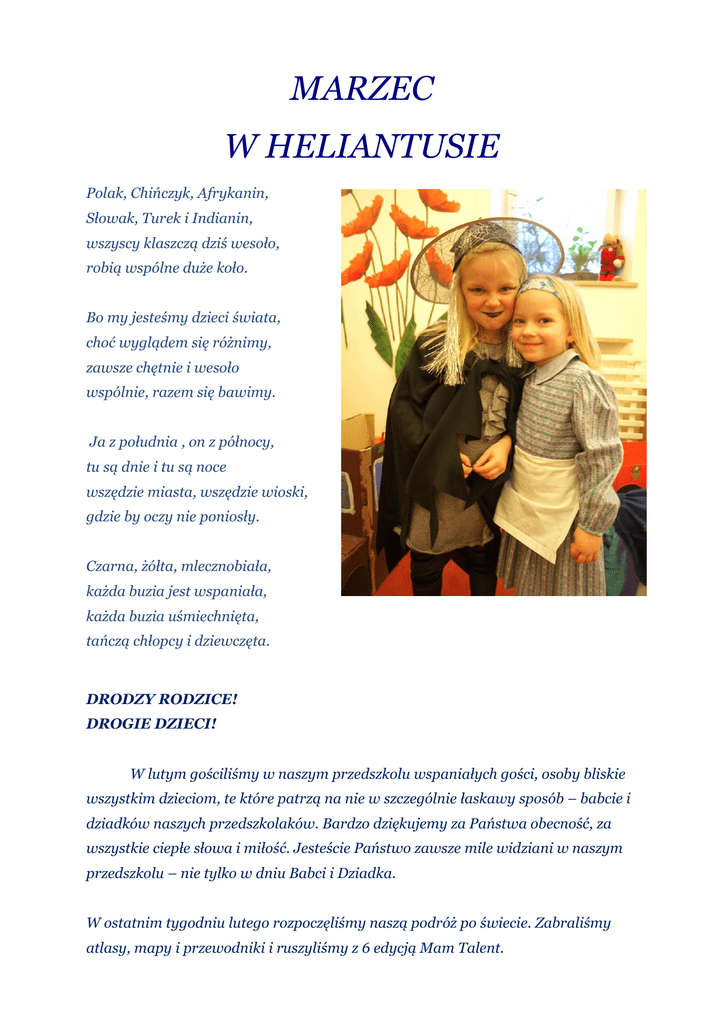 MARZEC W HELIANTUSIE Polak, Chińczyk, Afrykanin, Słowak, Turek i Indianin, wszyscy klaszczą dziś wesoło, robią wspólne duże koło. Bo my jesteśmy dzieci świata, choć wyglądem się różnimy, zawsze chętnie i wesoło wspólnie, razem się bawimy. Ja z południa , on z północy, tu są dnie i tu są noce wszędzie miasta, wszędzie wioski, gdzie by oczy nie poniosły. Czarna, żółta, mlecznobiała, każda buzia jest wspaniała, każda buzia uśmiechnięta, tańczą chłopcy i dziewczęta. DRODZY RODZICE! DROGIE DZIECI! W lutym gościliśmy w naszym przedszkolu wspaniałych gości, osoby bliskie wszystkim dzieciom, te które patrzą na nie w szczególnie łaskawy sposób – babcie i dziadków naszych przedszkolaków. Bardzo dziękujemy za Państwa obecność, za wszystkie ciepłe słowa i miłość. Jesteście Państwo zawsze mile widziani w naszym przedszkolu – nie tylko w dniu Babci i Dziadka. W ostatnim tygodniu lutego rozpoczęliśmy naszą podróż po świecie. Zabraliśmy atlasy, mapy i przewodniki i ruszyliśmy z 6 edycją Mam Talent. W tym roku wraz z dziećmi będziemy przemierzać kulę ziemską. Przez cały czas trwania programu poznawać będziemy wybrane kraje z różnych kontynentów ucząc się historii, zabytków, kultury, obyczajów, muzyki, kuchni a nawet języka! Warto dodać, że będziemy wymieniać się zdobytymi doświadczeniami w obrębach grup, co będzie sporym urozmaiceniem i szansą na poszerzenie wiedzy i rozbudzenie ciekawości. Dzieci dowiedzą się również jak żyją ich rówieśnicy w odległych miejscach. Czy dzieci różnią się od siebie, jakie mają zainteresowania, zabawy, czy są takie jak my? Tytuł heliantusowego Mam Talent brzmi: "Przygody Małego Globtrotera". W ramach tego programu przede wszystkim uczyć bedziemy naszych przedszkolaków szacunku i życzliwości do różnych ludzi, poczucia akceptacji i wrażliwości na piękno świata. W podróż po świecie zapraszają: Grupa 1 – Biedronki – zabiorą nas w podróż do kraju 30 razy większego od Polski, tj. do Stanów Zjednoczonych. Niezwykle różnorodna kultura amerykańska pozwala na to, aby od gwiazdy Hollywood zamienić się w mieszkańca słonecznego Texasu, czyli stać się prawdziwym cowboyem! Nie możemy zapomnieć, że USA to nie tylko słoneczna California, ale też mroźna Alaska. Trudno więc przewidzieć jakie przygody na nas czekają? Grupa 2 – Zajączki wybiorą się w podróż do Chin. Mur chiński, sztuki walki zapoczątkowane przez mnichów klasztoru Shaolin, kultura picia herbaty, barwnych strojów, legendarnych smoków, kaligrafia, czy kuchnia chińska – to tylko niektóre z możliwych atrakcji, którymi będą mogły zajmować się dzieci naszego przedszkola. Grupa 3 – Ośmiorniczki przeniosą się nad rzekę Nil, aby dowiedzieć się czegoś więcej na temat pięknego Egiptu. Poznawać będą ciekawą historię tego kraju, malowidła ścienne, faraonów, piramidy, sarkofagi, klimat czy muzykę. Egipt to również przepiękne rafy koralowe bogate w różnorodne gatunki ryb i morskich stworzeń. Możliwości wyboru jest naprawdę dużo! Wraz z Foczkami z 4 Grupy udamy się nad Morze Karaibskie do słonecznej Jamajki. Przez cały okres trwania Mam Talent będziemy mogli poczuć klimat tej wyspy śpiewając i tańcząc w rytm muzyki reggae, poznając flore i faune czy mało znane zwyczaje. Z kolei Delfiny z 5 Grupy popłyną do Chorwacji! Okazuje się, że ten piękny kraj to nie tylko plaża i słońce, ale również niezwykle ciekawa kultura i kuchnia. Dzieci poznawać będą wiele zabytków. Warto przy tym dodać, że aż osiem obiektów z Chorwacji wpisanych jest na listę światowego dziedzictwa UNESCO. Prawdą jest, że Delfiny lubią nowe wyzwania, dowodem na to jest fakt, że już zaczeli poznawać pierwsze słówka i zwroty w języku chorwackim! Grupa 6 – Tygrysy – niestraszne im lwy, gepardy, kochają przygody dlatego też zadecydowali, że wybiorą się w podróż do Afryki a Kenia będzie państwem, któremu poświęcą swoją uwagę. Sam motyw i wystrój sali mobilizuje do tego, aby o Kenii dowiedzieć się jak najwięcej. Spotkania z różnymi plemionami, dzikimi zwierzętami, podróż przez stepy, sawanny, półpustynie, ale też wyprawa przez wiecznie zielone lasy to wszystko czeka Tygrysy! Prosimy rodziców o aktywne włączenie się w nasz projekt. Każda aktywność dzieci zostanie zauważona. Prosimy więc o przynoszenie zdjęć, informacji, ciekawostek i pamiątkek z podróży. Przygody Małego Globtrotera zakończymy prezentacjami dzieci. W tygodniu od 16-19.03 podziwiać będziemy na scenie Heliantusa dzieci ze wszystkich grup. Jesteśmy bardzo ciekawi efektów ich pracy. Program Mam Talent uwieńczy wileka gala! Podczes gościnnego występu będziemy mieli okazję podziwiać nieco starszych naszych podopiecznych. Wileka gala zaplanowana jest w szkole Heliantus. Tu zostaną rozdane nagrody, dyplomy i gratulacje. 2015-03-23 Otwarcie galerii wielkanocnych pisanek. Zachęcamy Państwa do wykonywania wraz z dziećmi kolorowych jajek (wyłącznie na wydmuszkach). Pisanki można wykonać dowolną techniką, wszystkie arcydzieła podziwiać będziemy na sepecjalnej wystawie. Od 2015-03-23 Zapraszmy również na warsztaty wielkanocne. Podczas wspólnego popołudnia wykonywać będziemy różne ozdoby świąteczne, koszyczki wielkanocne czy kwiaty z bibuły, które potem ozdobią nasze świąteczne stoły. 2015-03-27 Wycieczka dla gr. 2,3,4 do Teatru Lalka na spektakl pt.“Panna Kreseczka“. Śniadanie dla tych grup zaplanowaliśmy na g. 8.15. Wyjazd do teatru jest o g. 9.00. Prosimy rodziców o podpisywanie zgody na udział dziecka w wycieczce. 2015-03-30 Śniadanie Wielkanocne. Podczas wspólnego posiłku opowiemy dzieciom o tradycji świąt wielkanocnych. Przy odświętnie udekorowanych stołach wytłumaczymy dzieciom znaczenie i symbolikę koszyczka wielkanocnego. Prosimy, aby tego dnia dzieci ubrane były odświętnie. z